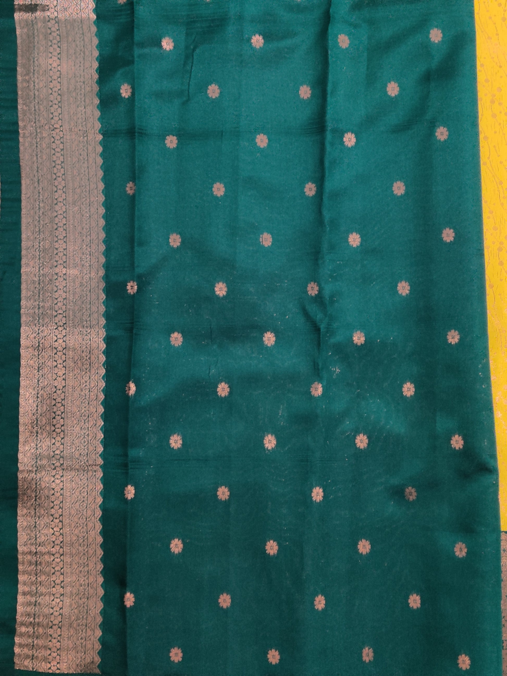 Discover the timeless elegance of our Semi Banarasi saree in sunny yellow. Adorned with intricate copper zari woven throughout, it boasts a striking contrast green border and zari pallu. Embrace traditional Indian craftsmanship and add a touch of luxury to your wardrobe.