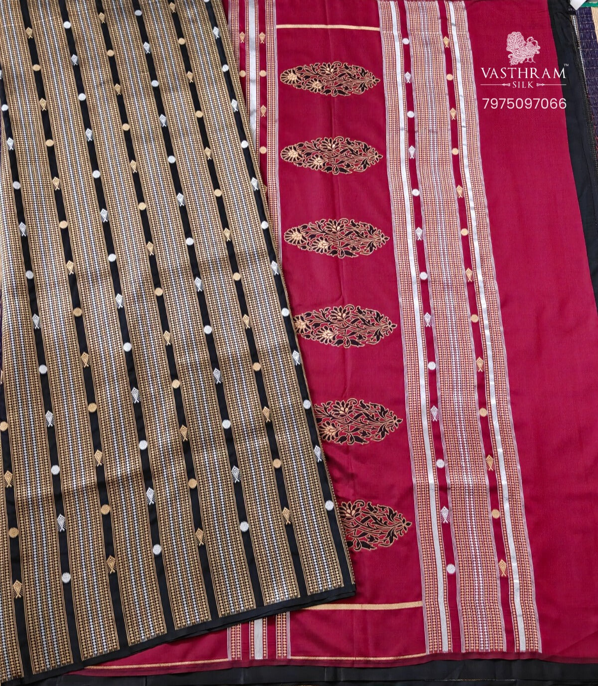 Black Semi-Katan Banarasi Saree with Zari Butta This elegant black semi-katan Banarasi saree showcases the timeless craftsmanship of Varanasi's finest weavers. The fabric features delicate partly zari butta scattered throughout, creating a sophisticated all-over pattern that catches light beautifully. The saree is elevated by a striking contrast magenta zari pallu, adding a bold contemporary touch to the traditional design. Paired with a plain blouse, this piece offers versatility for both formal occasions and festive celebrations. The semi-katan weave ensures a graceful drape while maintaining the durability Banarasi sarees are renowned for.
