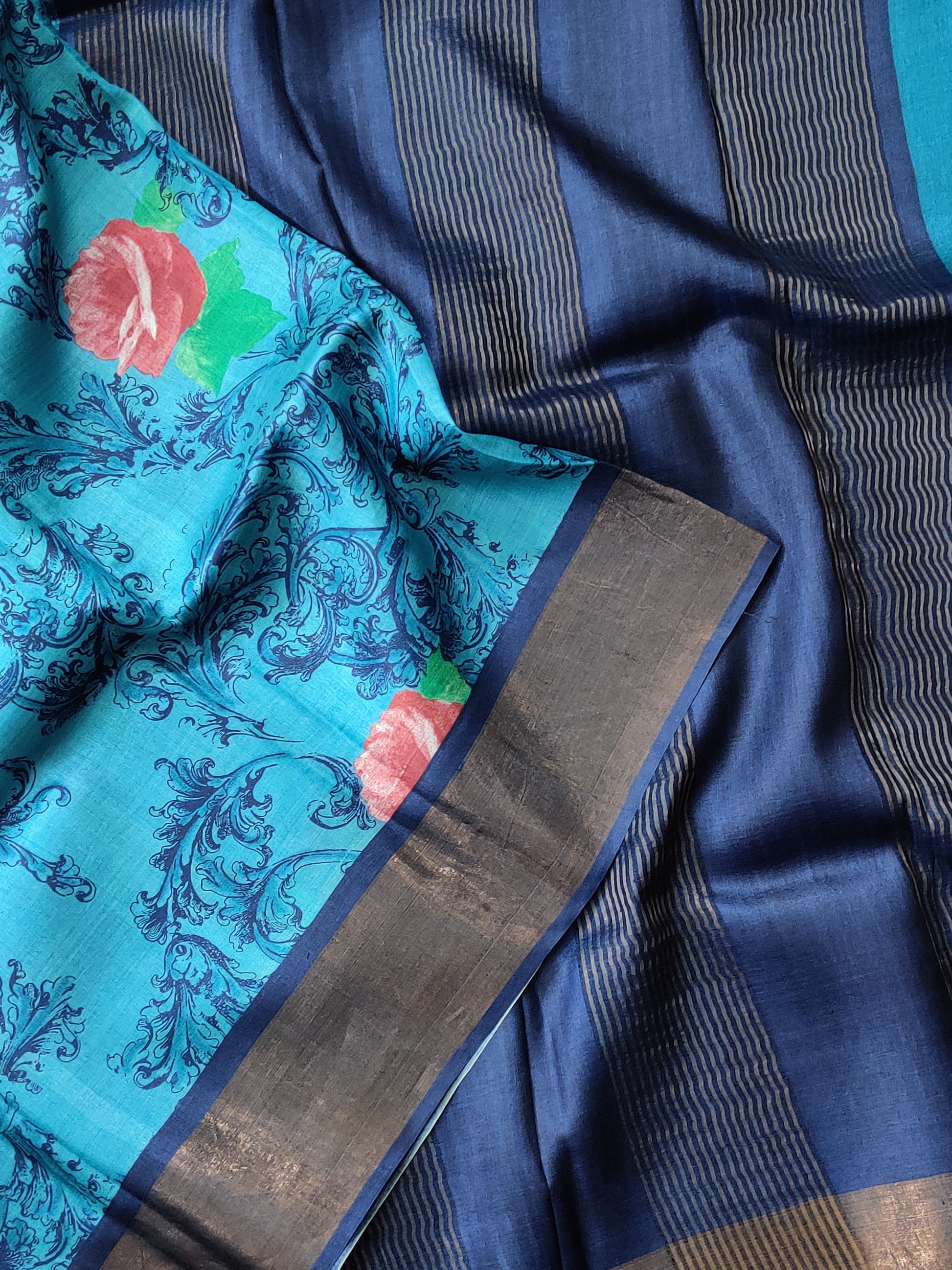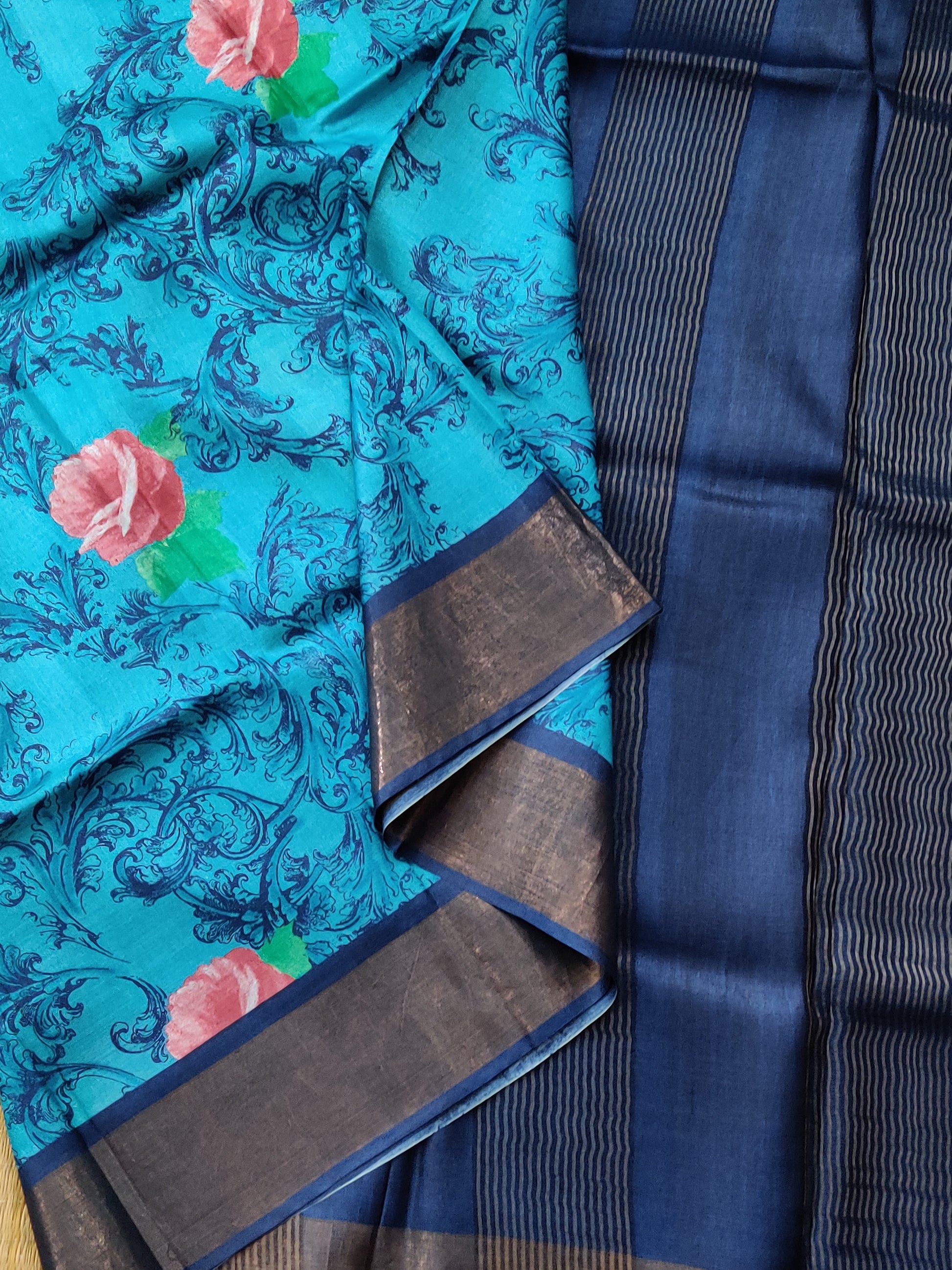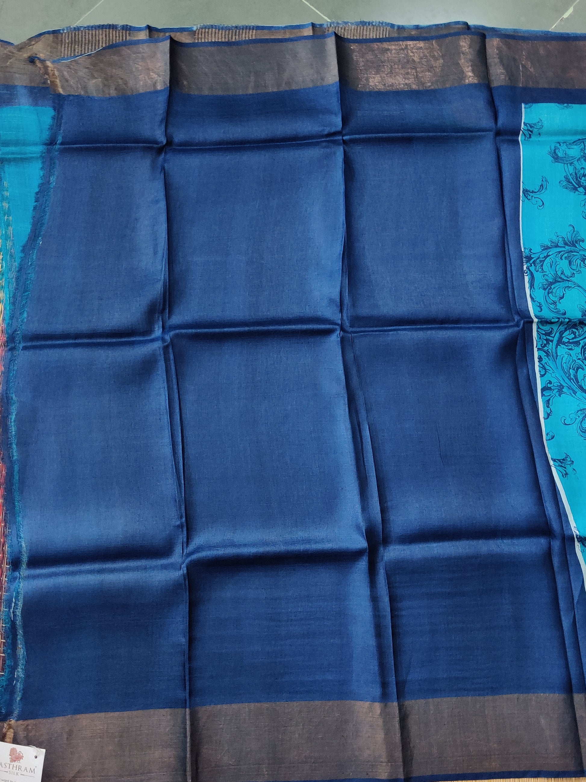 Elevate your ethnic wardrobe with this striking blue tussar silk saree, featuring intricate screen-printed motifs that cascade across the entire fabric. The lustrous tussar silk drapes beautifully, offering both comfort and sophistication for any occasion. A contrasting navy blue zari pallu adds a touch of opulence and traditional elegance, creating a stunning visual focal point. The accompanying plain blouse provides versatility, allowing you to style the saree with ease. Perfect for festive gatherings, celebrations, or everyday wear, this saree combines contemporary design with timeless silk craftsmanship.