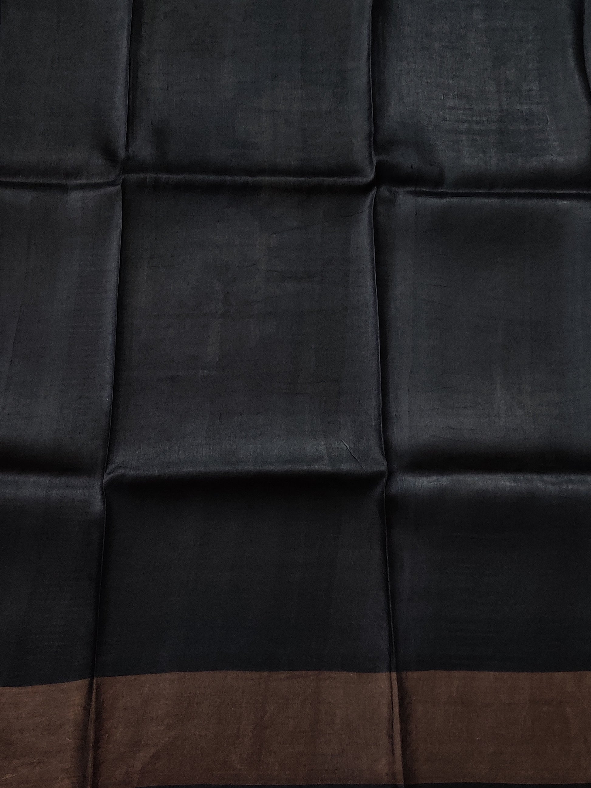 Elevate your ethnic wardrobe with this striking blue tussar silk saree, a masterpiece of traditional craftsmanship. The entire fabric showcases an intricate screen-printed design that adds contemporary flair to classic elegance. The saree is finished with a sophisticated black zari border and matching zari pallu, creating a bold contrast that enhances its visual appeal. The natural texture of tussar silk drapes beautifully, offering comfort and breathability for all-day wear. Paired with a plain blouse, this versatile piece works seamlessly for festive occasions, celebrations, or formal gatherings. Perfect for those who appreciate refined simplicity with artistic detailing.