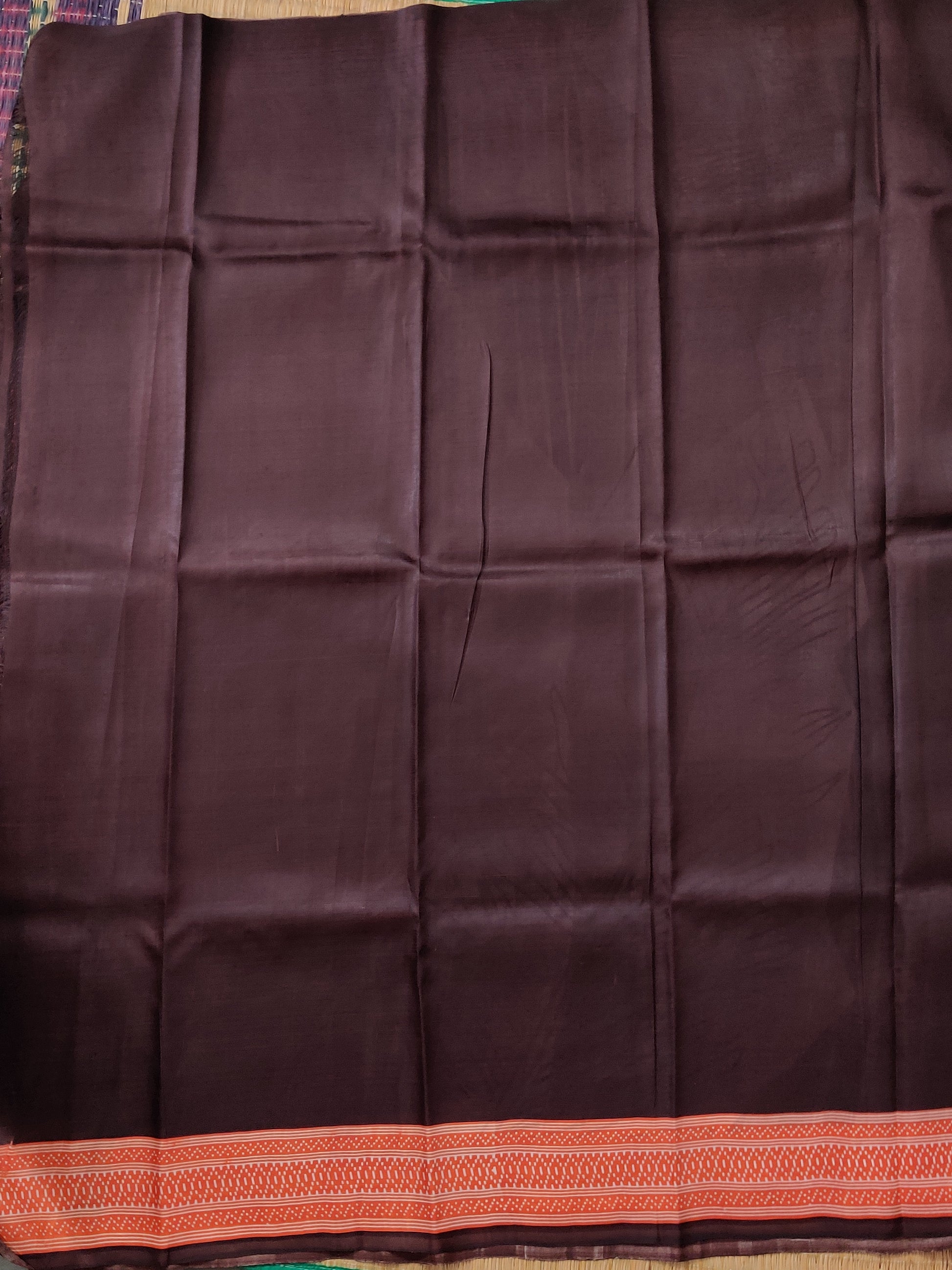 Elevate your ethnic wardrobe with this exquisite dark brown Murshidabad silk saree, a masterpiece of traditional craftsmanship. The lustrous silk fabric drapes beautifully, while intricate screen-printed motifs adorn the entire length, creating visual depth and sophistication. The striking contrast orange zari border frames the saree elegantly, and the ornate zari pallu serves as a stunning focal point. Paired with a plain blouse, this versatile piece transitions seamlessly from festive occasions to cultural celebrations. Perfect for those who appreciate refined elegance and authentic silk heritage.