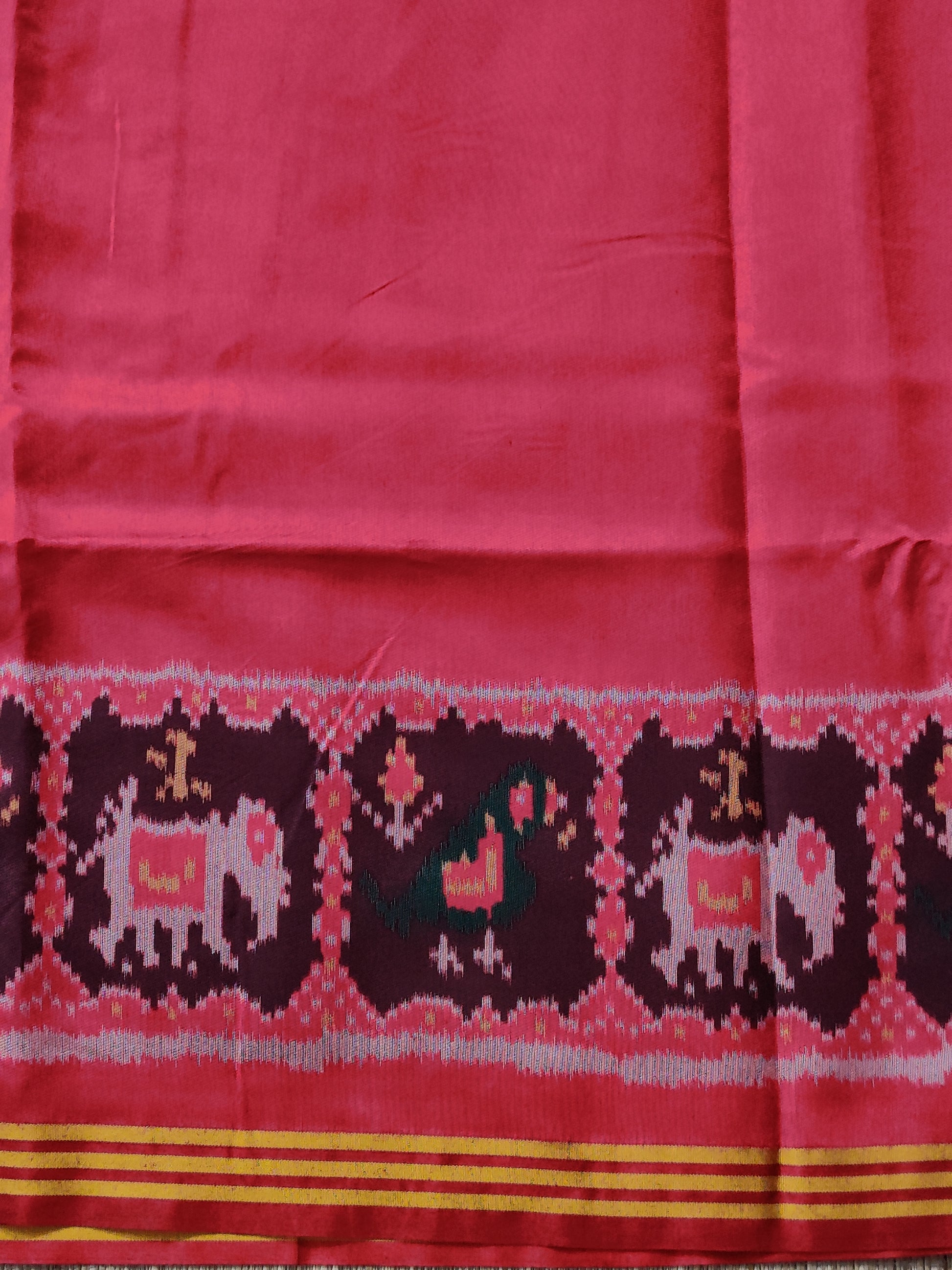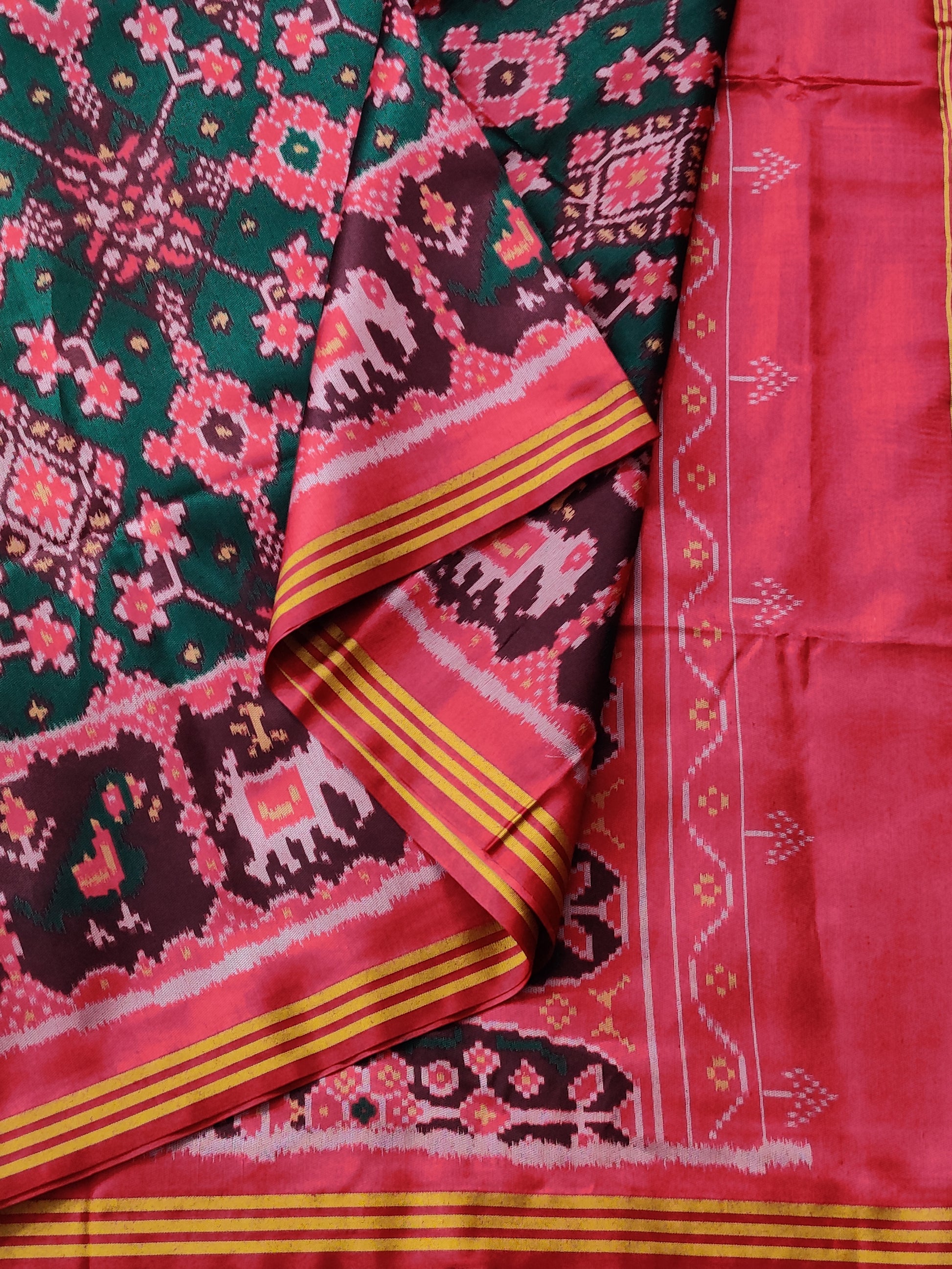 This semi Patola saree features traditional ikkat weaving in a vibrant green hue throughout the fabric, showcasing intricate craftsmanship. The contrasting maroon and red pallu adds a striking visual appeal, perfectly complemented by a plain blouse to balance the ensemble. Ideal for those who appreciate authentic handwoven artistry with a refined, elegant look.