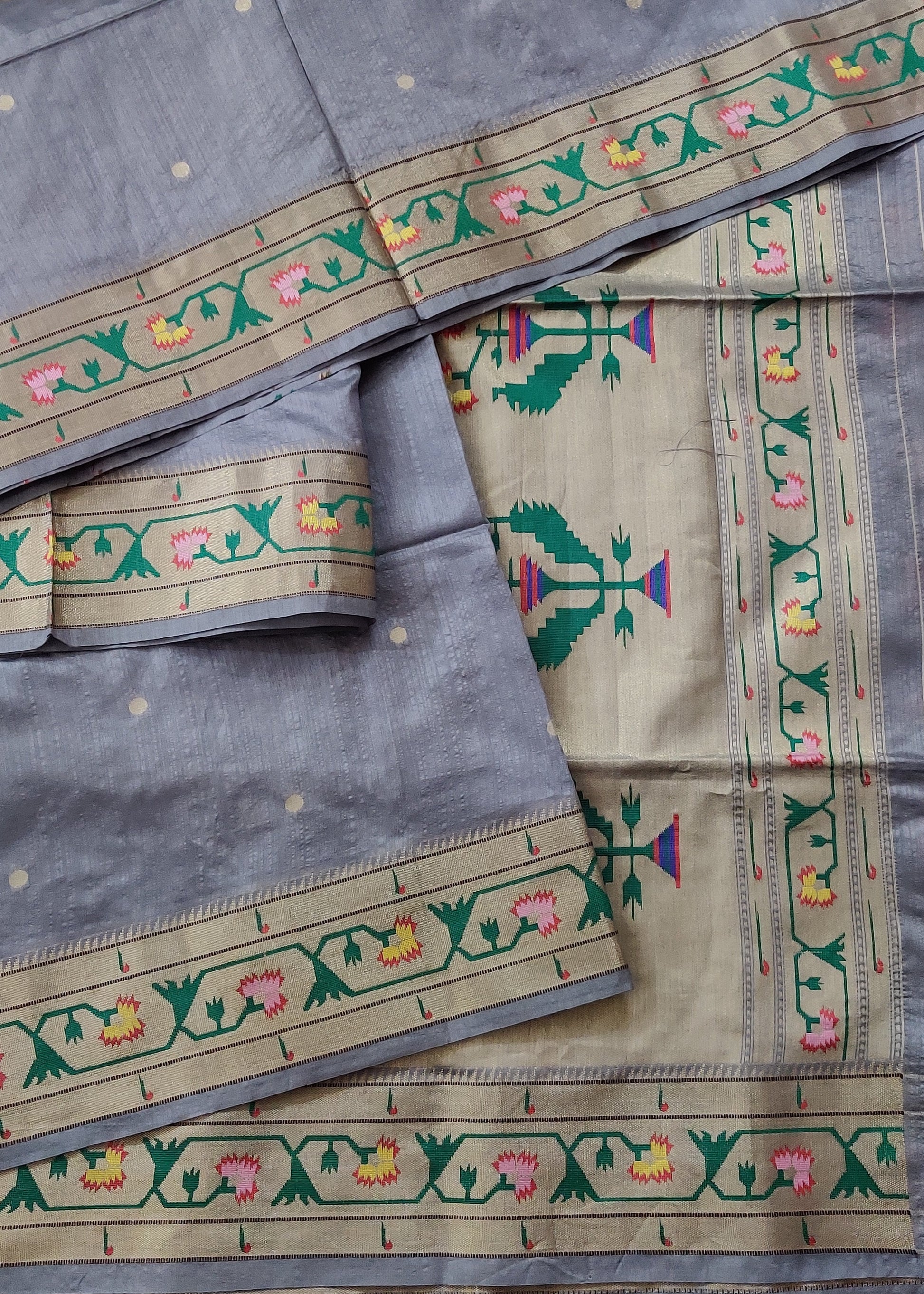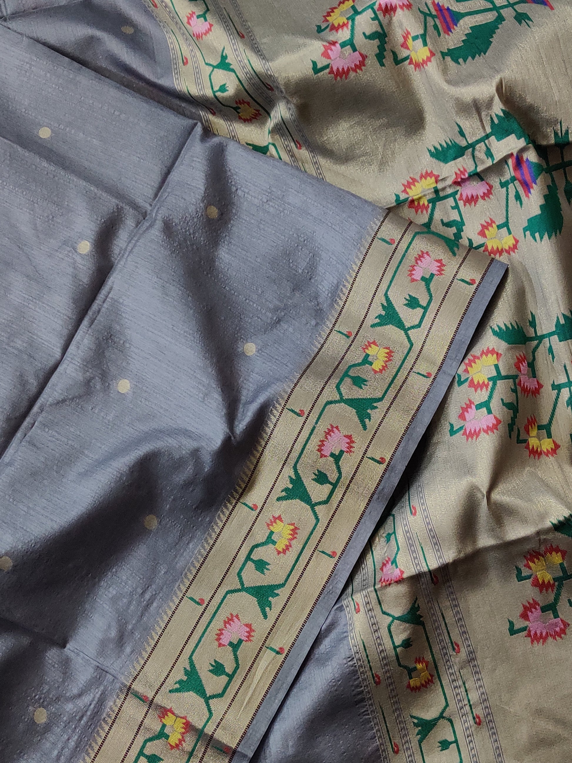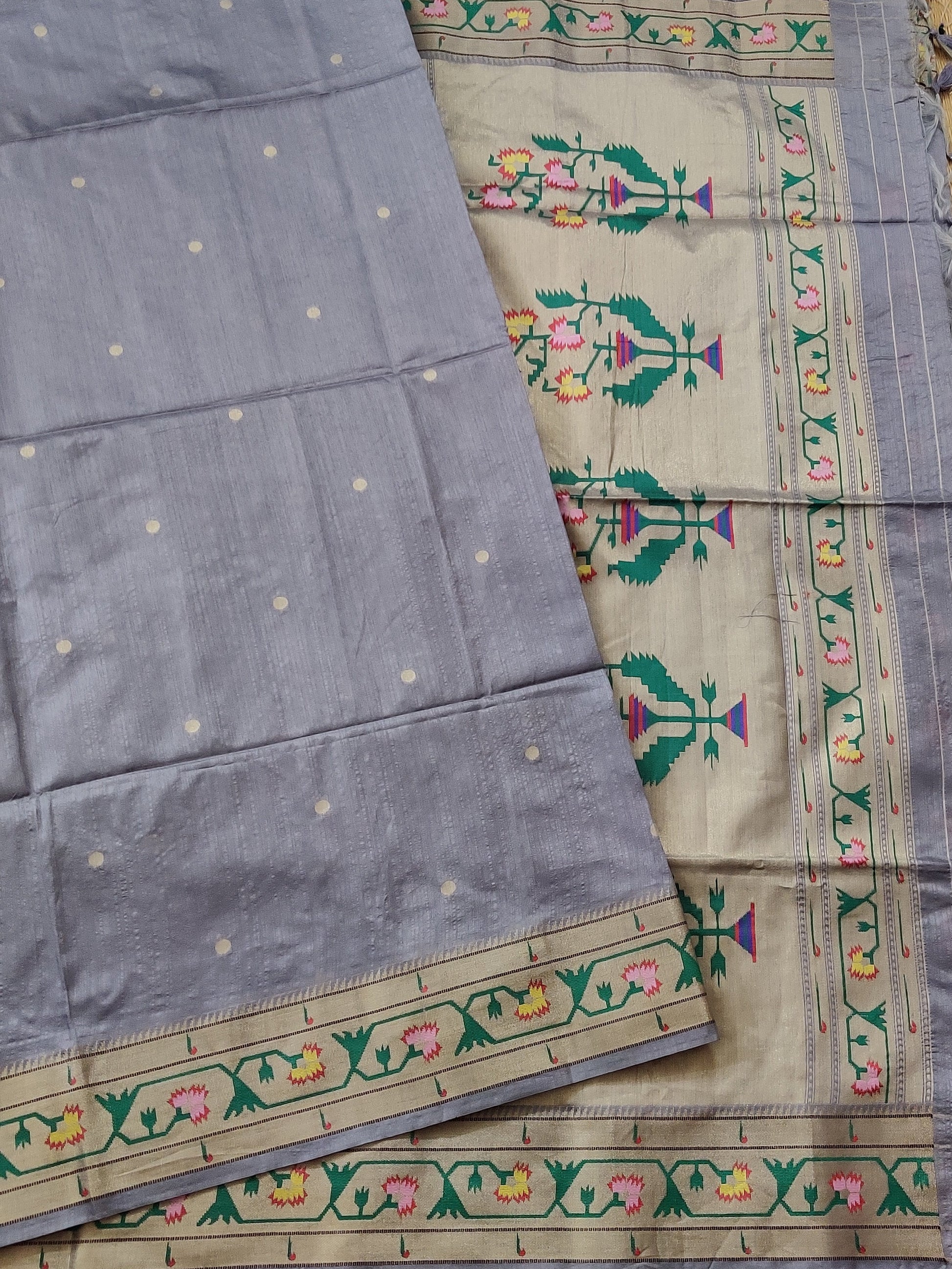 Grey Colour Semi Paithani Saree With Zari Butta Sll Over Code : VB0473