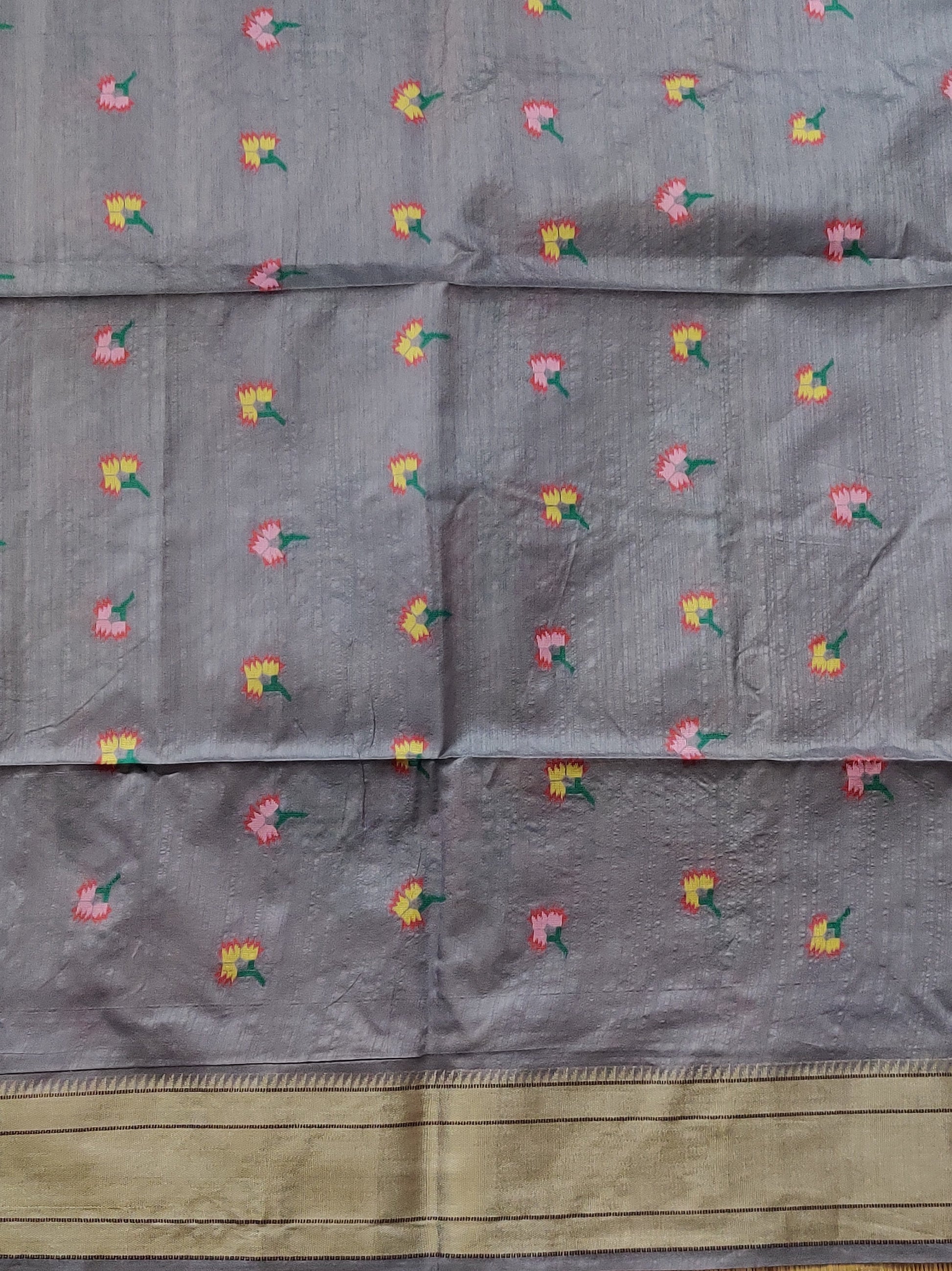 Elevate your ethnic wardrobe with this sophisticated grey semi-Paithani saree, a masterpiece of traditional craftsmanship. The fabric showcases intricate zari buttas scattered throughout, creating a luminous, textured appeal that catches light beautifully. A gleaming zari border frames the saree with timeless elegance, while the ornate zari pallu serves as a striking focal point. Paired with a complementary floral motif blouse, this saree seamlessly transitions from festive occasions to formal celebrations. The semi-Paithani weave offers the authentic charm of Paithani silk with practical versatility, making it an investment piece for the discerning wearer who values both heritage and contemporary styling.