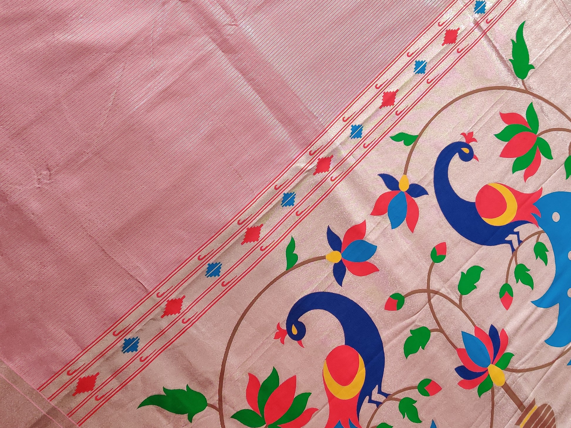 This semi Paithani saree, crafted in a soft pink hue, highlights intricate zari brocade that reflects expert craftsmanship. Its traditional Paithani border and pallu add a refined touch, while the matching self-colored butta blouse completes the ensemble with understated sophistication. Ideal for festive and formal occasions, this saree effortlessly blends heritage artistry with elegant style.