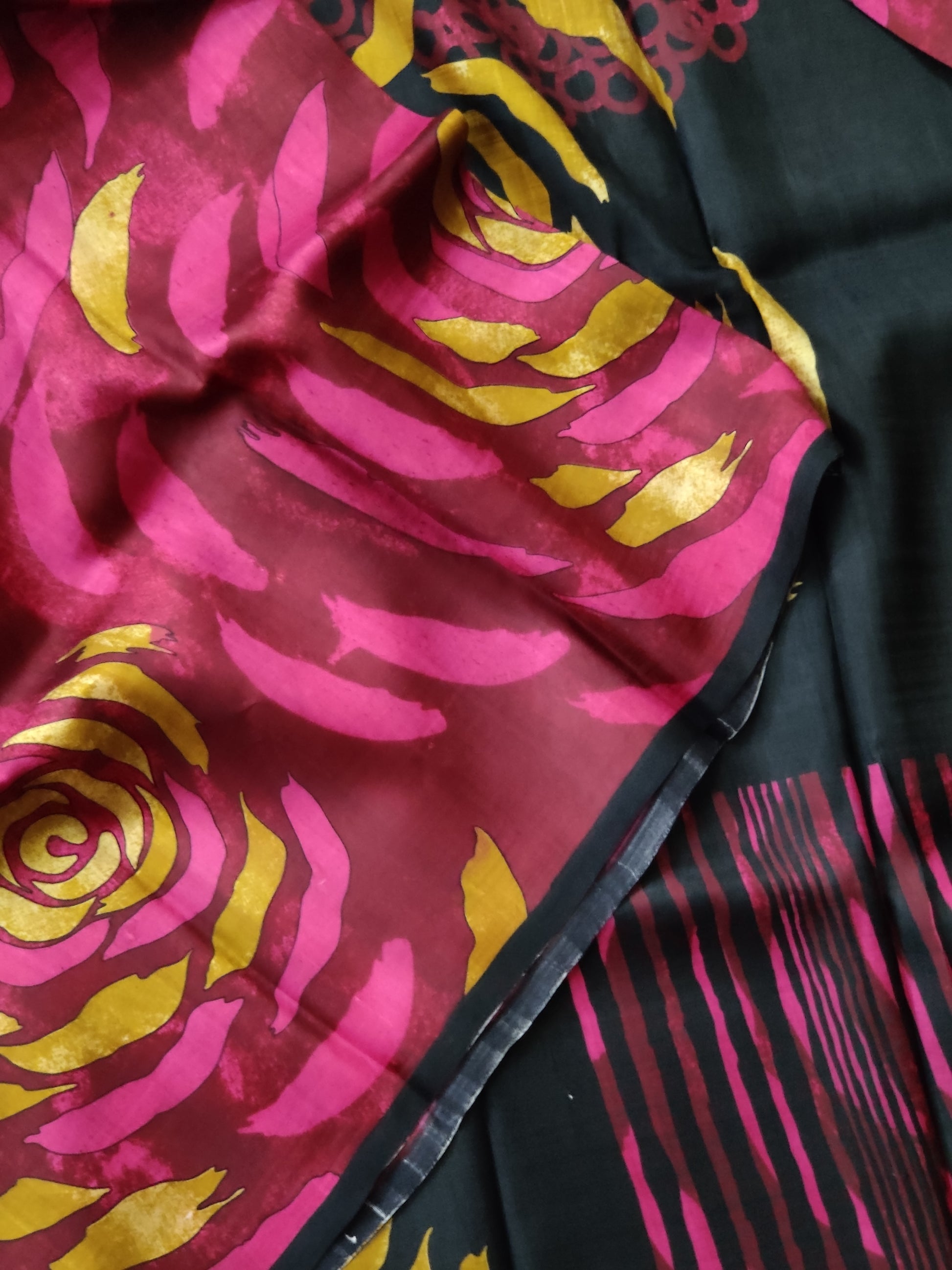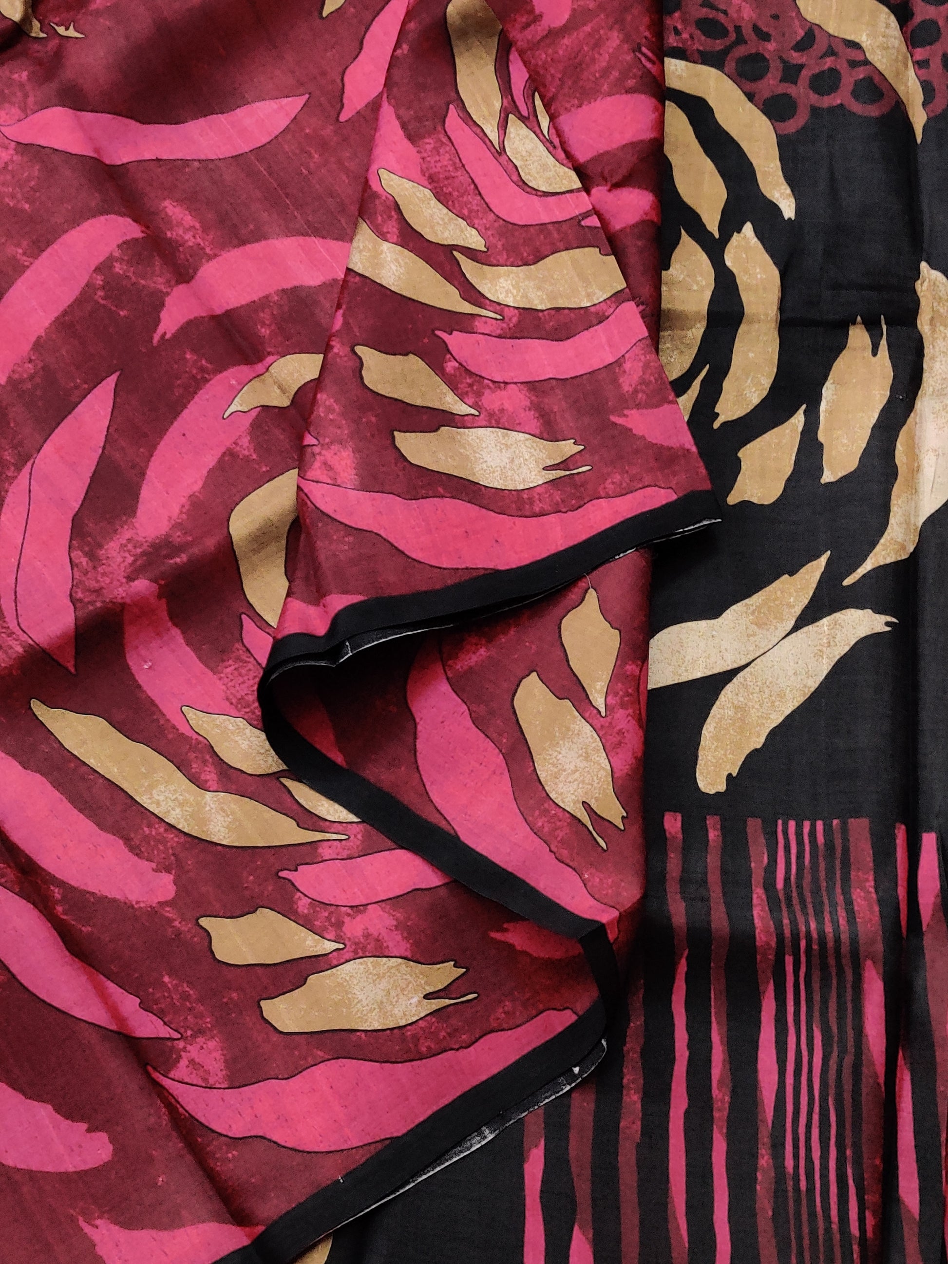 Elevate your ethnic wardrobe with this stunning Murshidabad silk saree, featuring a captivating maroon and pink palette. The entire drape showcases intricate screen-printed patterns that create visual depth and movement, while the contrast black-printed pallu adds a sophisticated finishing touch. Crafted from premium Murshidabad silk, known for its lustrous finish and fluid drape, this saree offers both comfort and elegance for festive occasions and celebrations. The accompanying plain blouse provides versatility, allowing you to style it with your preferred accessories. A timeless piece that seamlessly blends traditional craftsmanship with contemporary design sensibilities.