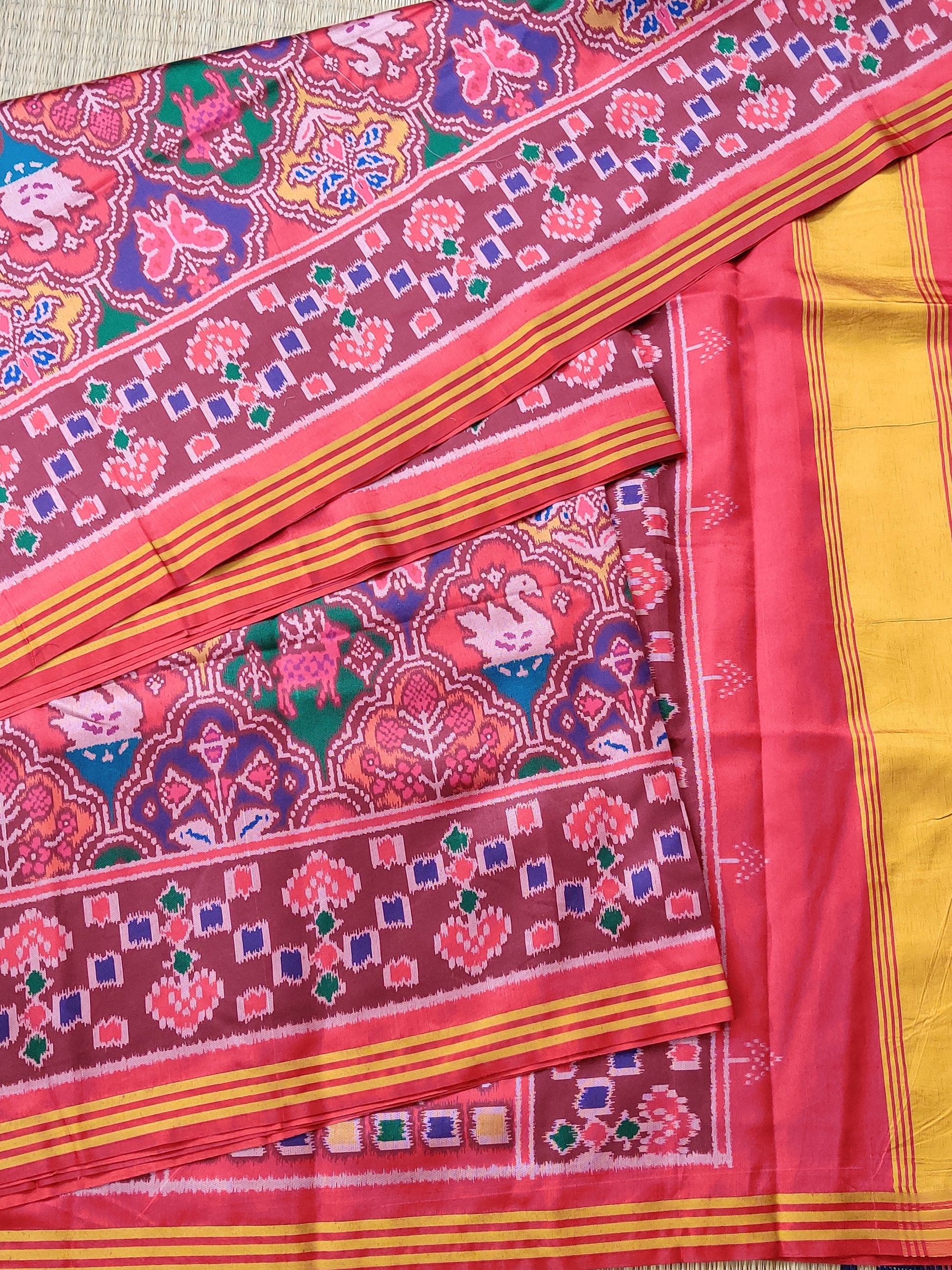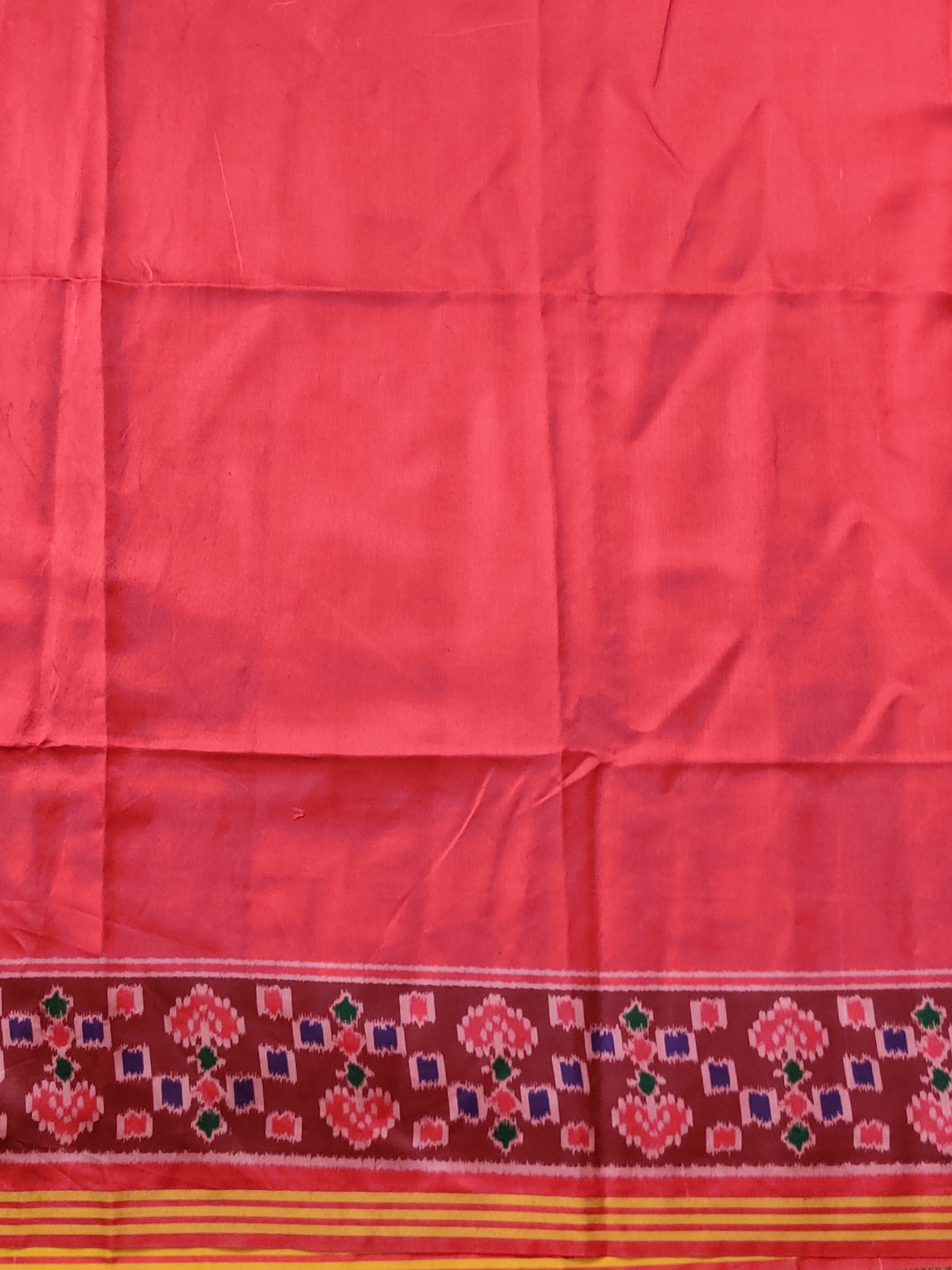 Elevate your traditional wardrobe with this multi-colour semi patalo saree, featuring intricate ikkat weaving throughout. The rich maroon border and pallu add depth and sophistication, perfectly complemented by a plain blouse to balance the vibrant design. Crafted for both elegance and comfort, this saree is ideal for festive occasions and cultural celebrations.