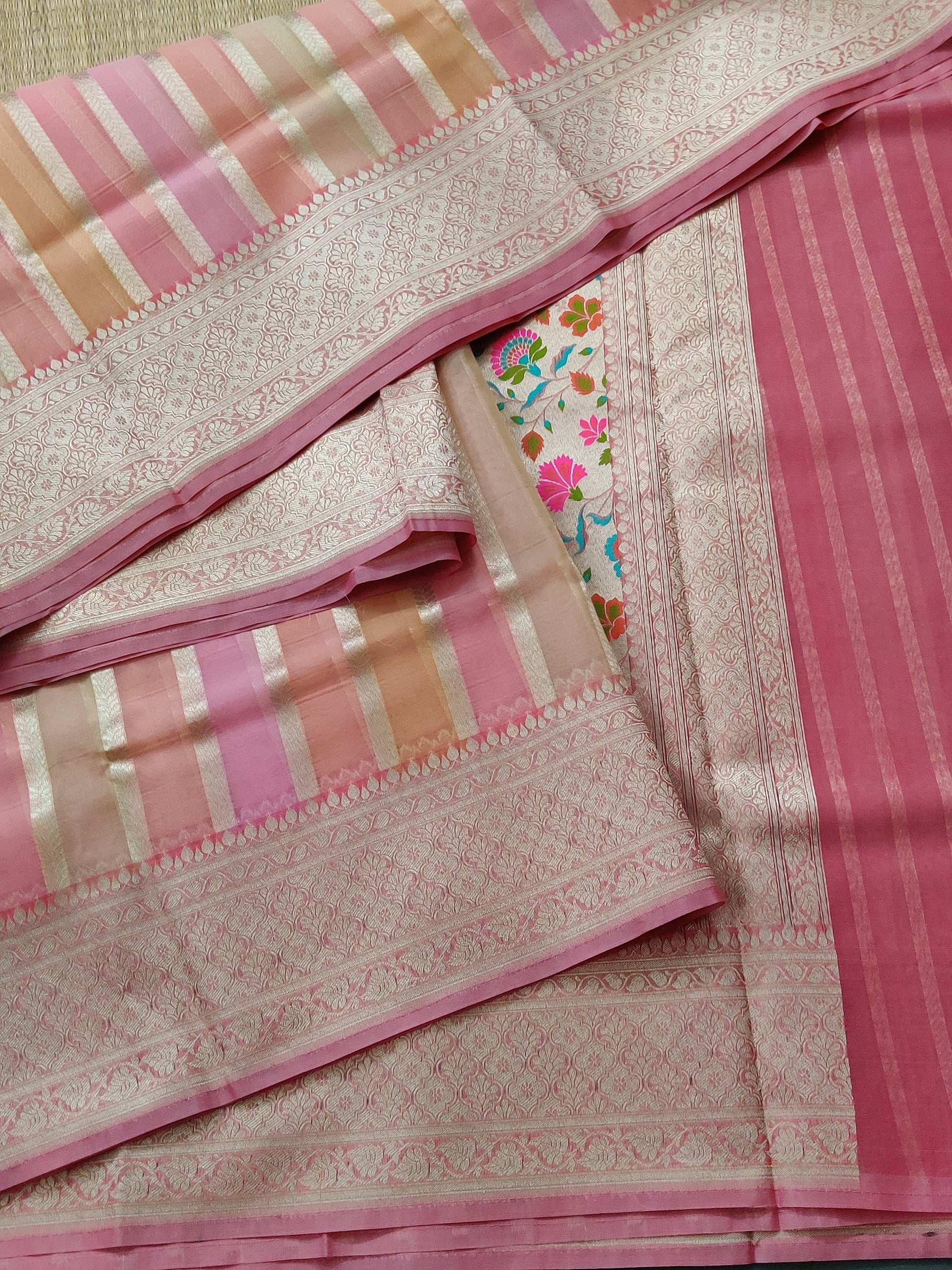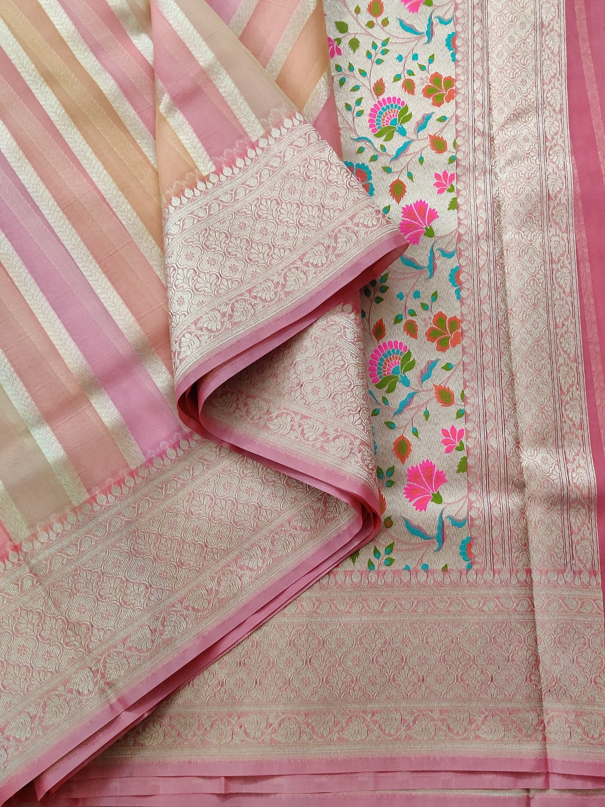 This tri-colour organza saree represents refined craftsmanship with its all-over zari striping that catches light beautifully across the fabric. The peach-toned zari border creates a striking visual contrast, defining the saree's silhouette with precision. The pallu features intricate meenakari detailing—a traditional enamelling technique that adds dimensional artistry and cultural authenticity. The lightweight organza construction ensures comfortable draping while maintaining the fabric's elegant sheen. Accompanied by a coordinated blouse, this piece is engineered for those who appreciate heritage textiles with contemporary sensibility, perfect for weddings, festivals, and formal celebrations.