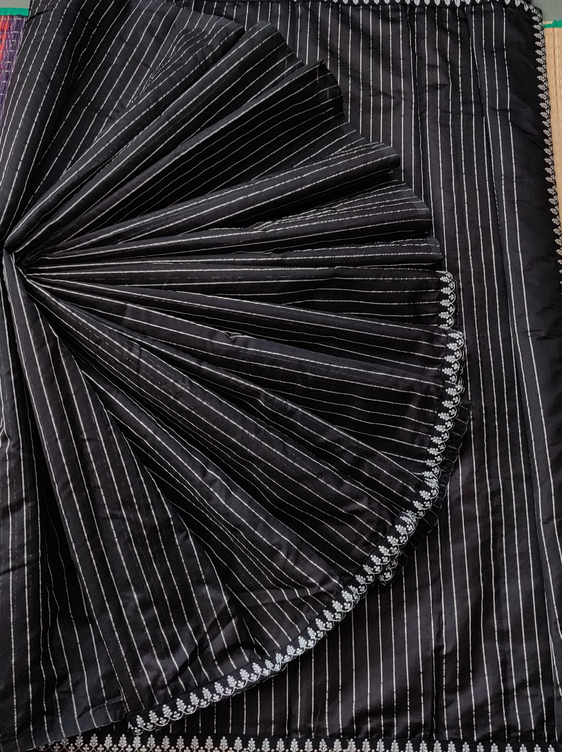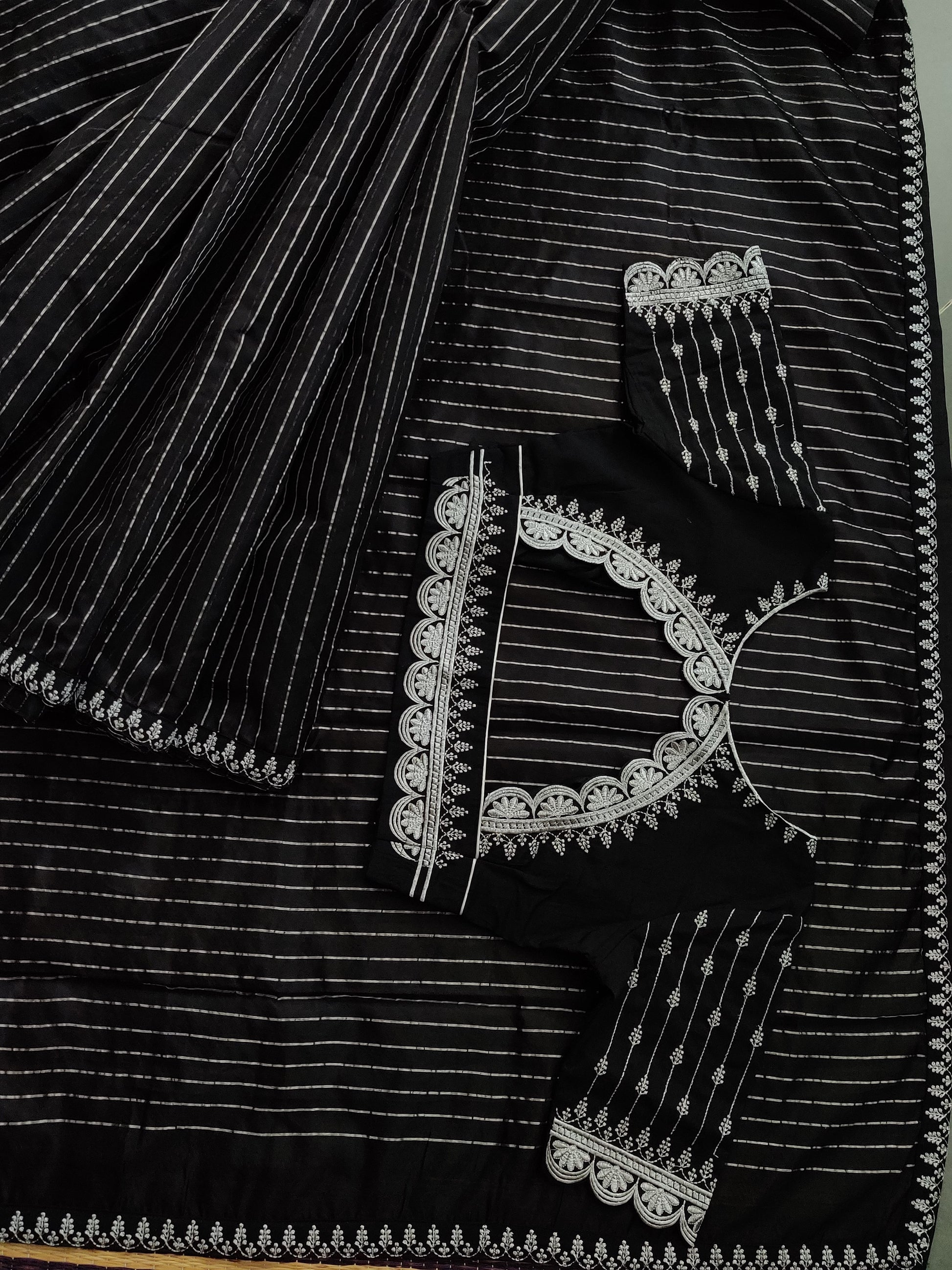 This black Chanderi silk saree features delicate silver zari stripes all over, adding a touch of elegance and sophistication to the traditional look. The silver zari border and self-coloured plain blouse beautifully complement the saree, making it a perfect choice for any formal occasion. Expertly crafted with high-quality materials, this saree exudes luxury and style.