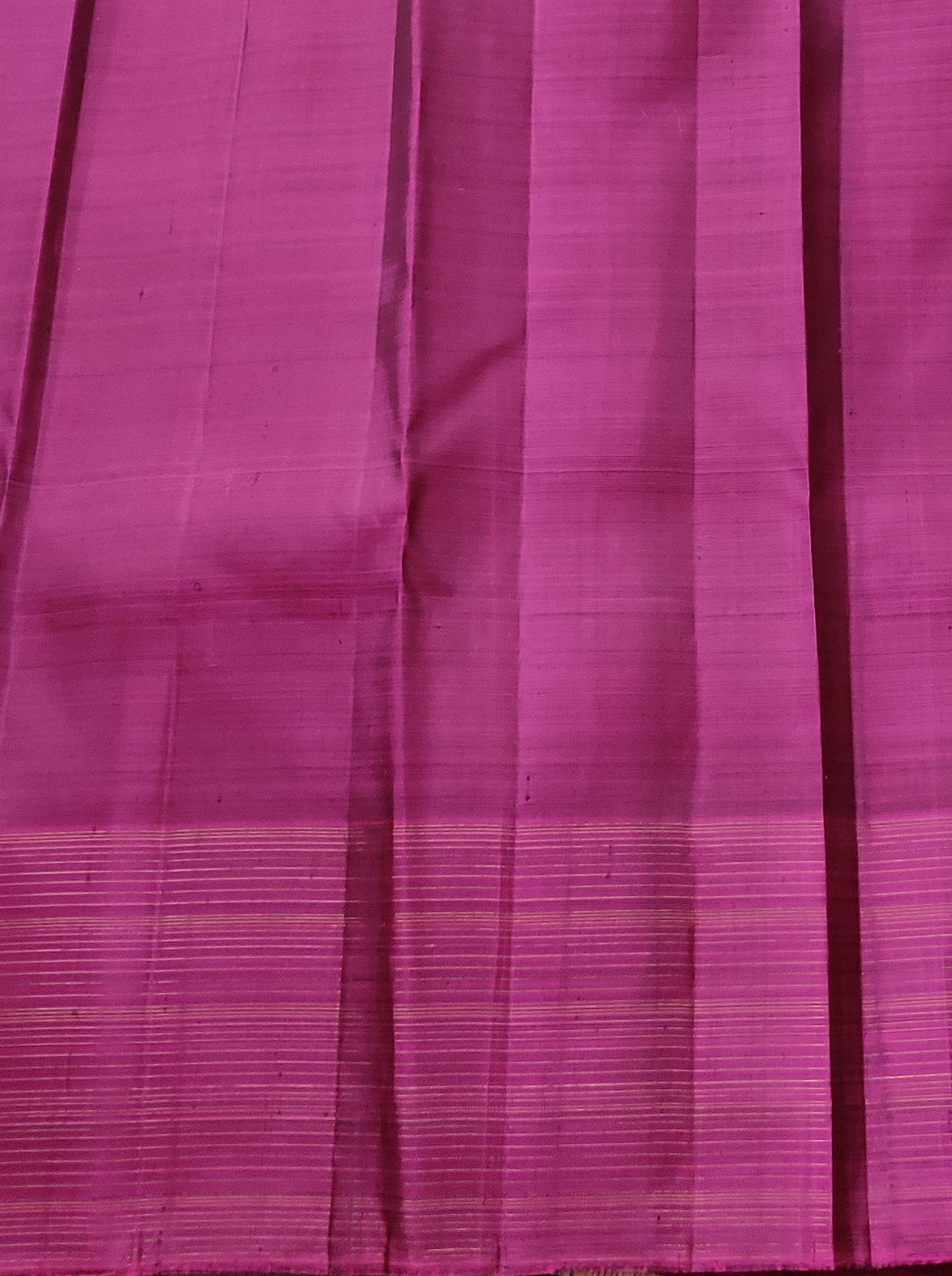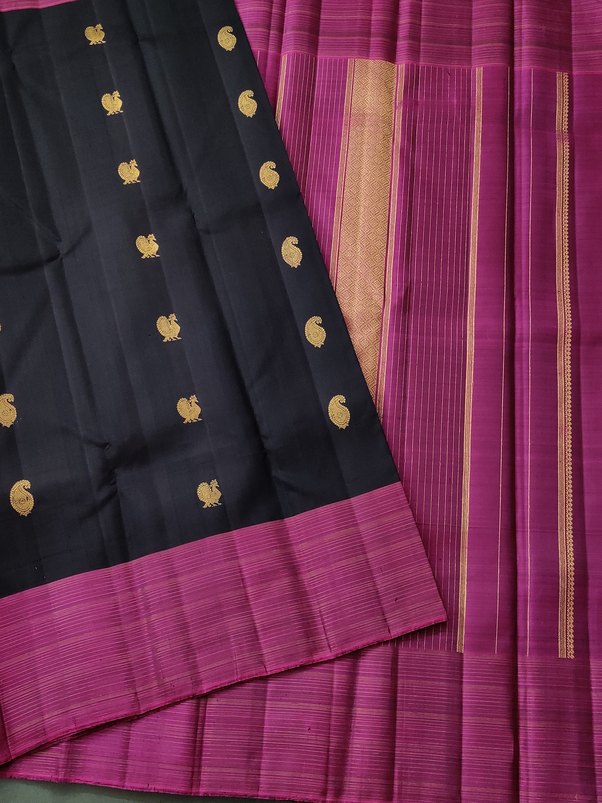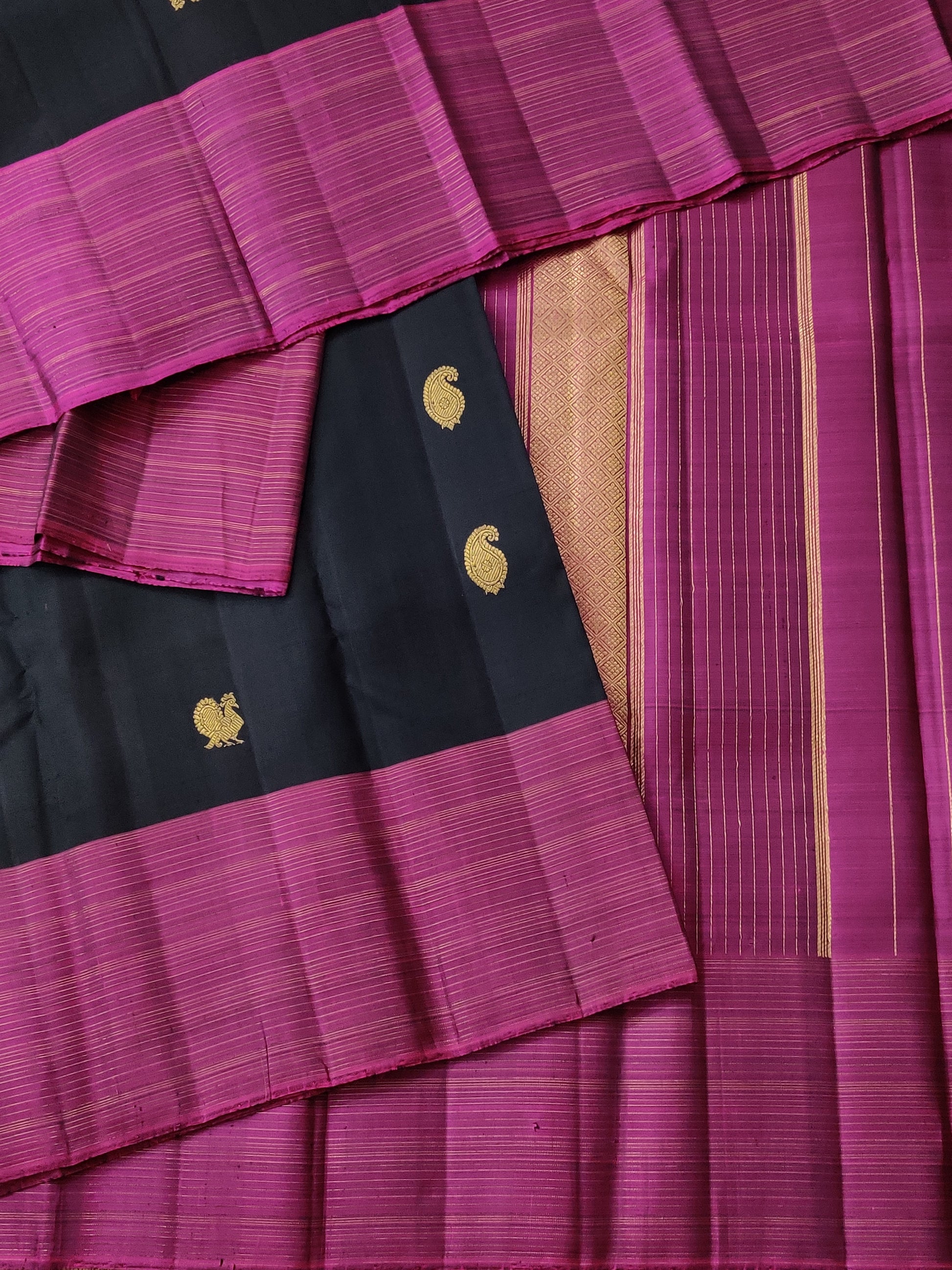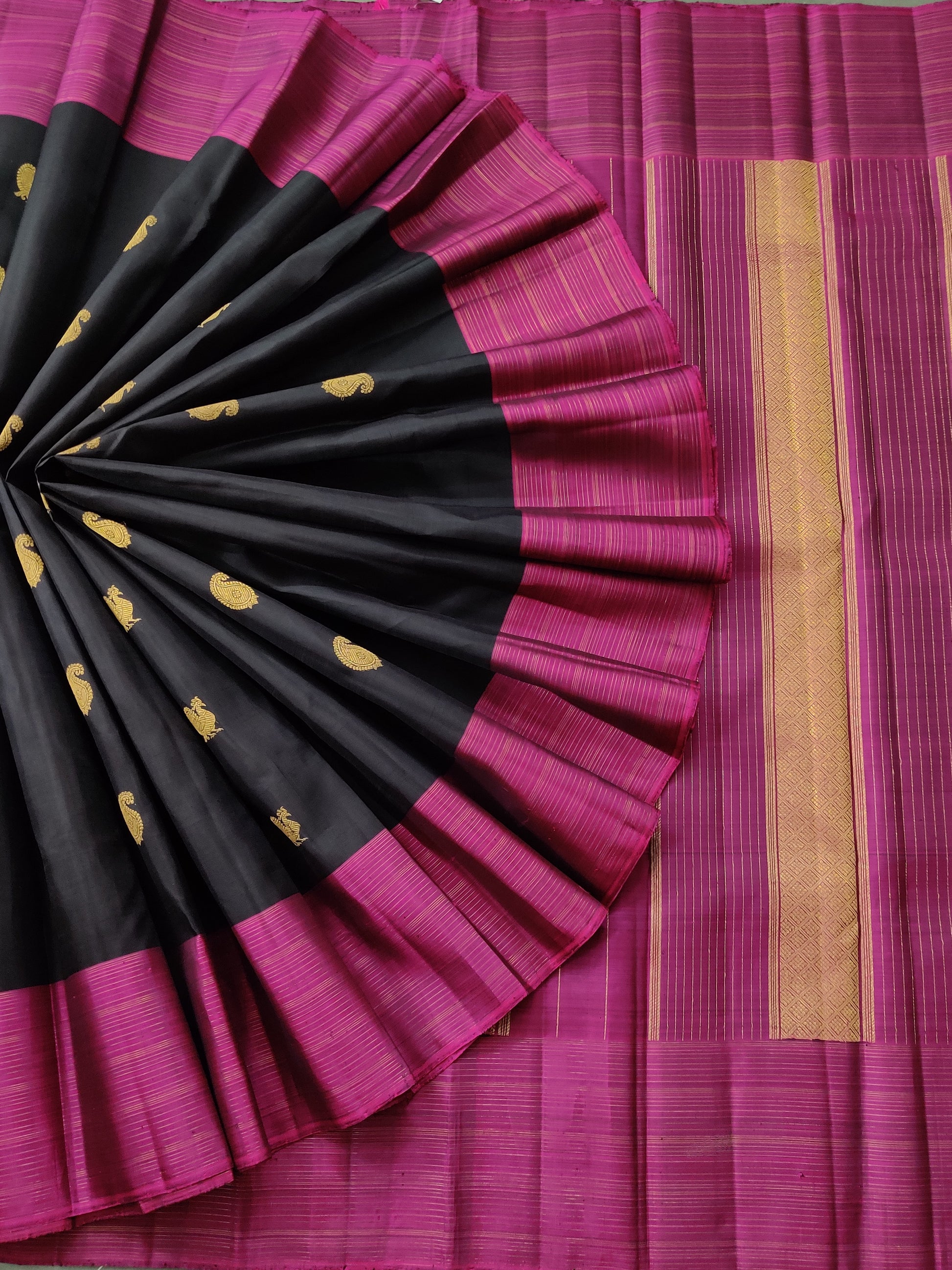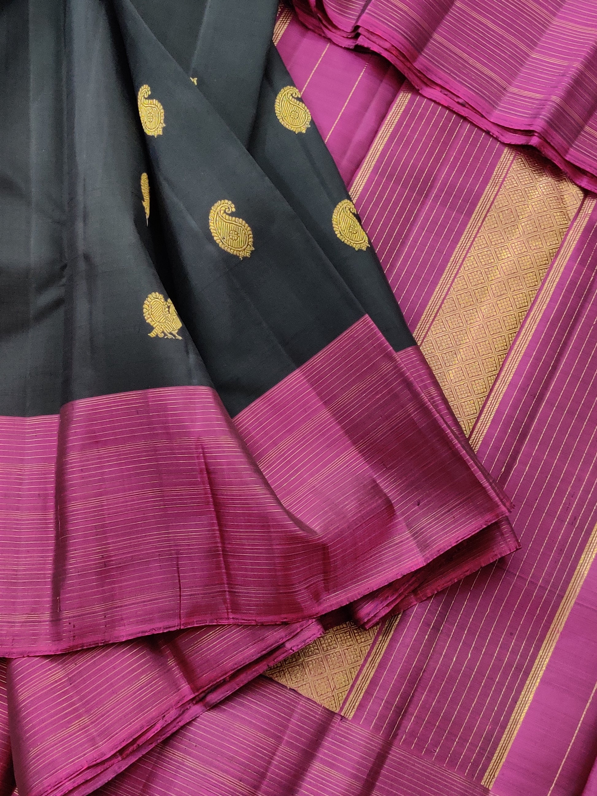 Indulge in the exquisite craftmanship of a Kanchivaram silk saree. This black saree is adorned with a beautiful mango zari motif all over, complemented by a magenta zari pallu and border. Made with pure silk and pure zari, this saree exudes luxury and elegance. Comes with a plain blouse.