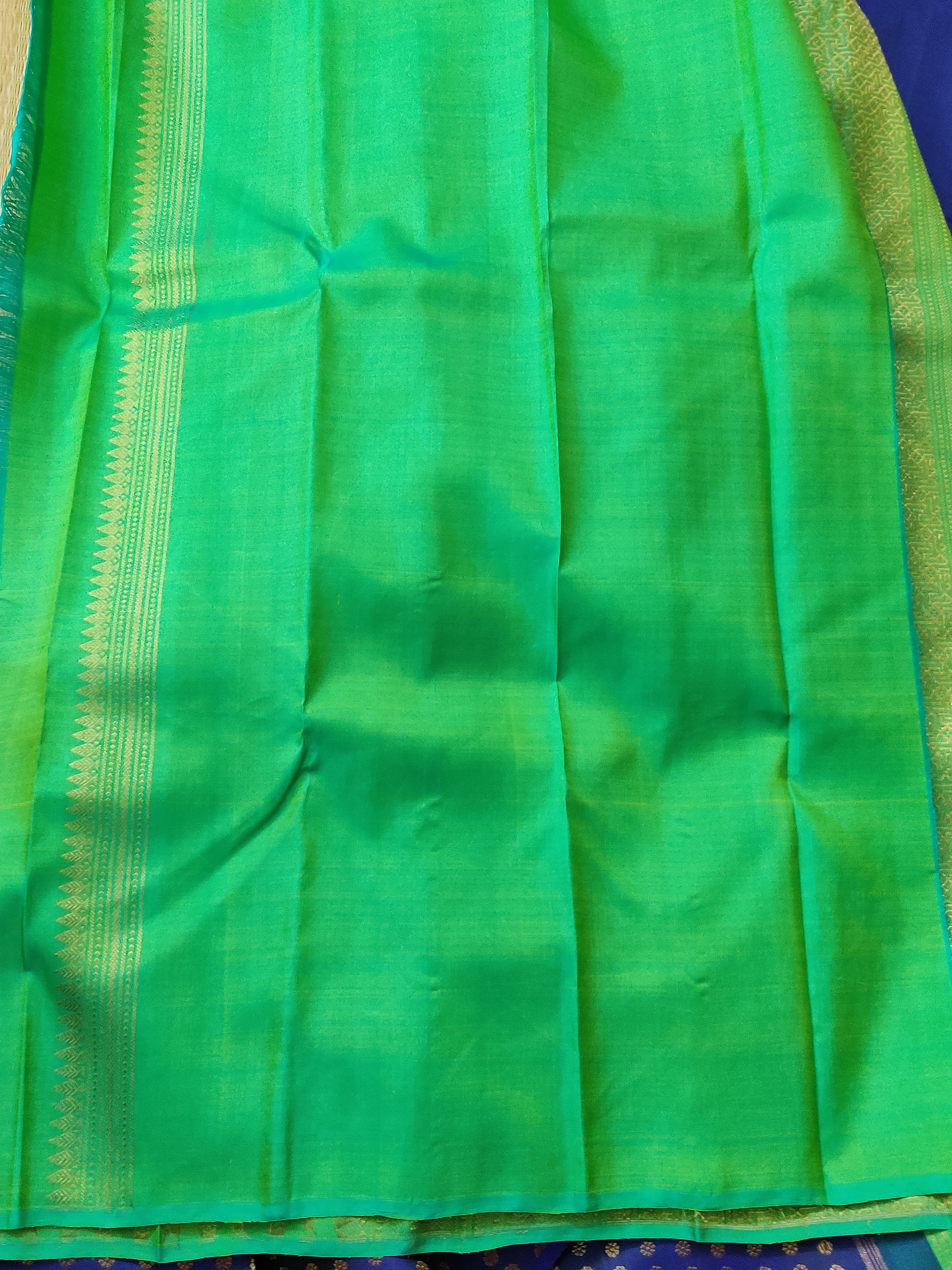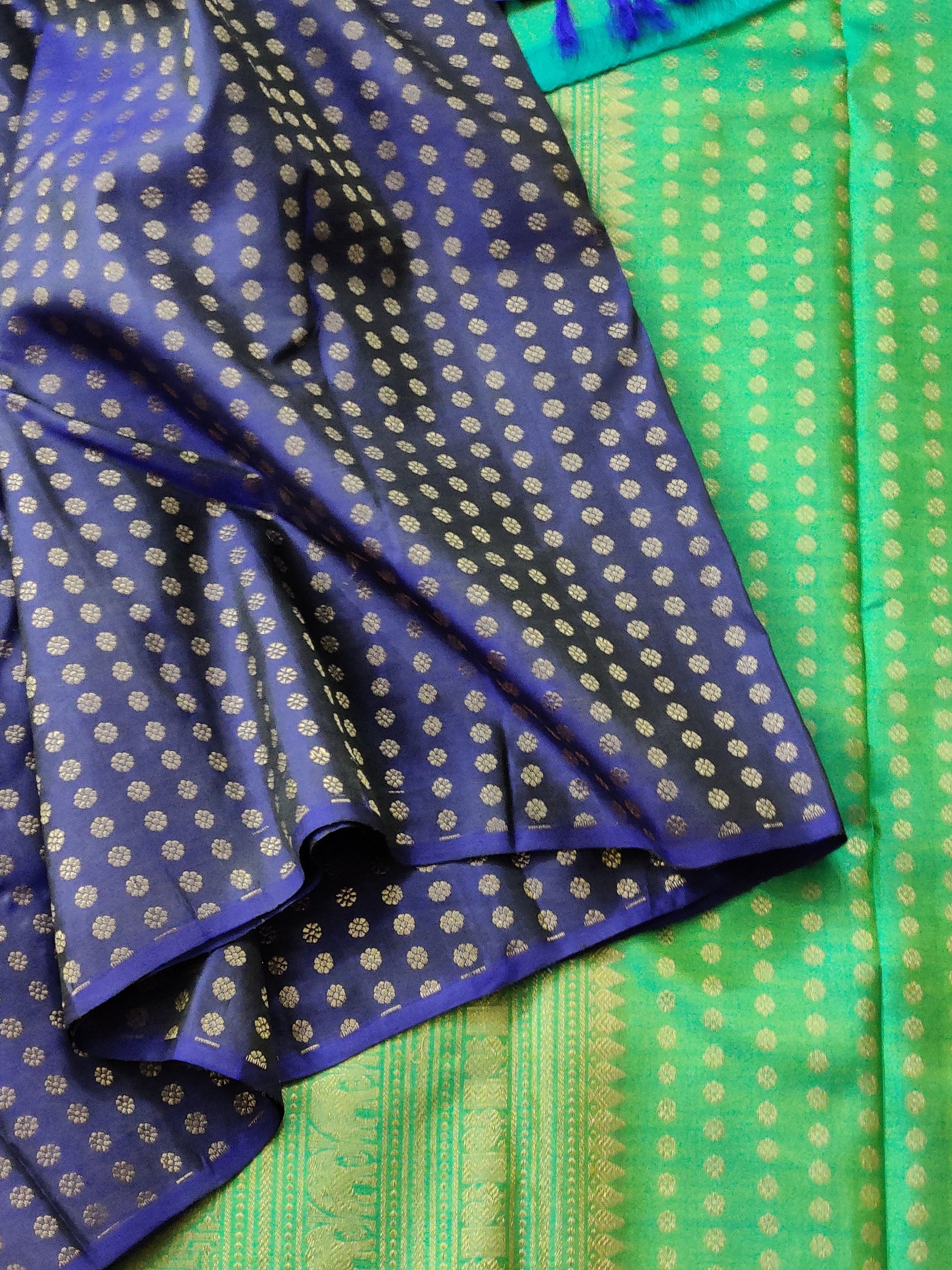 Expertly handwoven from pure silk, this navy blue kanchivaram saree boasts a stunning dualtone green zari pallu and blouse. The intricate zari weaving technique adds a touch of elegance and sophistication to this traditional Indian garment. Elevate your style with this luxurious and eye-catching saree.