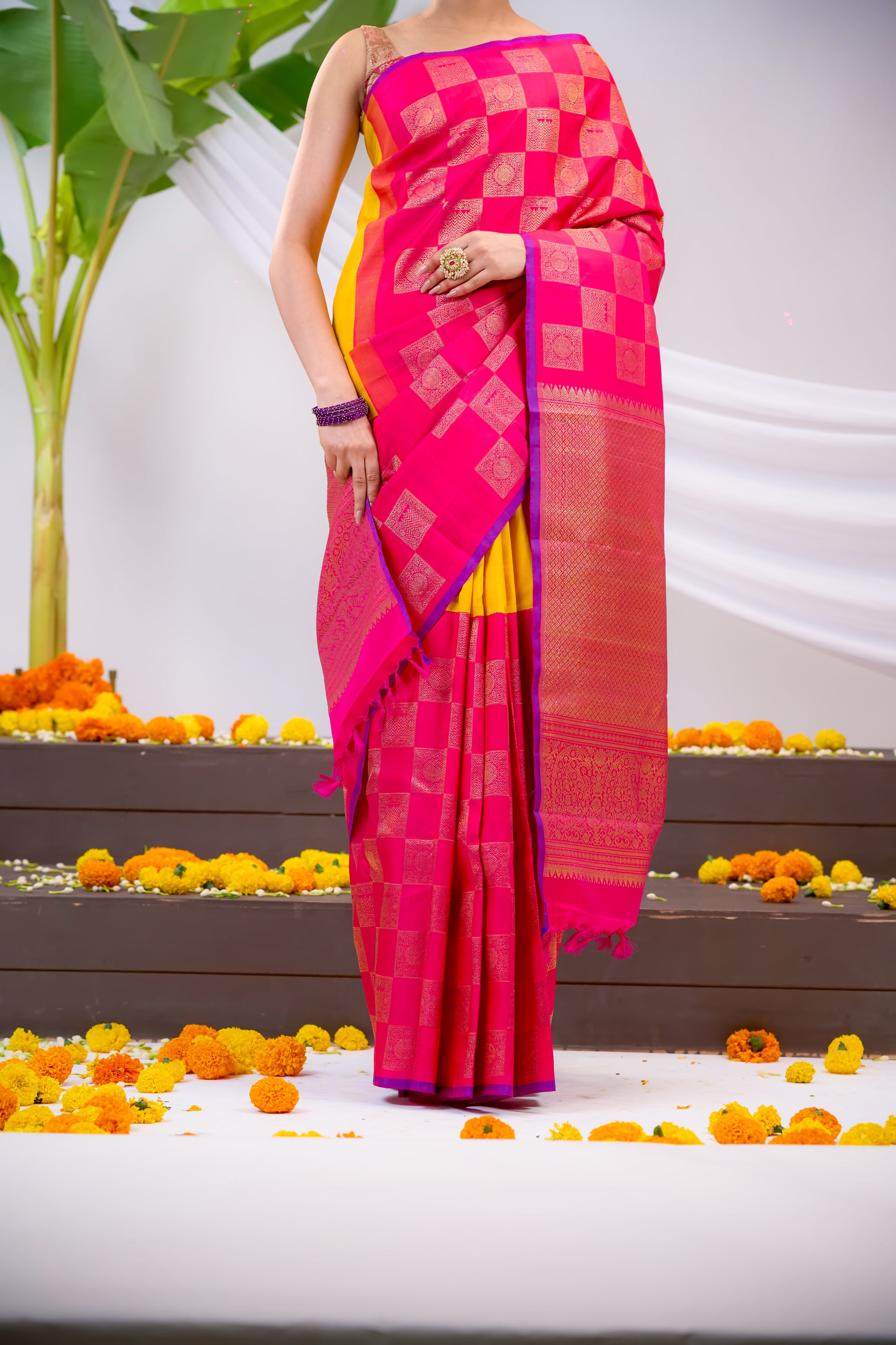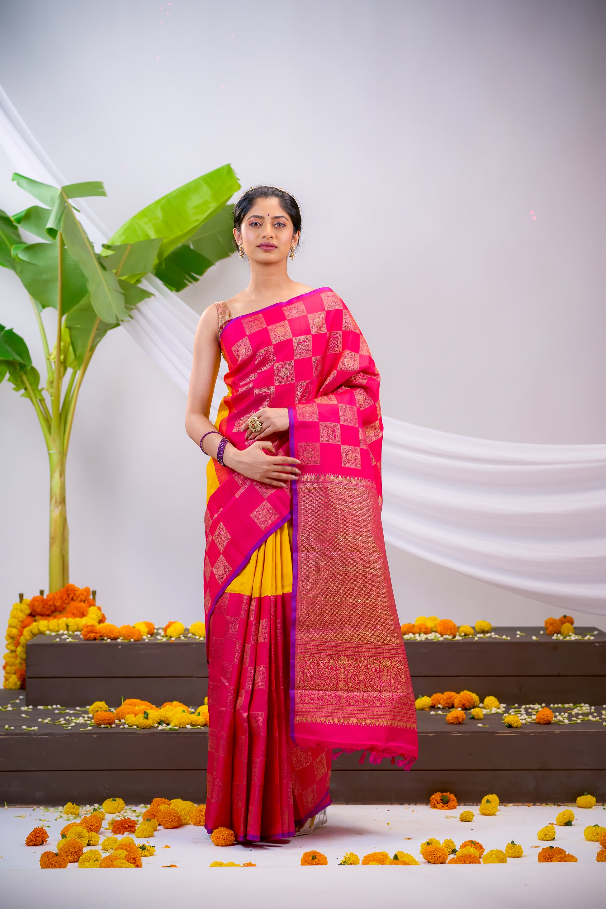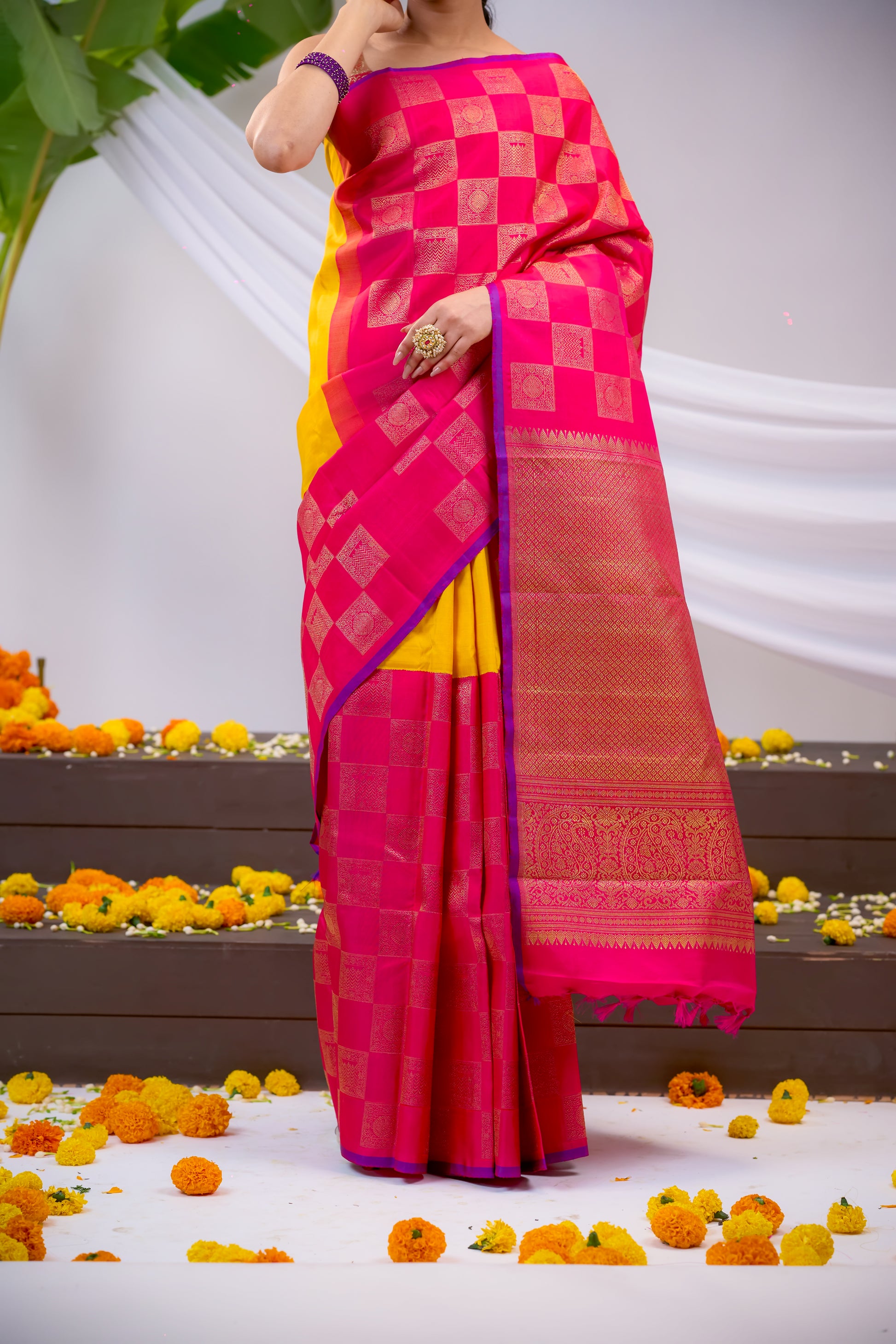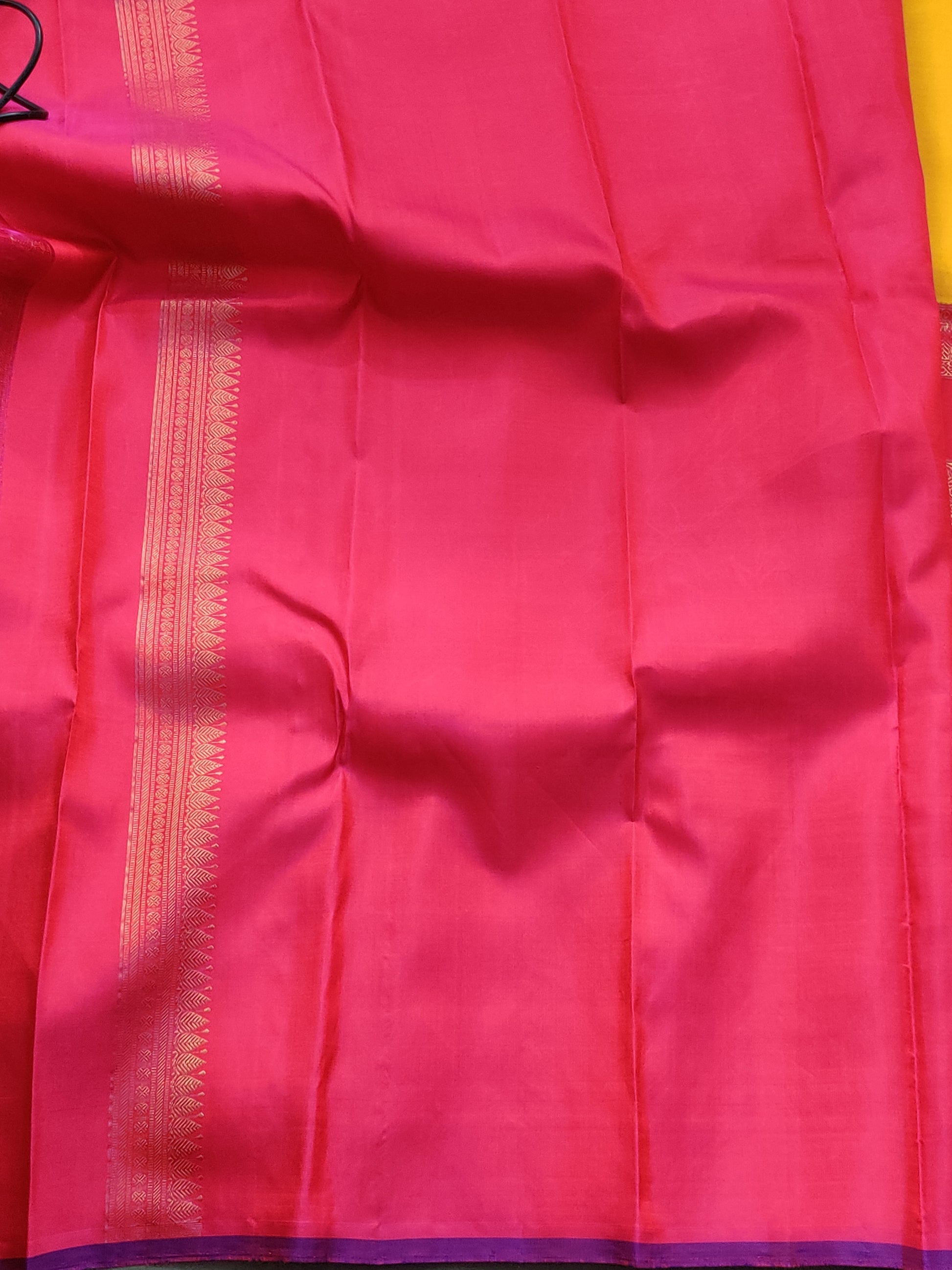Yellow & Pink Colour Kanchivaram Silk Saree With plain Body