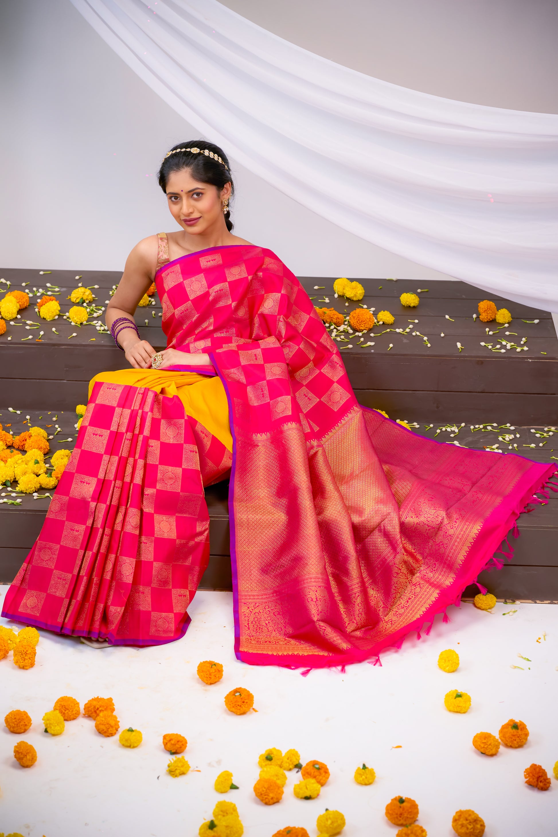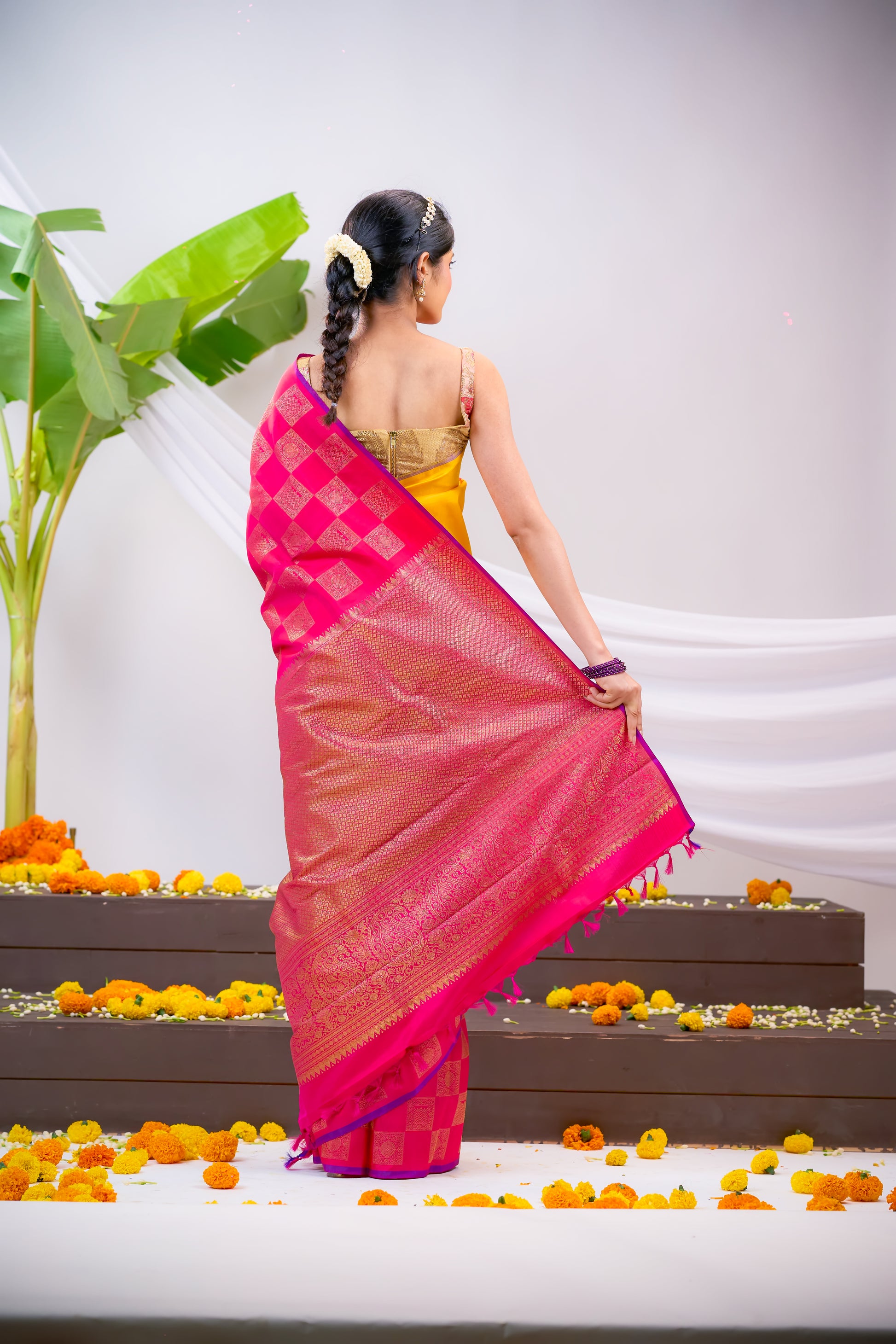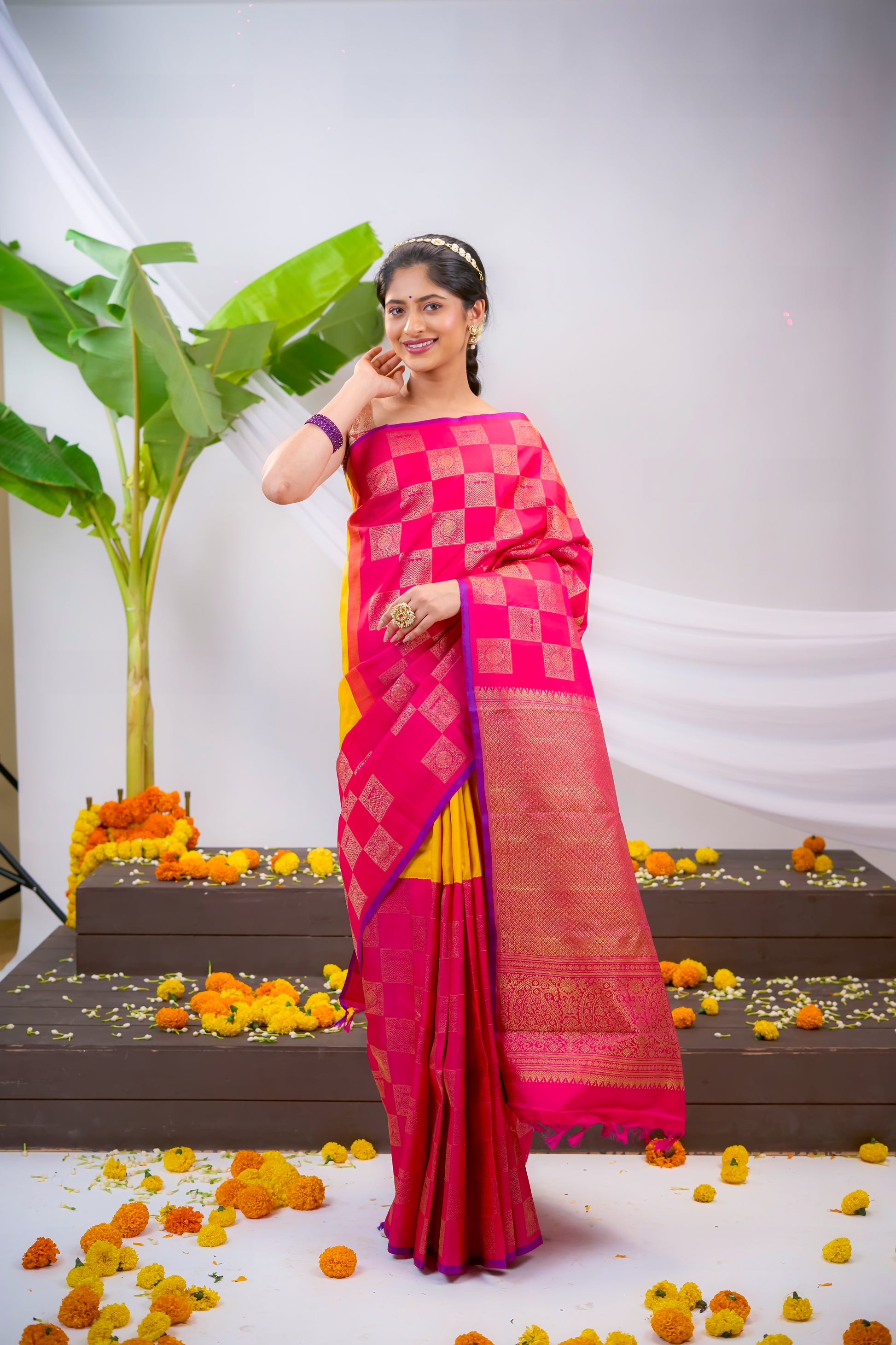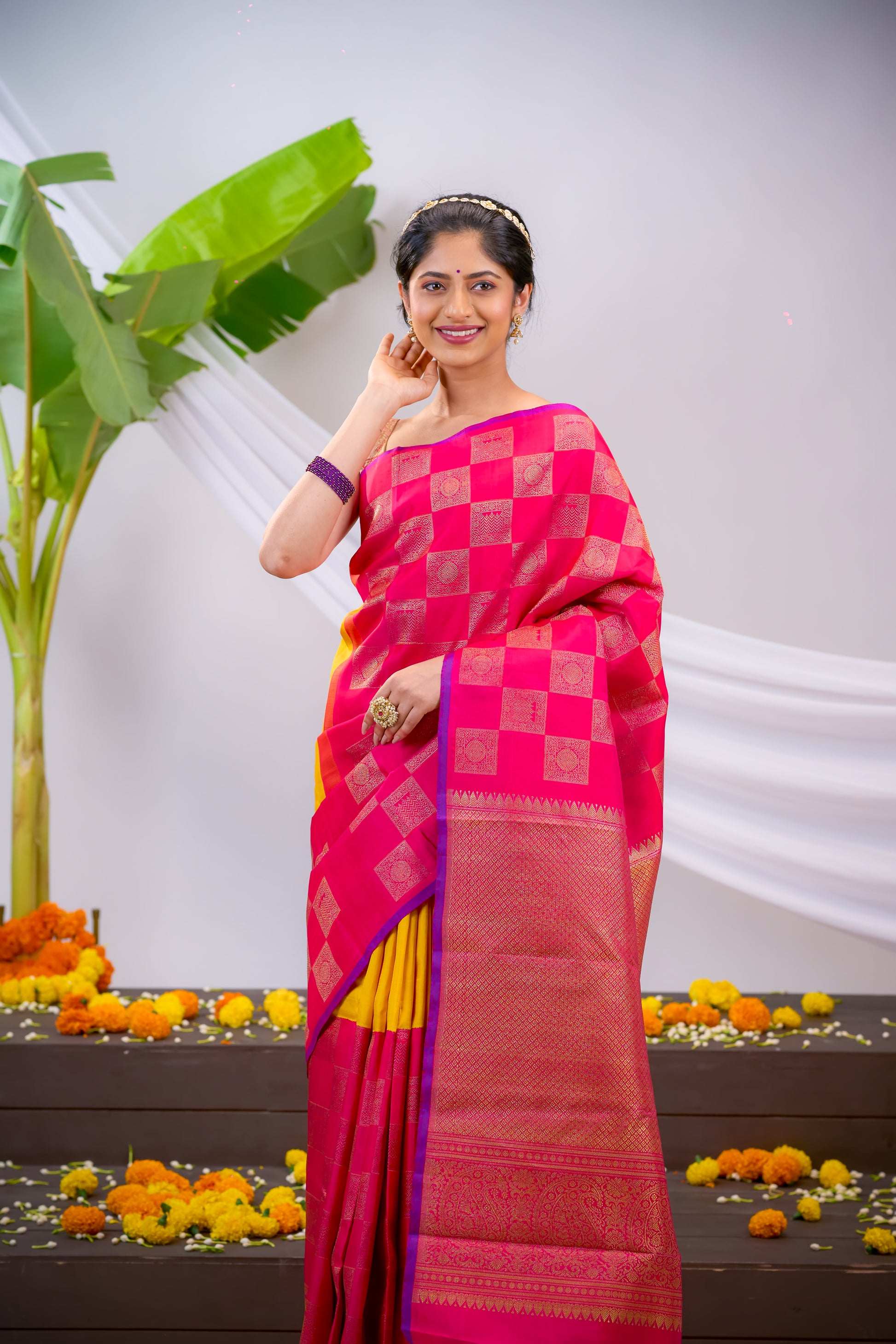 Yellow & Pink Colour Kanchivaram Silk Saree With plain Body