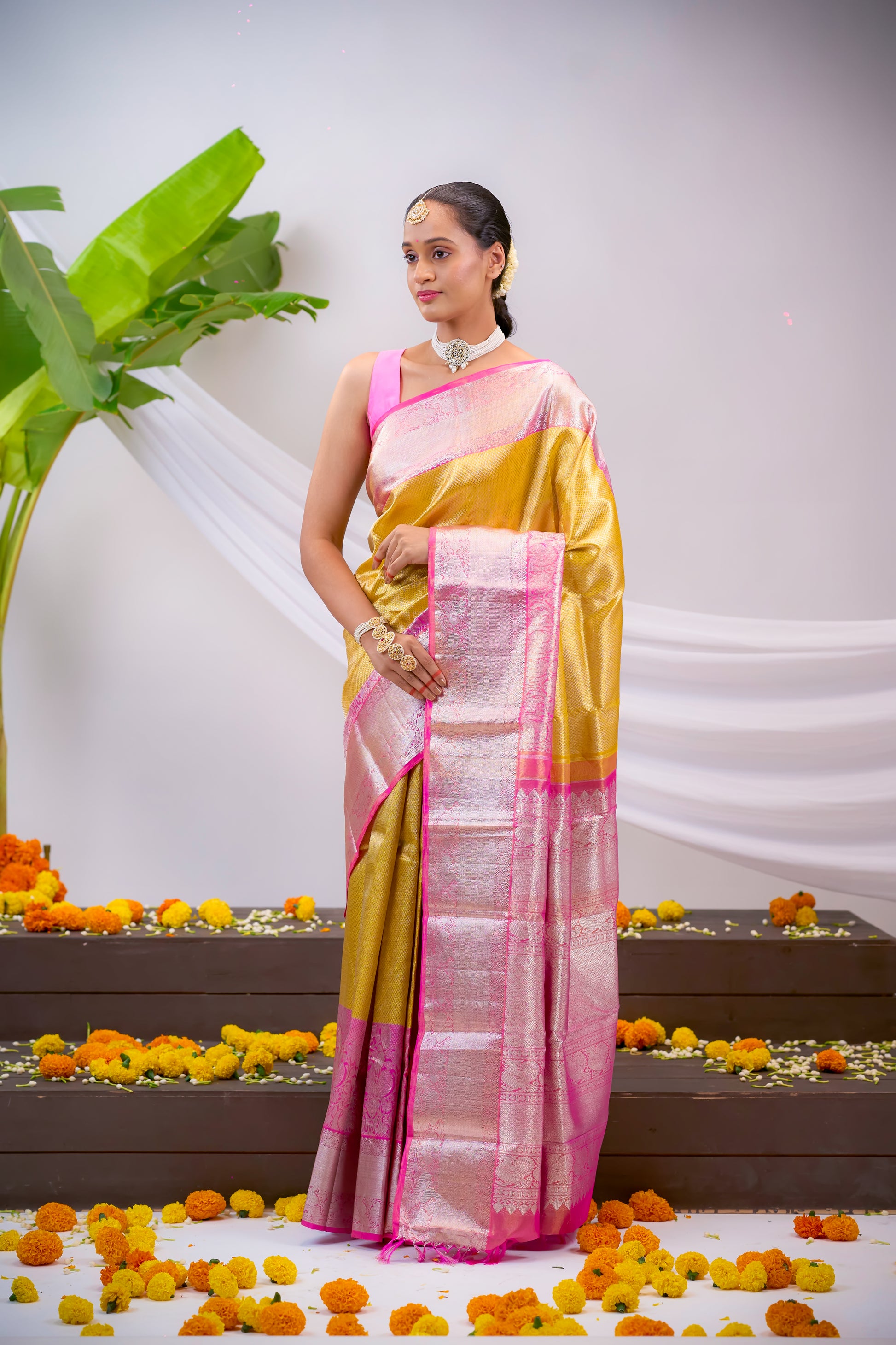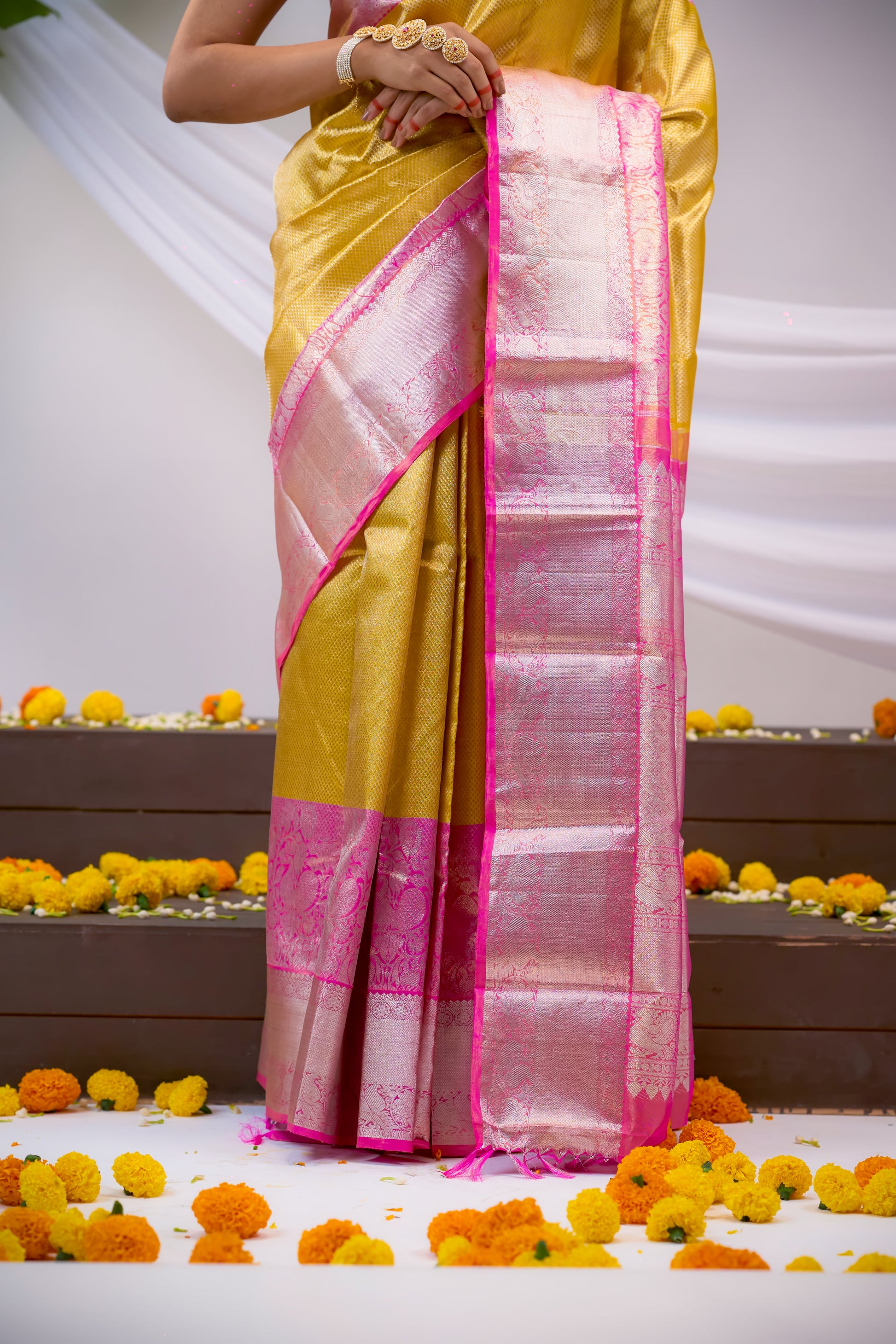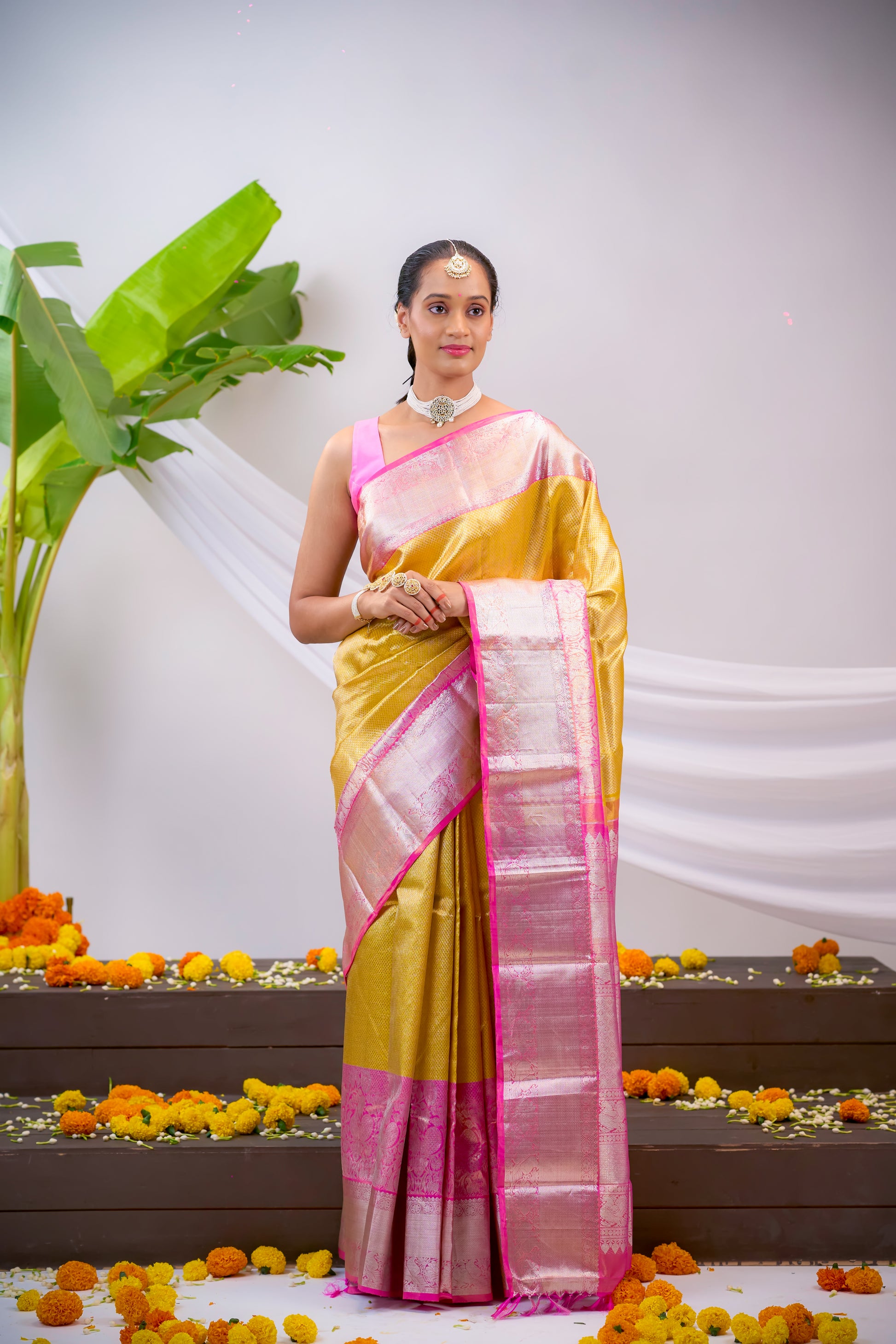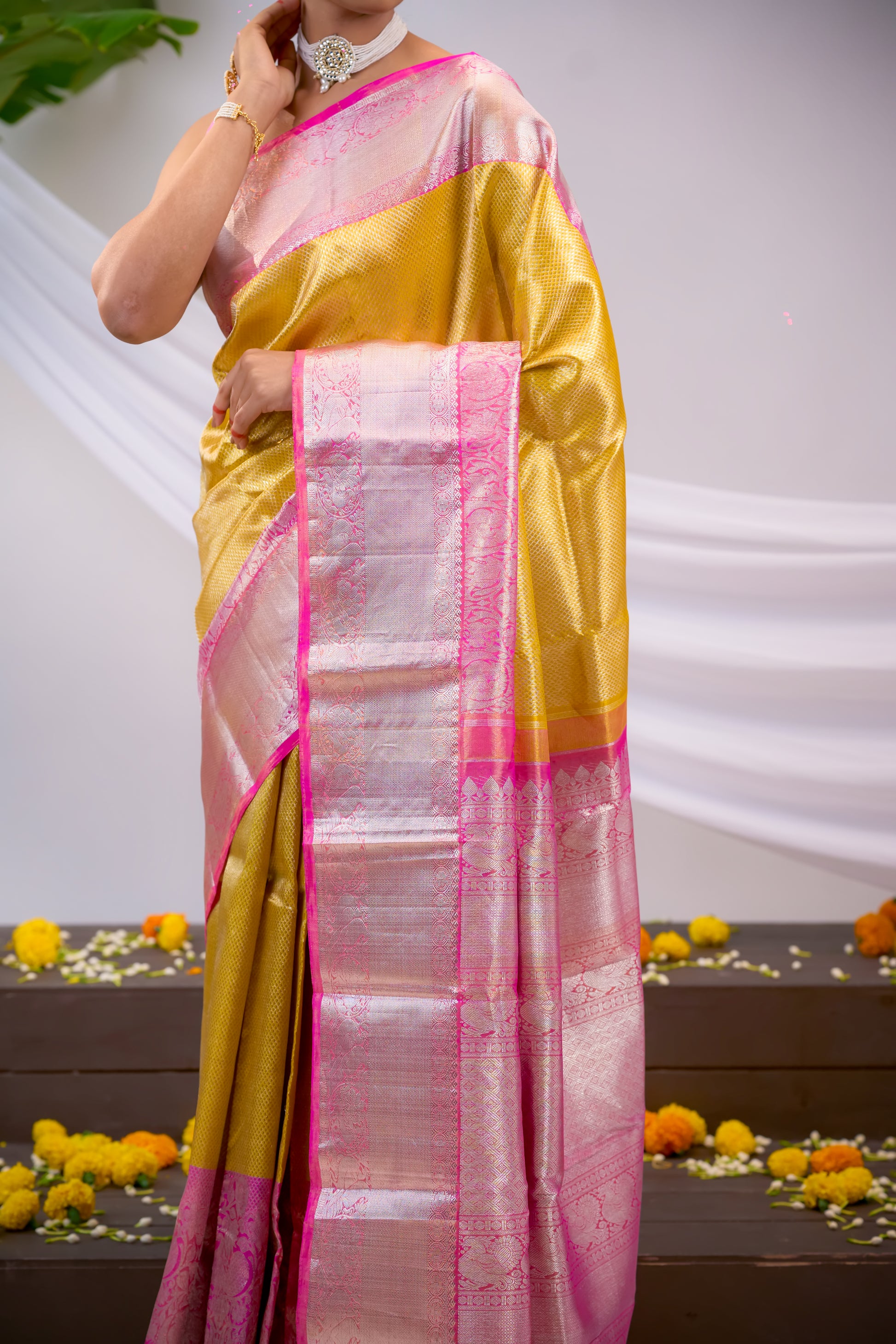 Upgrade your traditional wardrobe with our stunning Gold Tissue Kanchivaram Silk Saree. The intricate zari brocade and bold, contrast pink border add a touch of elegance. The rich, zari pallu completes the look of this must-have saree. Elevate your style with this exquisite piece.