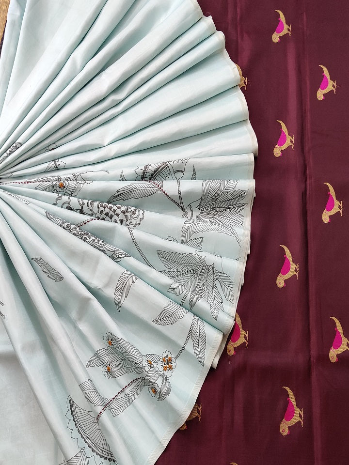 Expertly crafted Kanchivaram Silk saree in a stunning light sea blue hue. Made of luxurious pure silk and adorned with intricate hand painting and hand-stitched embroidery, this saree promises a timeless elegance. The contrasting brown bird motif on the pallu and blouse adds a unique touch. Perfect for special occasions.