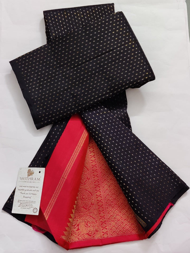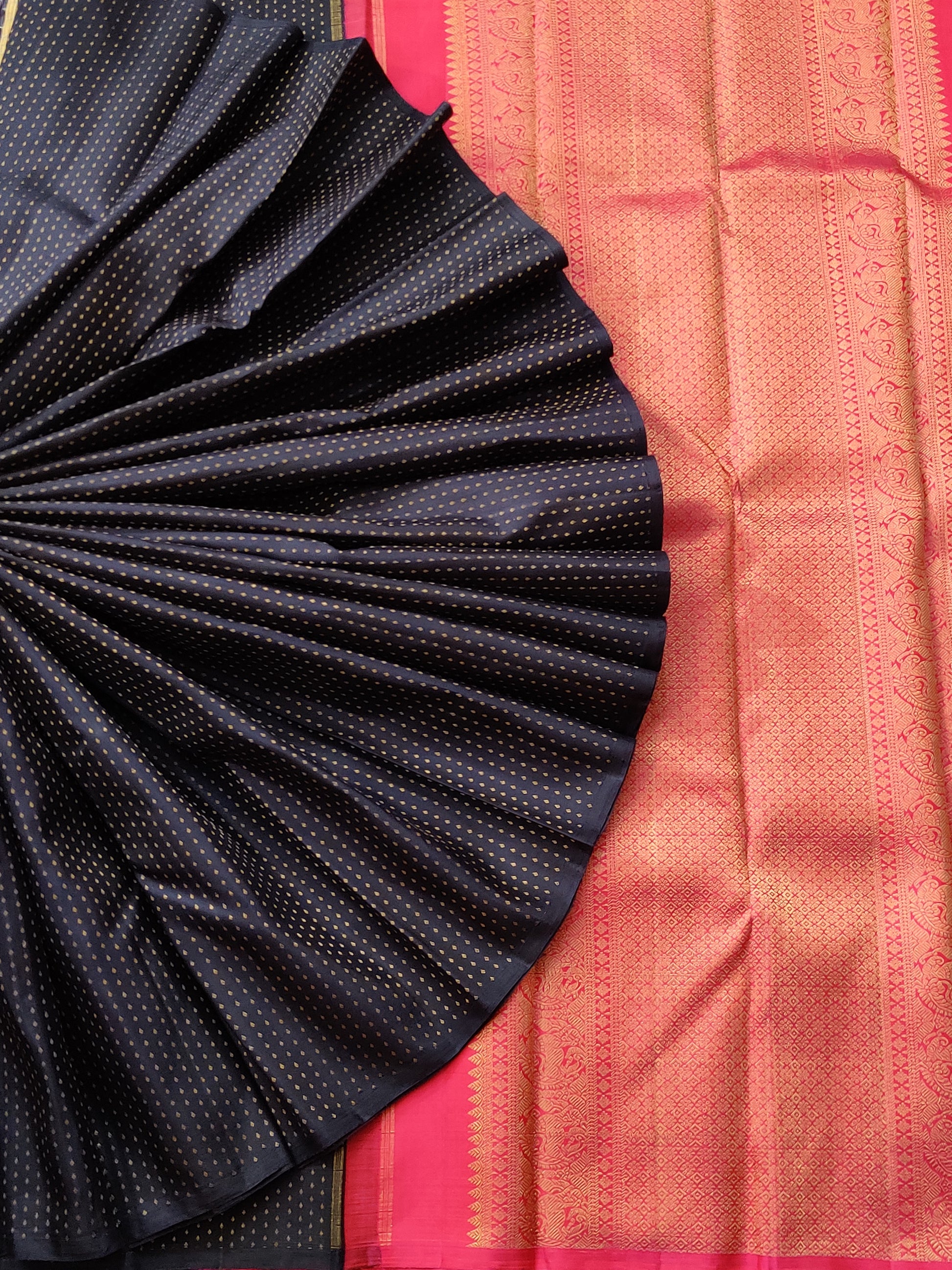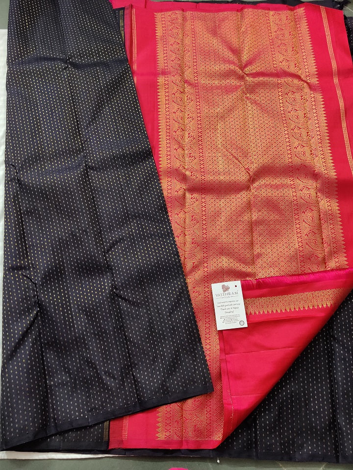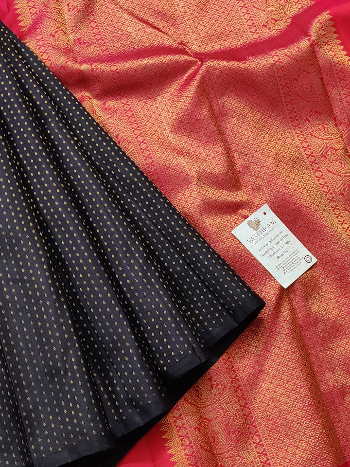 Enhance your wardrobe with this exquisite black PURE SILK PURE ZARI KANCHIVARAM saree. With its small zari butta all over and rani pink colour zari pallu, this saree exudes elegance and luxury. Complete the look with the plain blouse and feel confident in this timeless piece.