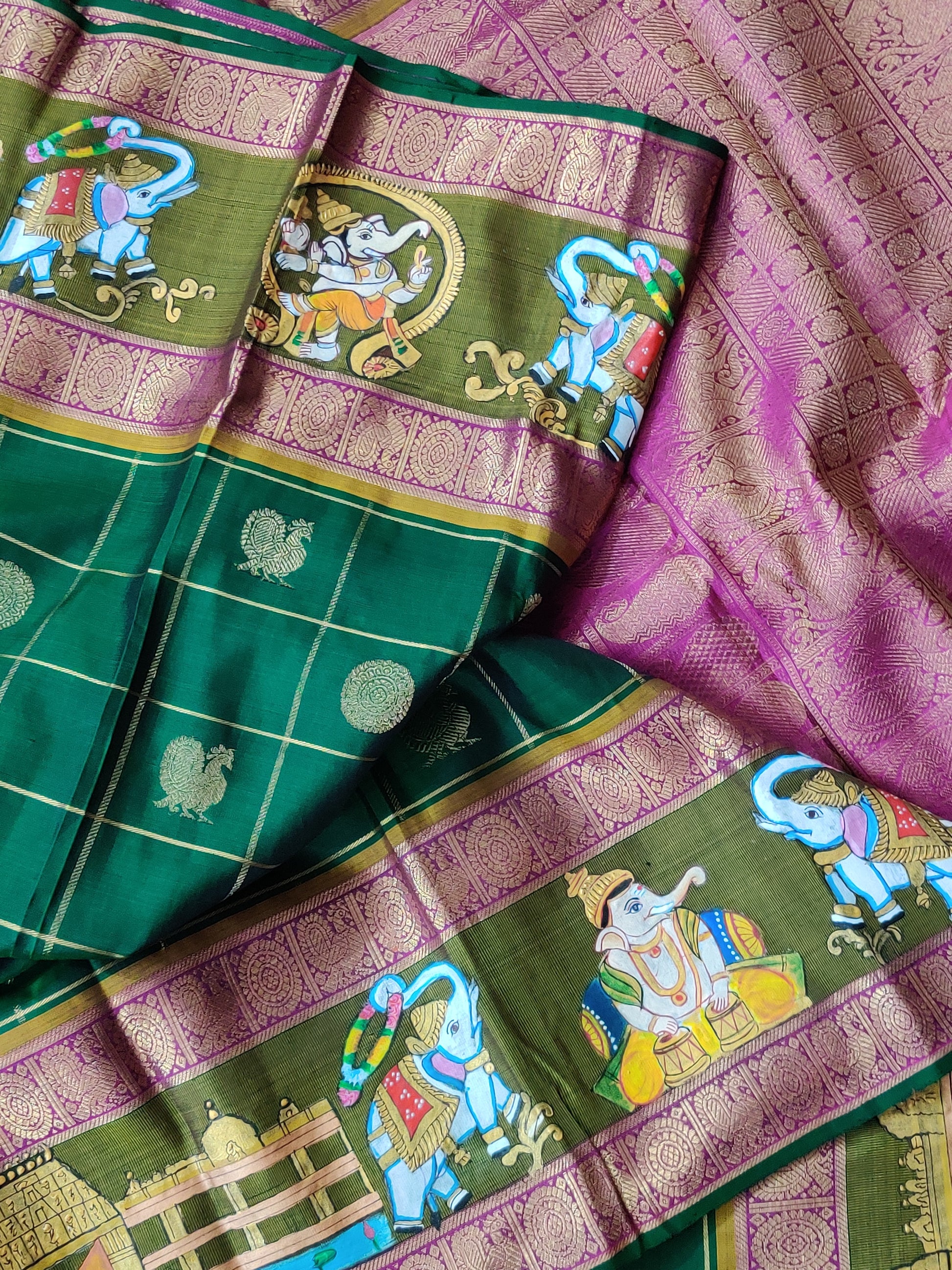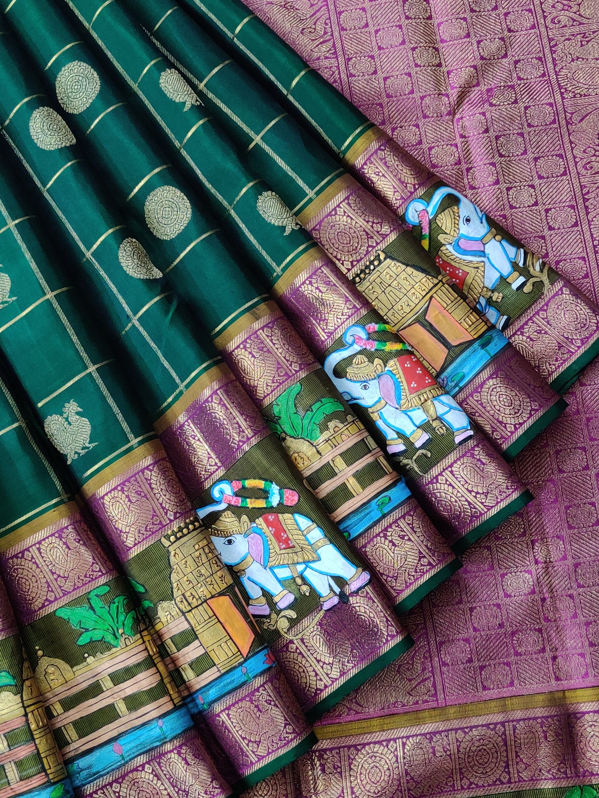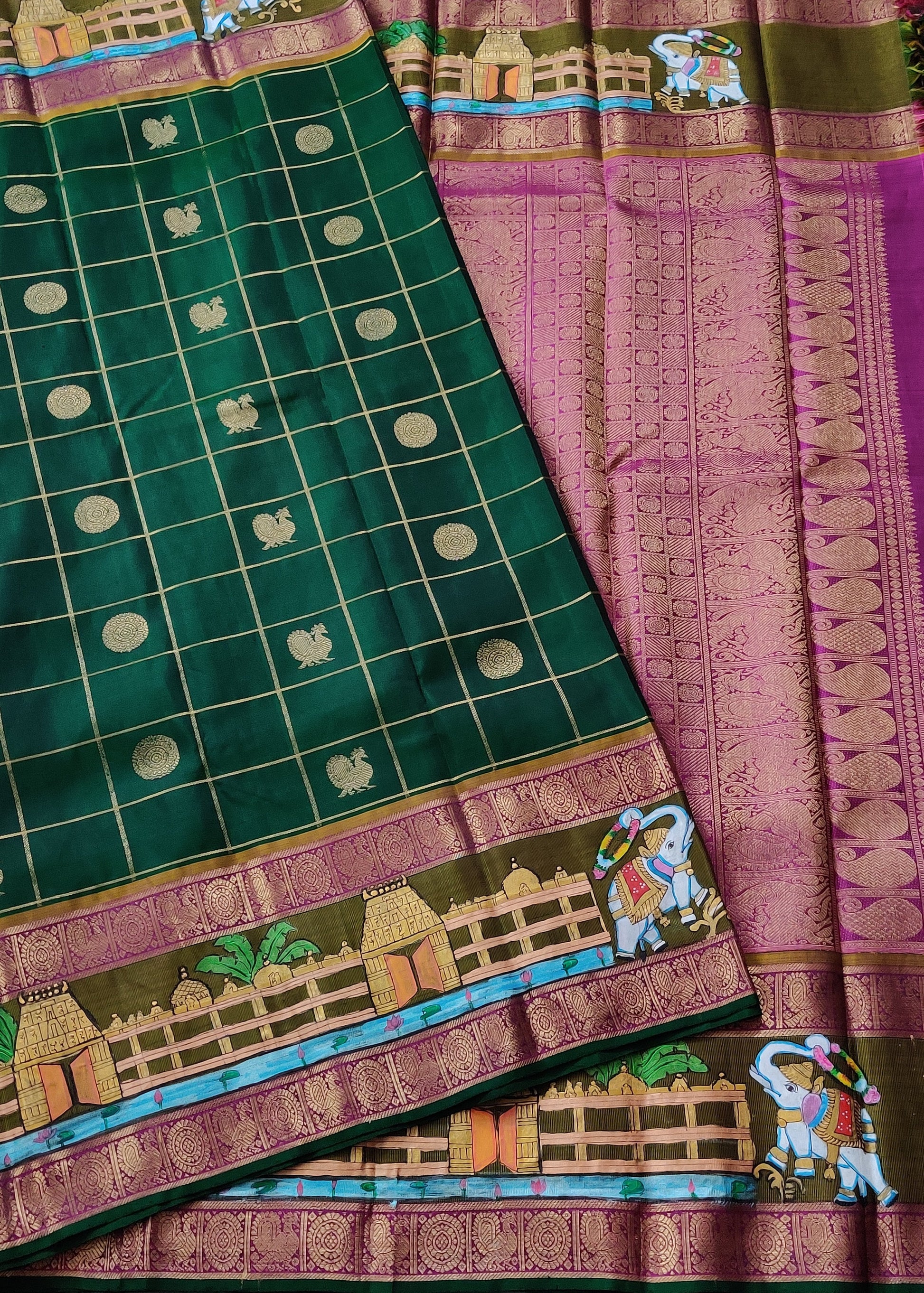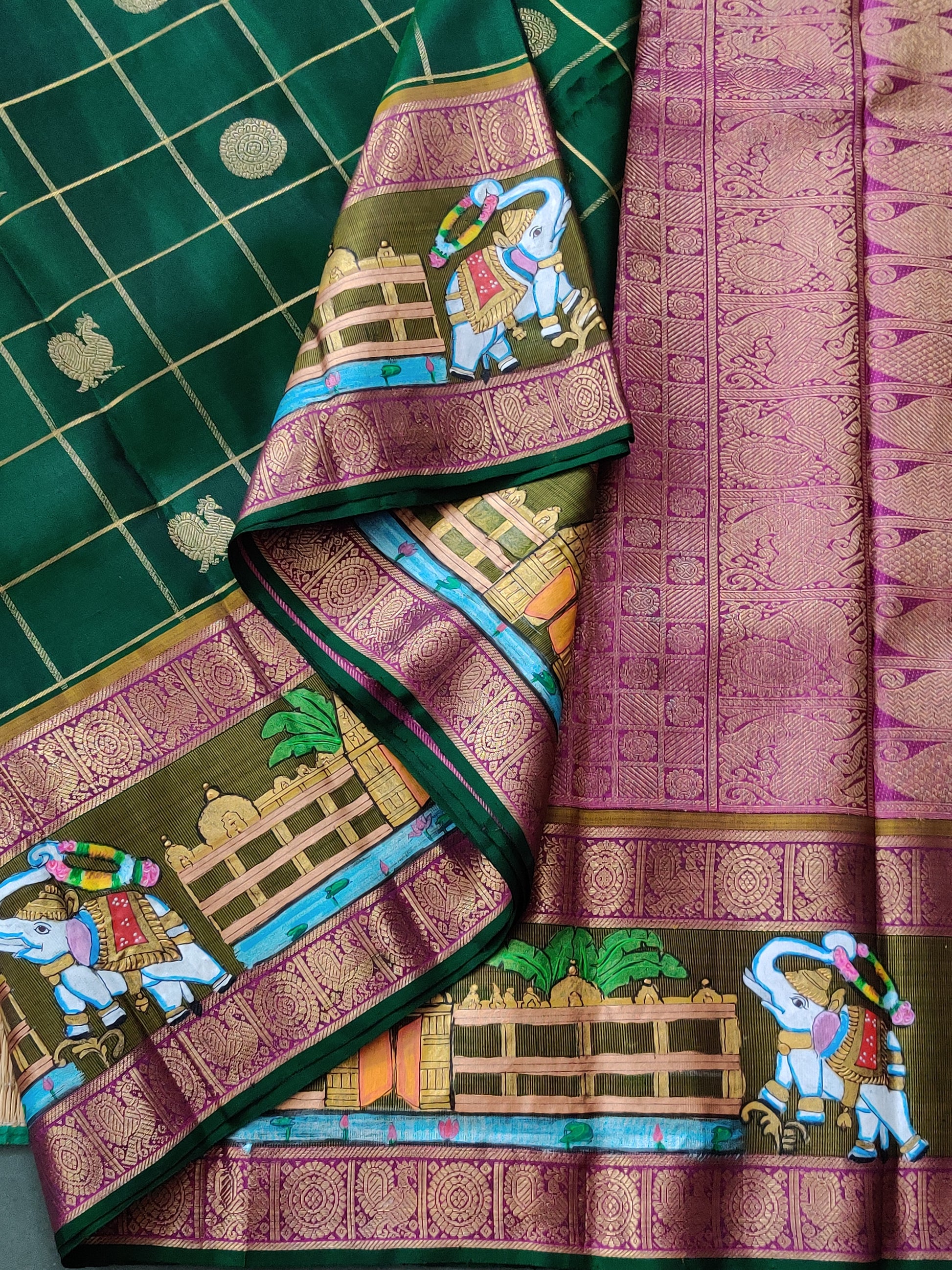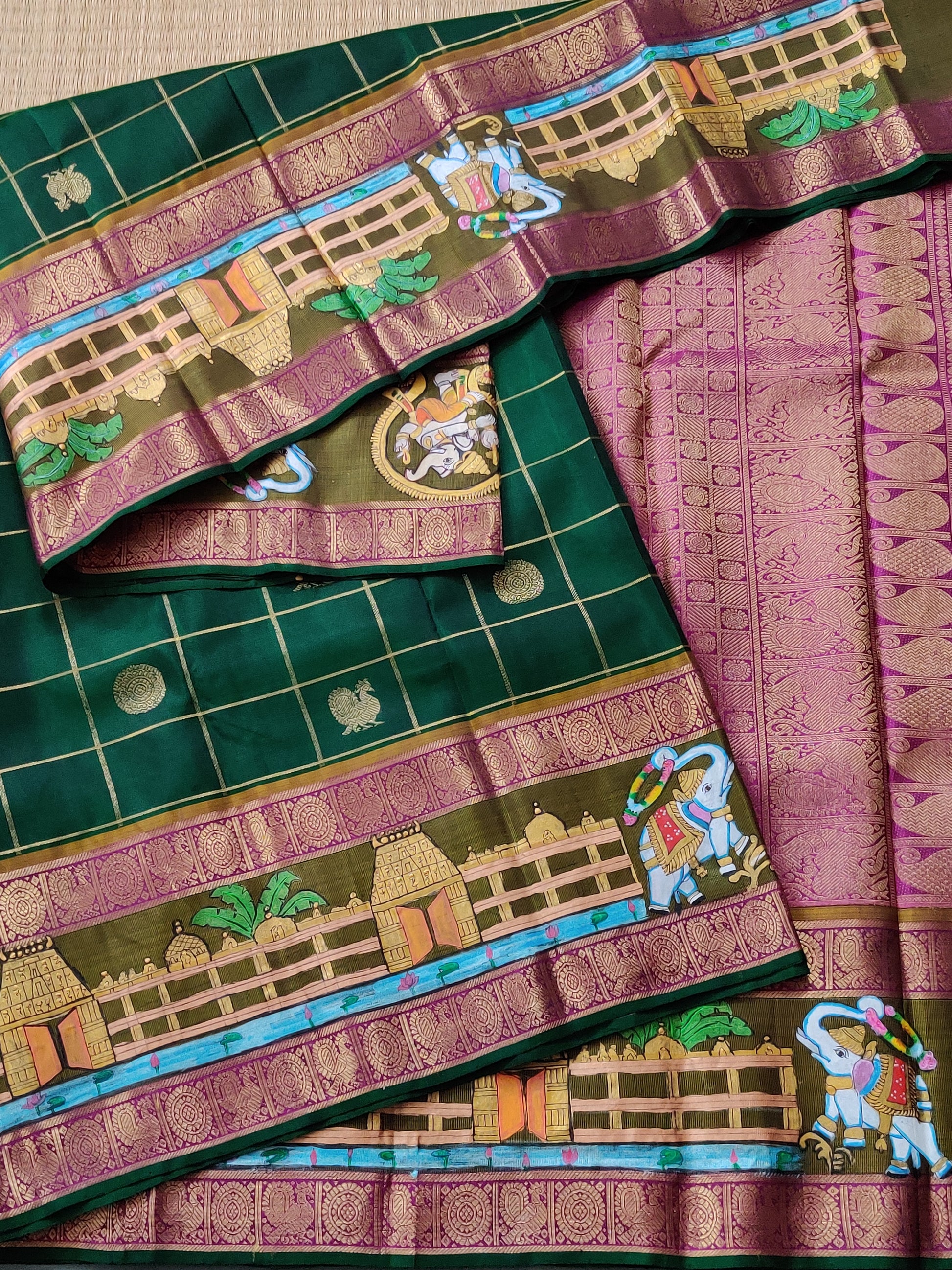 Experience timeless elegance with this dark green Kanchivaram silk saree featuring intricate zari checks throughout. The exquisite pattachitra hand-painted border adds a unique artistic touch, beautifully complemented by a vibrant magenta zari pallu and coordinating magenta blouse. A masterful blend of traditional craftsmanship and rich textures, this saree is perfect for special occasions where refined sophistication is paramount.
