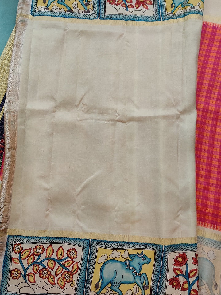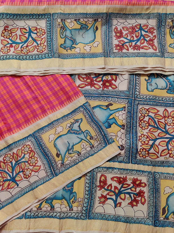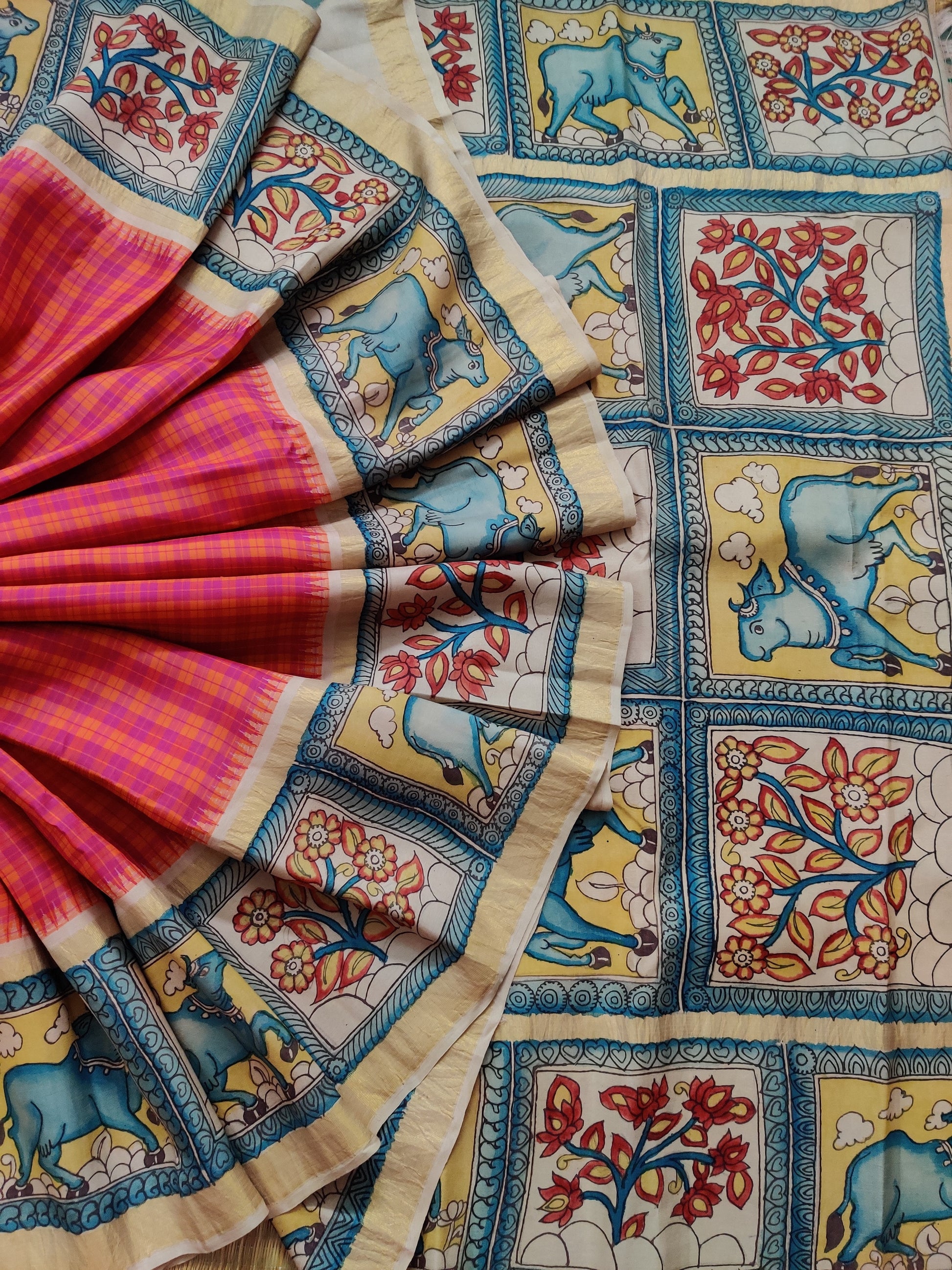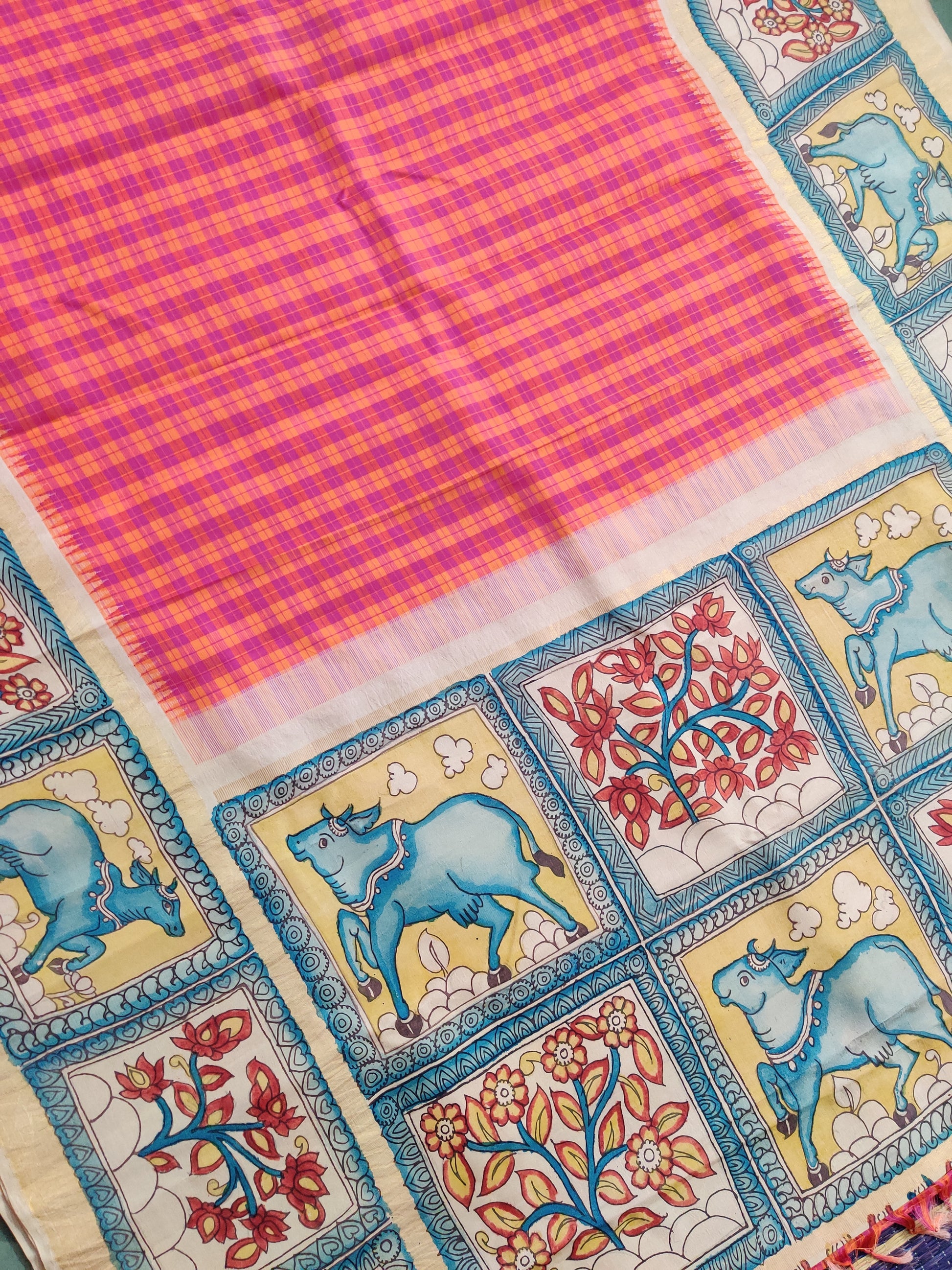 Expertly crafted, this kanchivaram saree features a striking combination of pink and orange pure silk with a hand painted pichwai concept kalamkari border and pallu. The checks motif body adds a touch of traditional charm, while the contrast cream blouse completes the look. Perfect for any occasion.