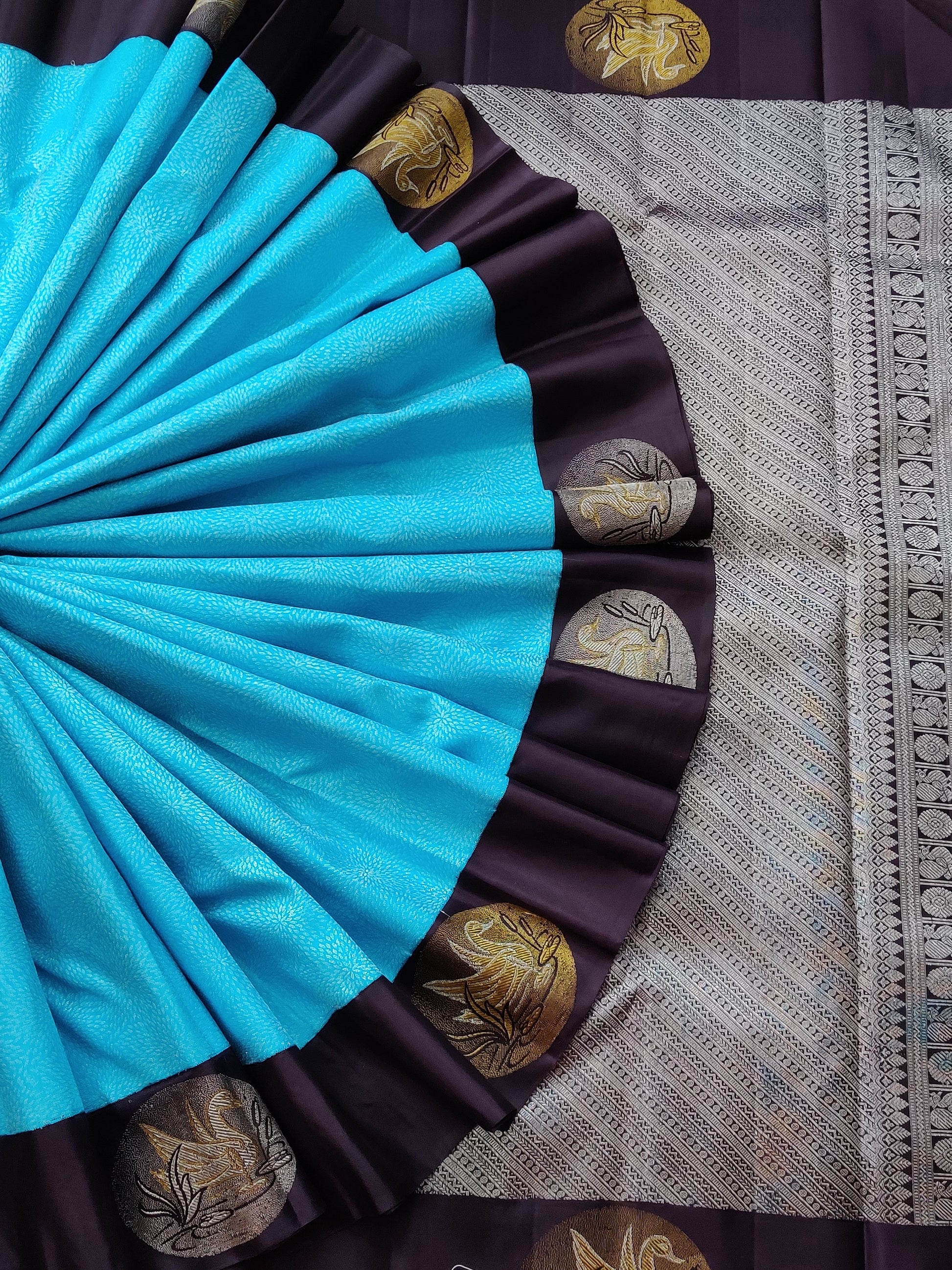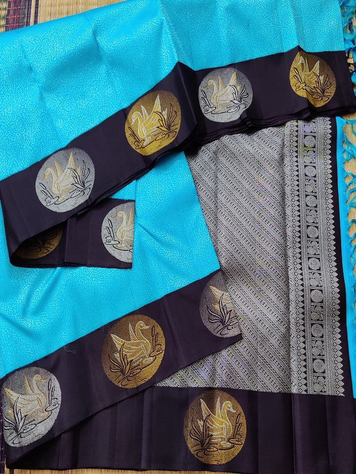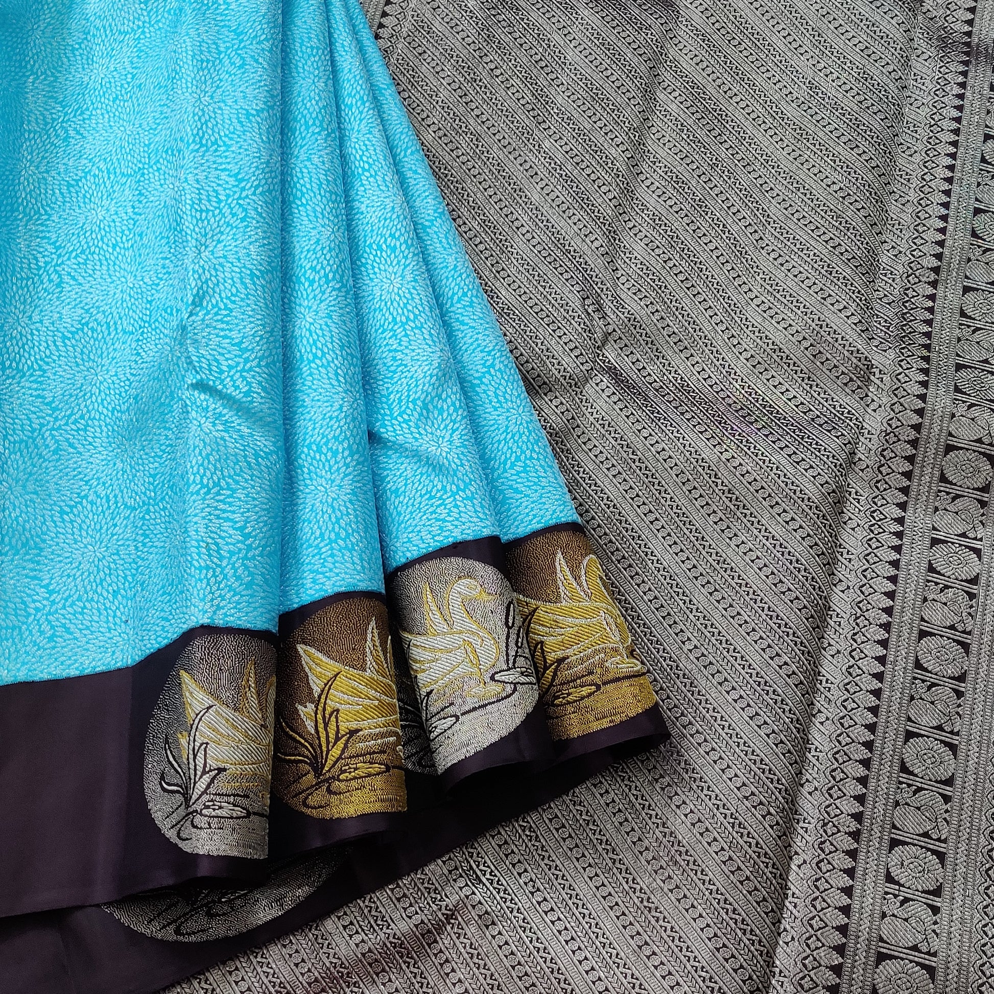 Indulge in traditional elegance with our sky blue kanchivaram silk saree. Adorned with intricate silver zari motifs and a contrasting black zari border & pallu, this saree exudes timeless charm. Expertly crafted with pure silk, it offers a luxurious feel and pairs perfectly with the accompanying plain blouse.