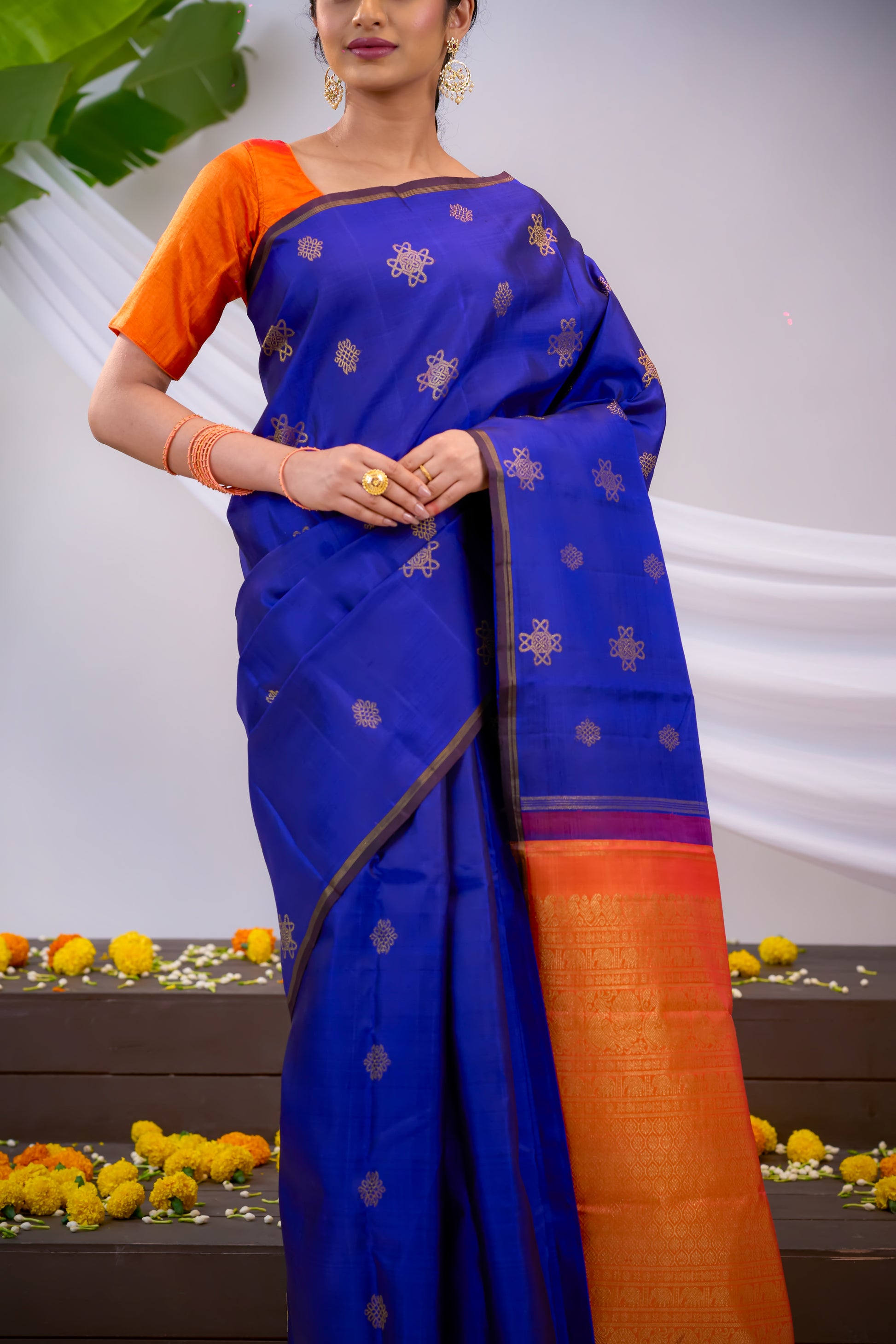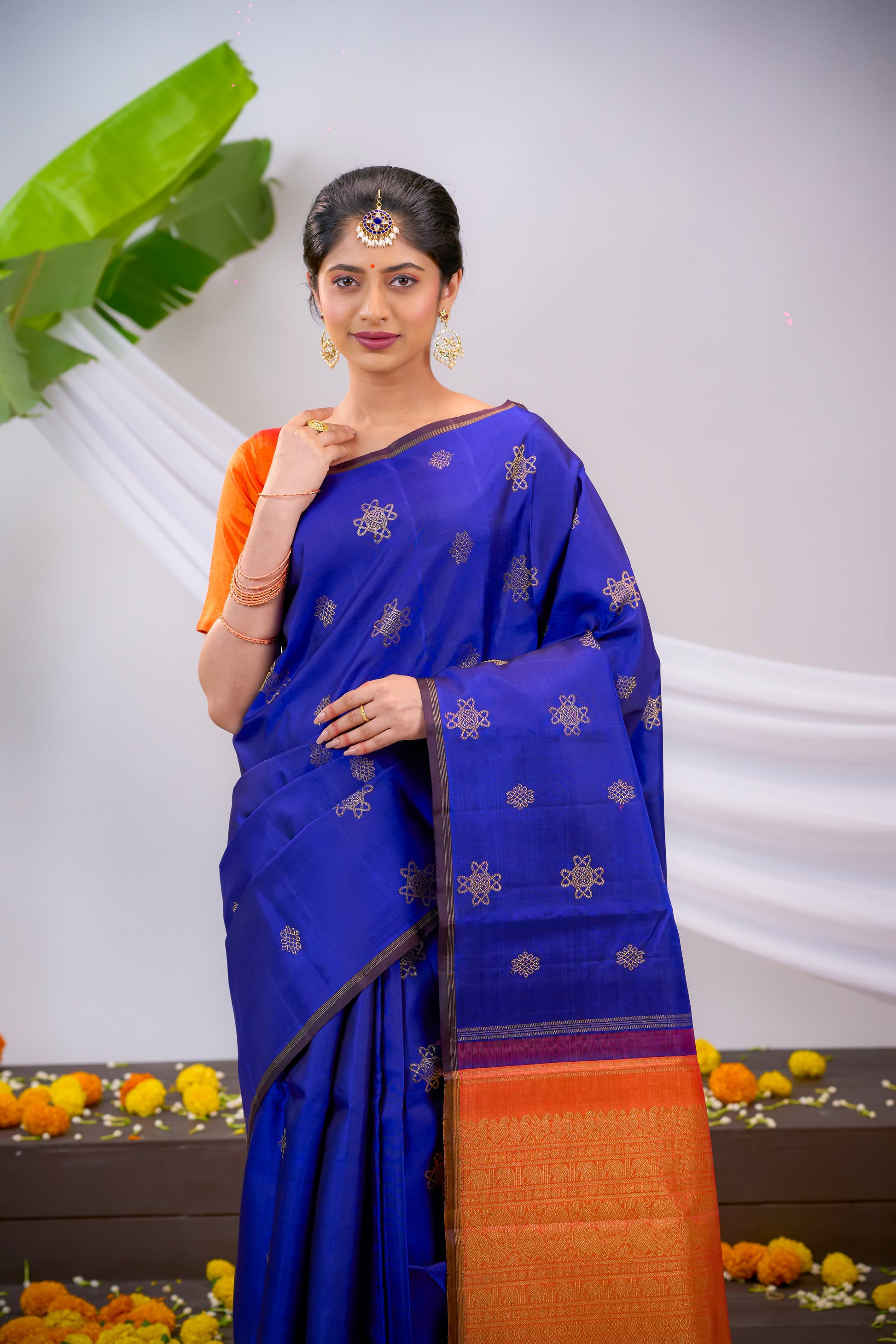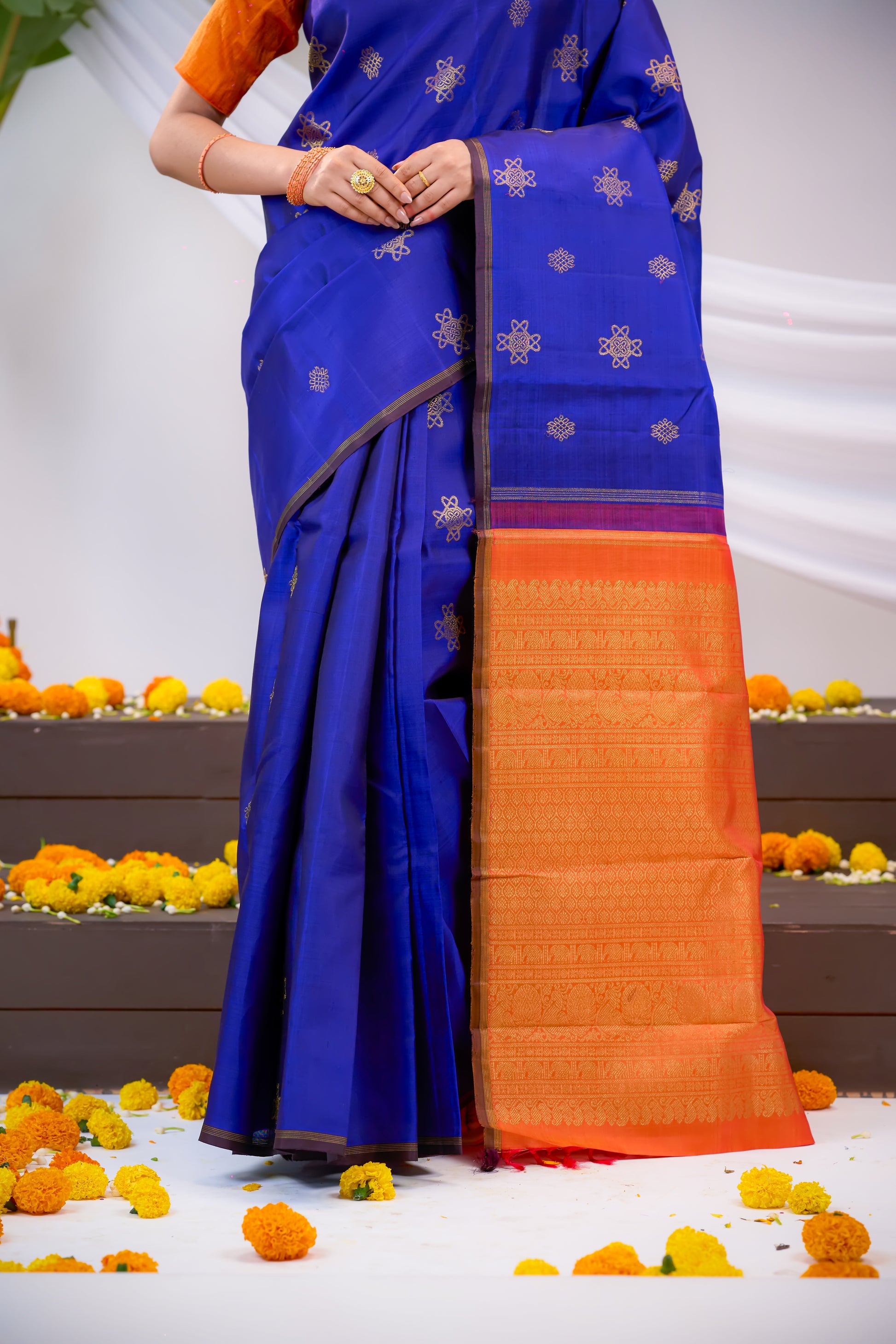 This elegant pure silk saree features a beautiful blue colour and intricate kolam zari butta design, accented with pure zari for a touch of opulence. The contrast orange zari pallu and plain blouse add a pop of colour to this traditional Kanchivaram saree, making it a must-have for any special occasion.