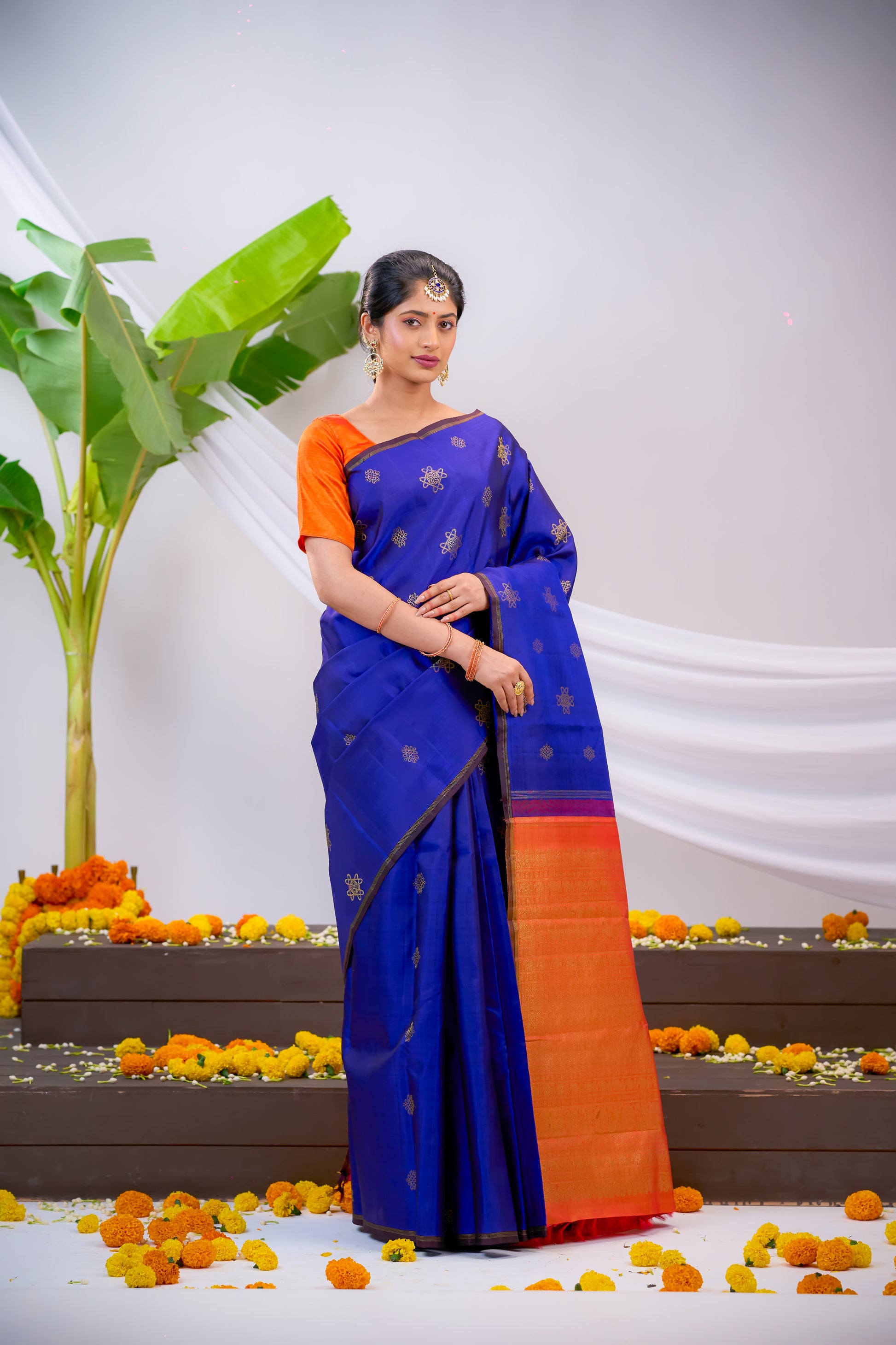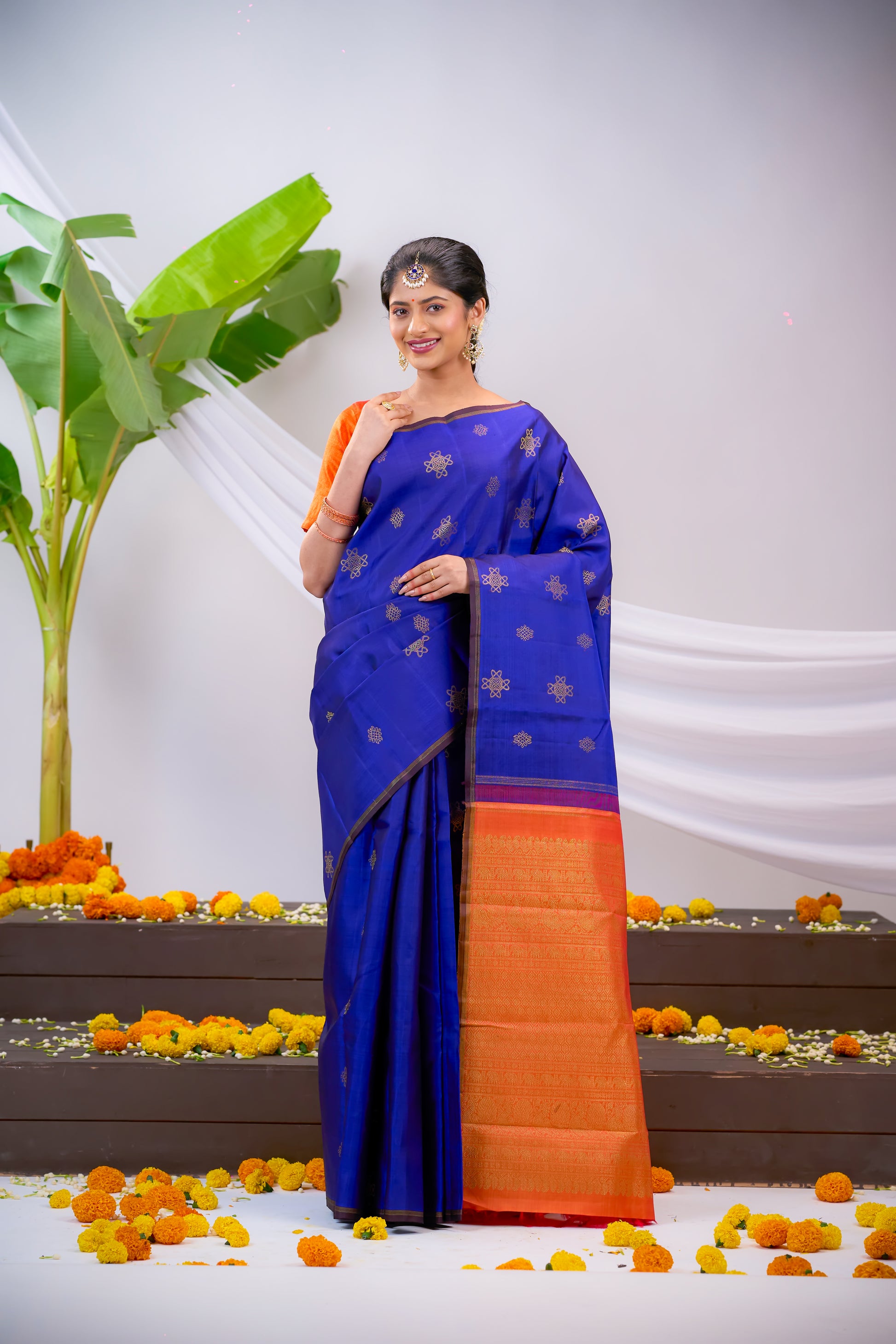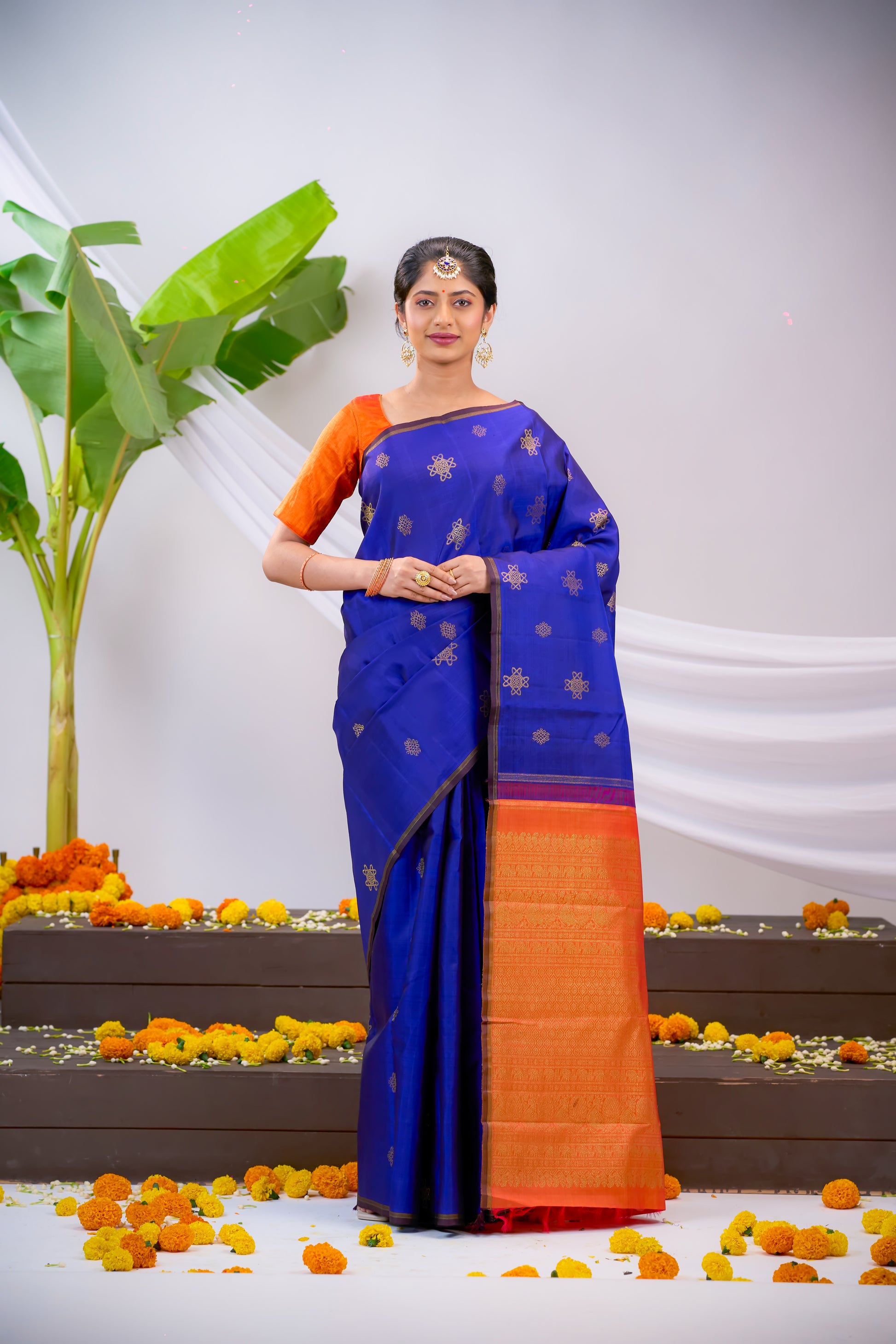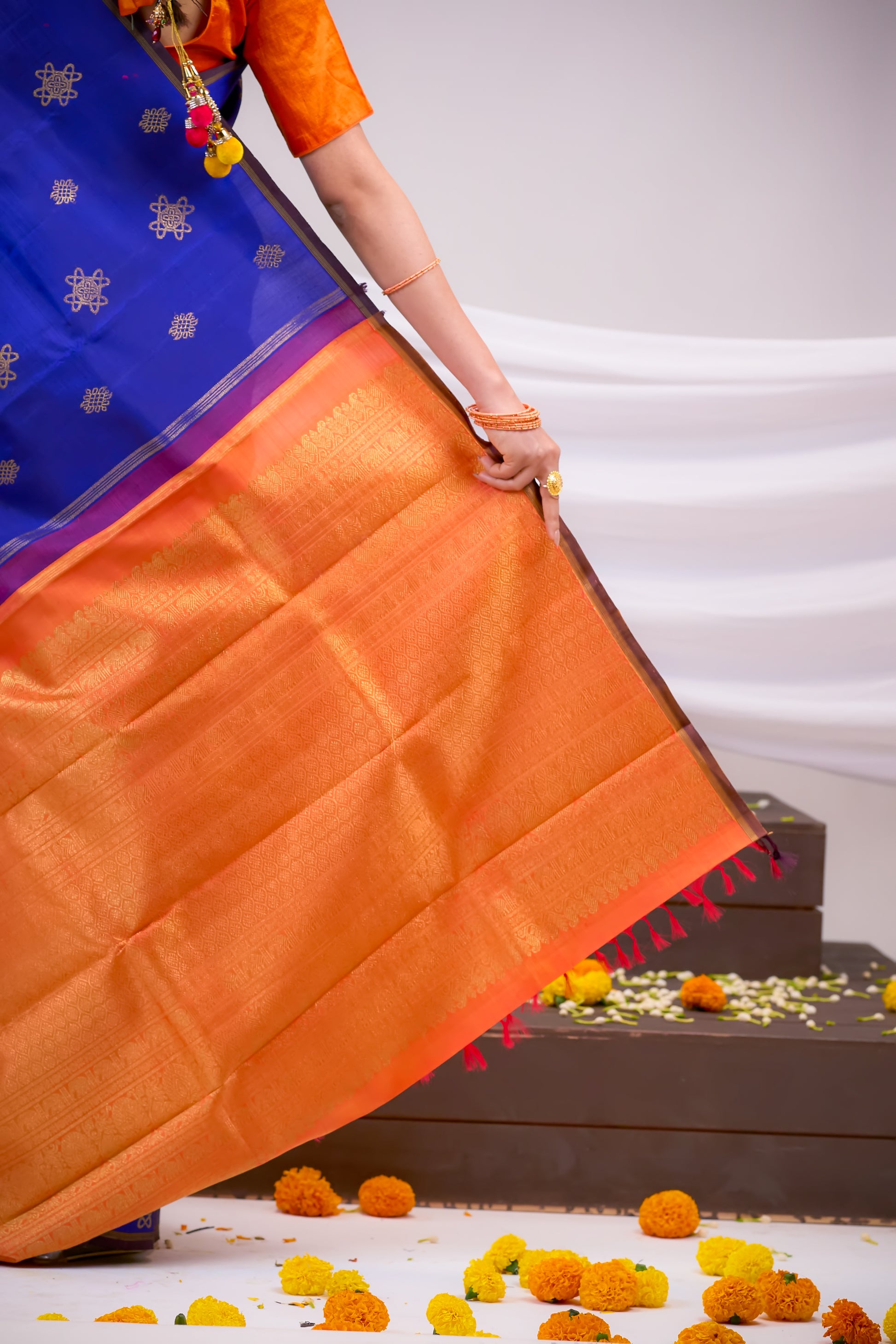 This elegant pure silk saree features a beautiful blue colour and intricate kolam zari butta design, accented with pure zari for a touch of opulence. The contrast orange zari pallu and plain blouse add a pop of colour to this traditional Kanchivaram saree, making it a must-have for any special occasion.