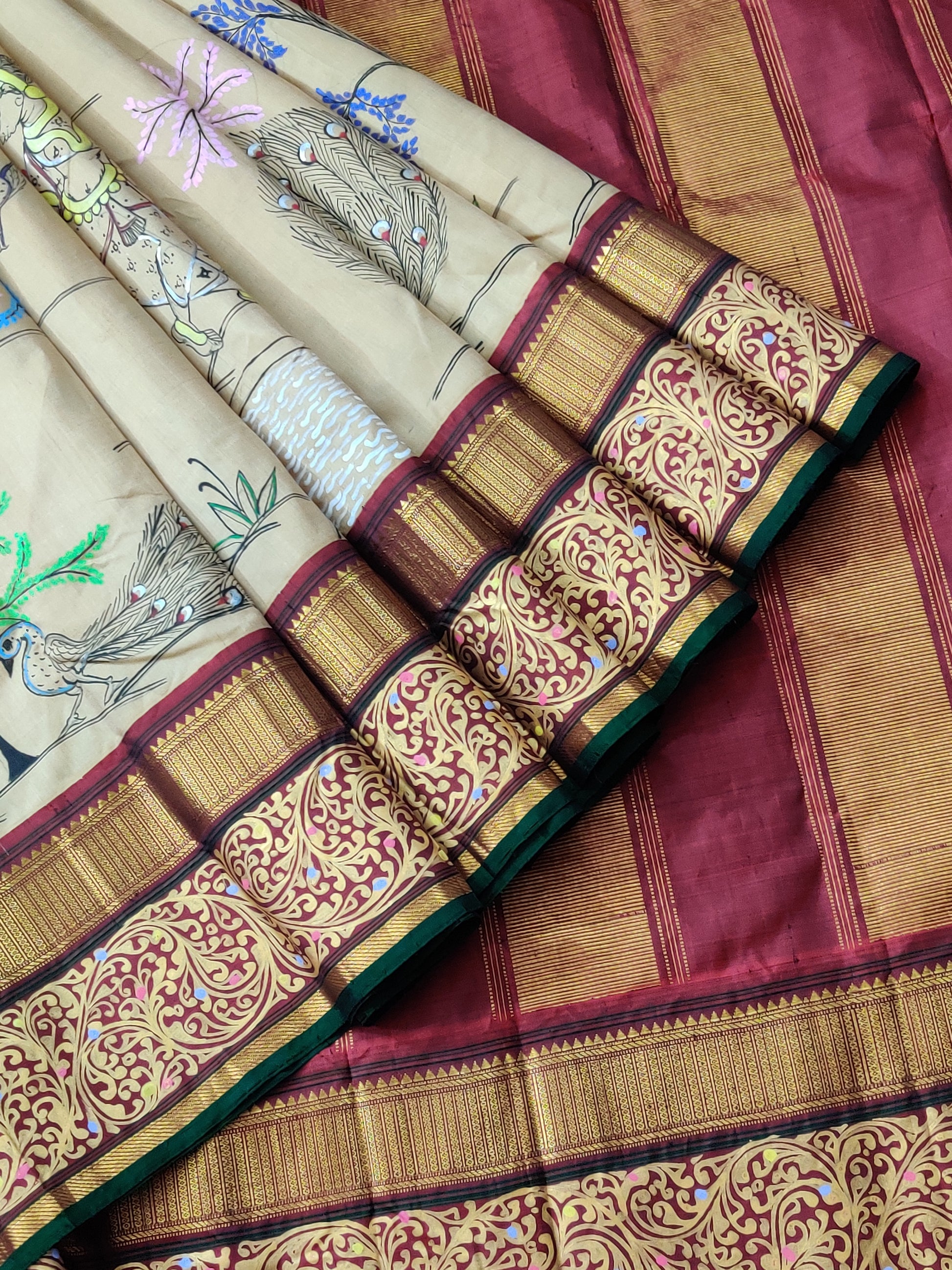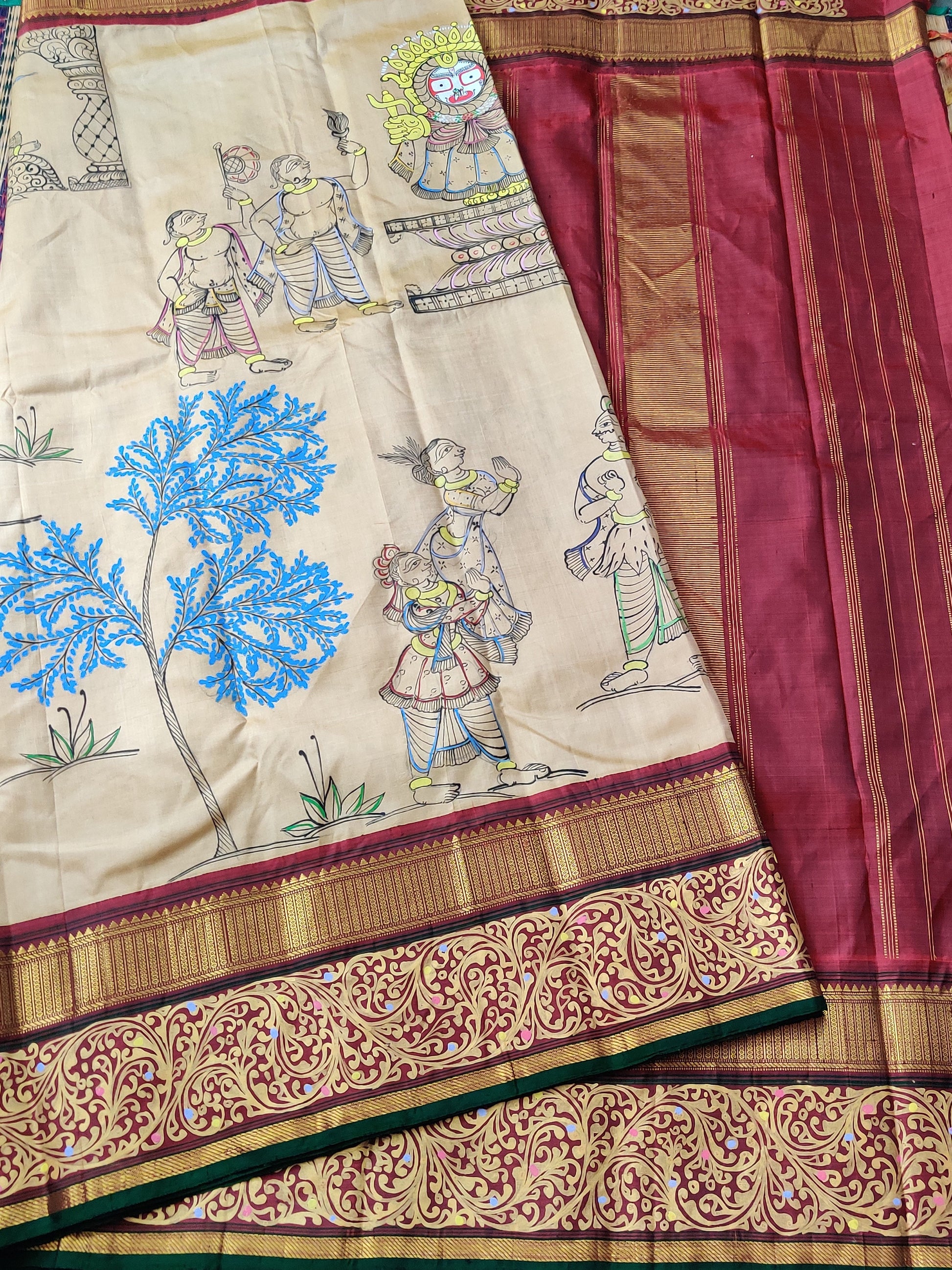 Cream Colour Kanchivaram Silk Saree With Pattachitra Hand Painting All Over Code : KA089