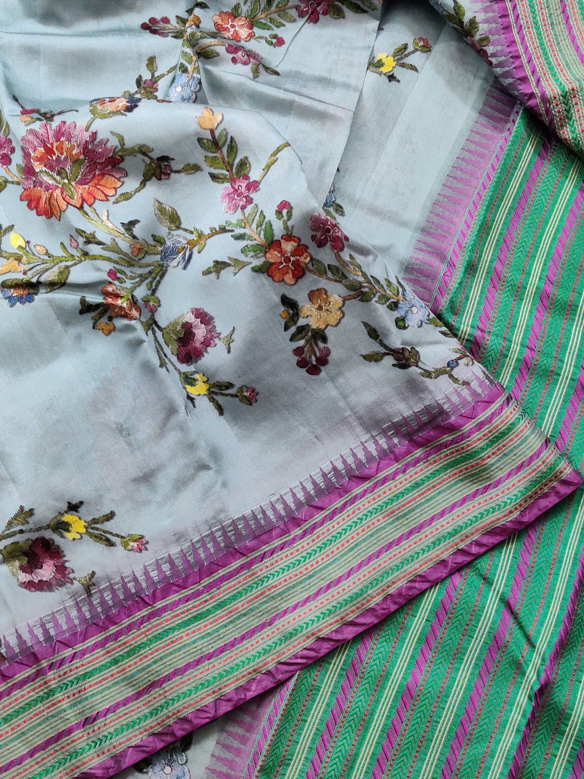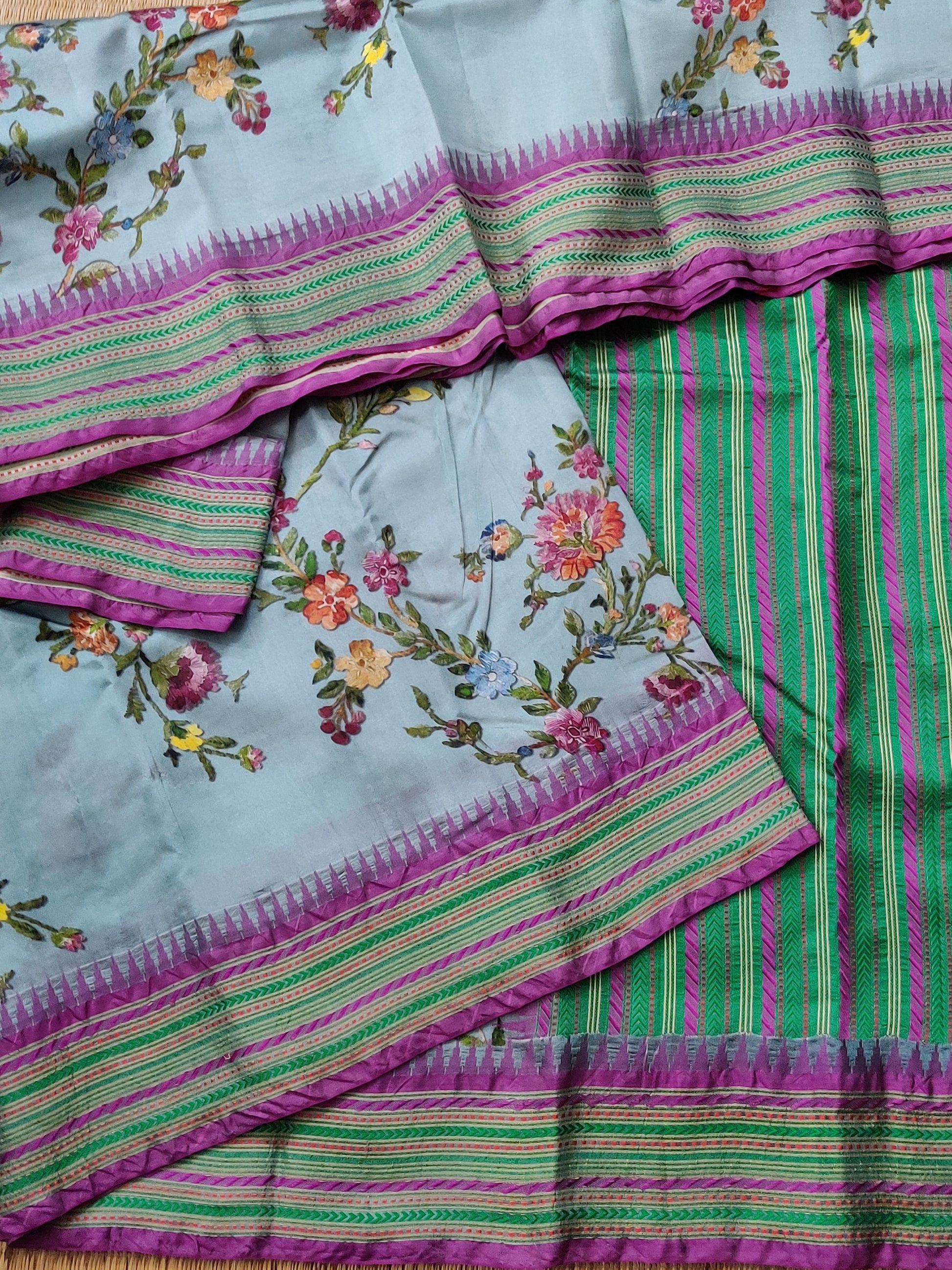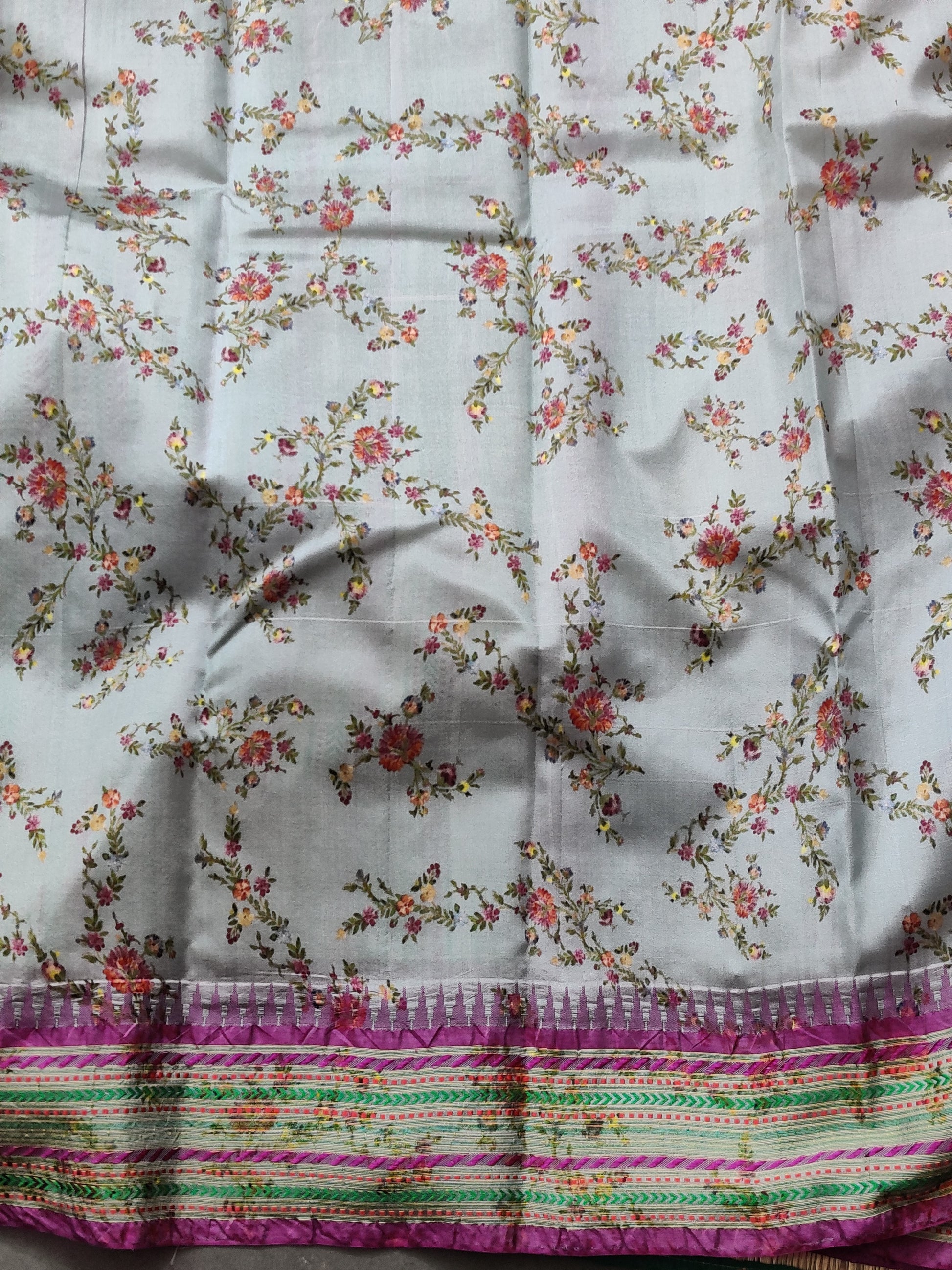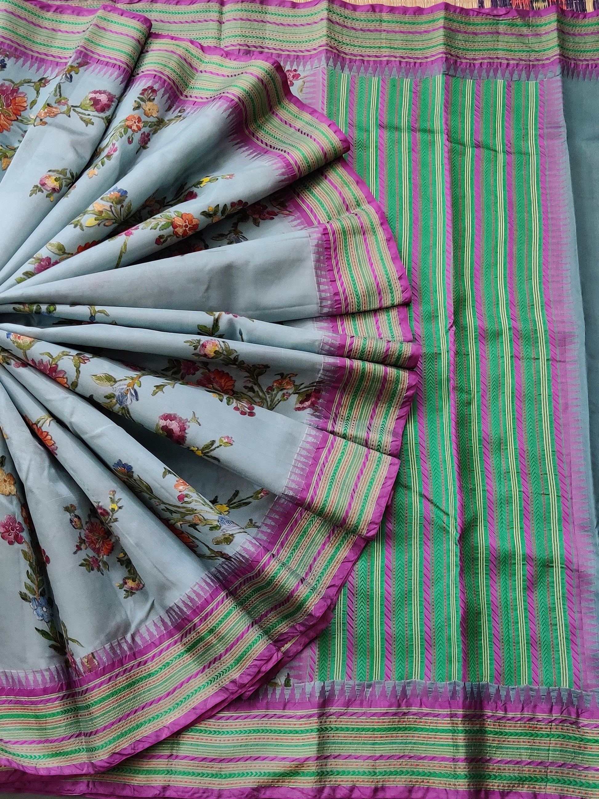 Experience elegance and sophistication with our sea blue silk saree. Featuring a stunning digital floral print, this saree is perfect for any occasion. The magenta thread woven pallu and border add a touch of vibrancy to this traditional ensemble. Complete the look with our self color blouse.