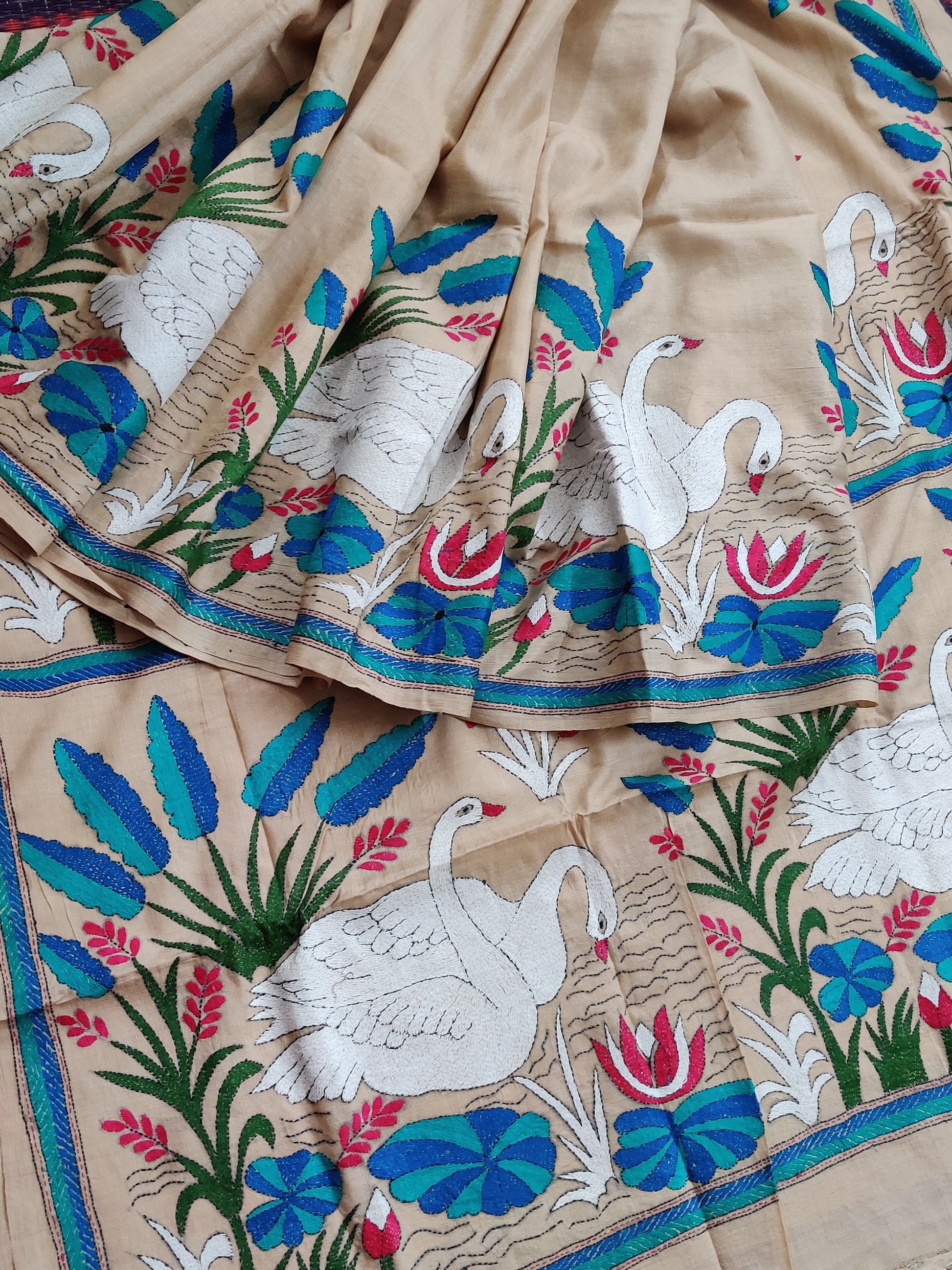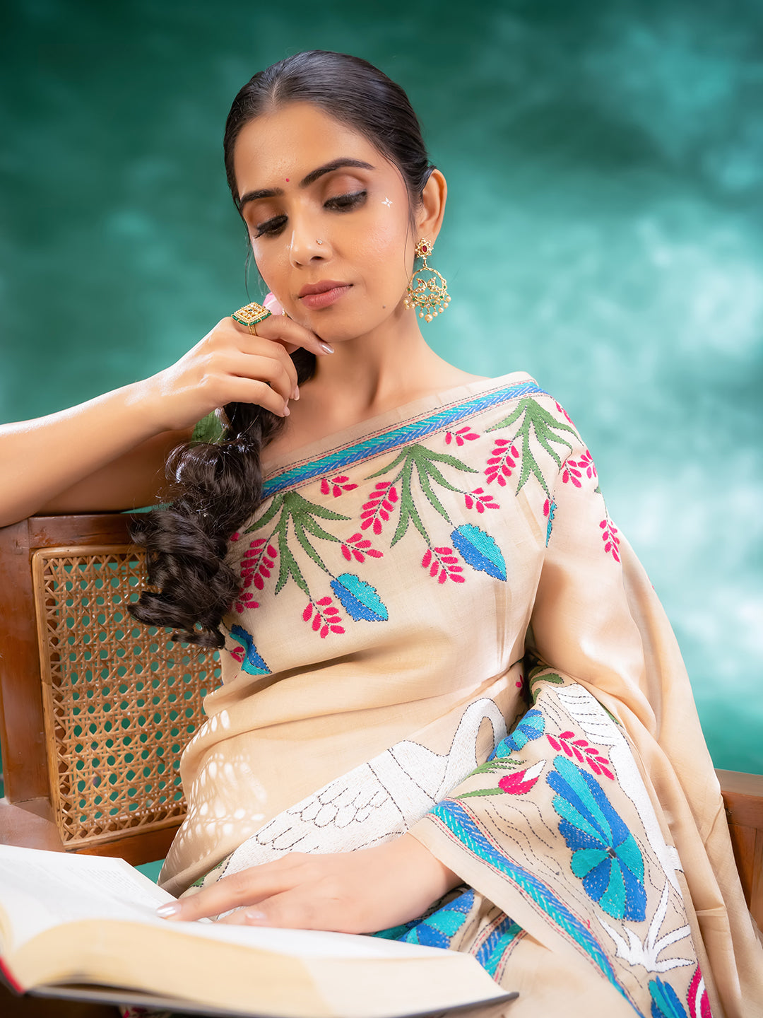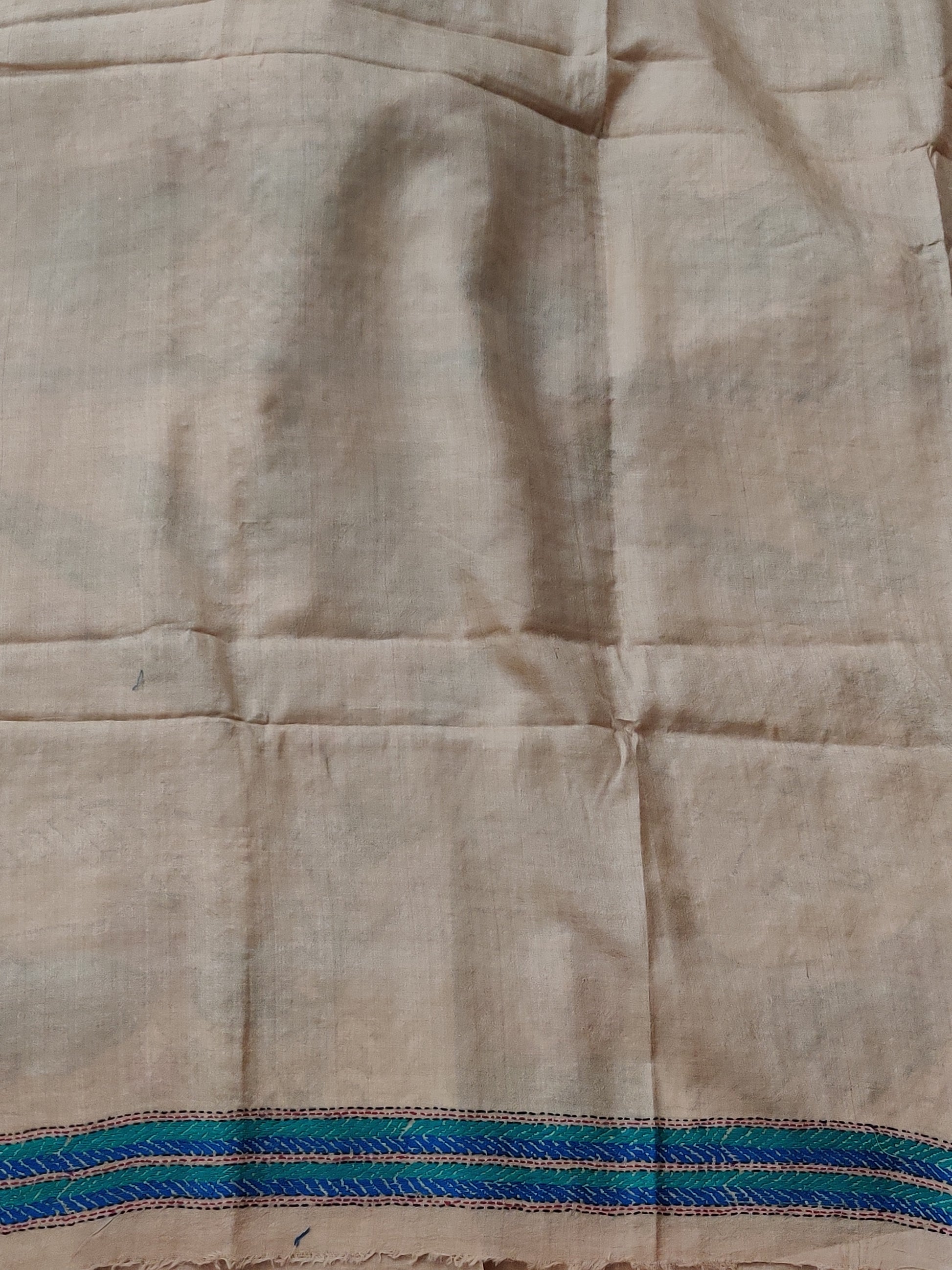 Experience the elegance and sophistication of our Cream Tussar Silk Saree. With intricate kantha work adorning the entire saree and a beautifully designed kantha duck motif pallu and border, this saree is the epitome of luxury. The self-coloured plain blouse adds the perfect finishing touch. Elevate your style with this one-of-a-kind saree.