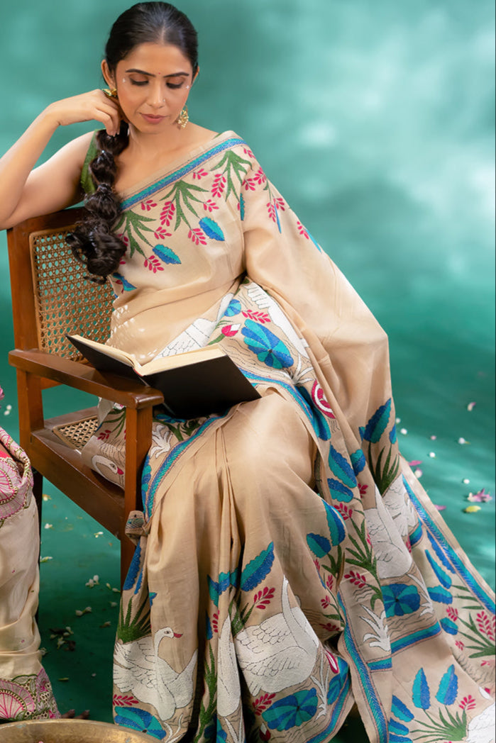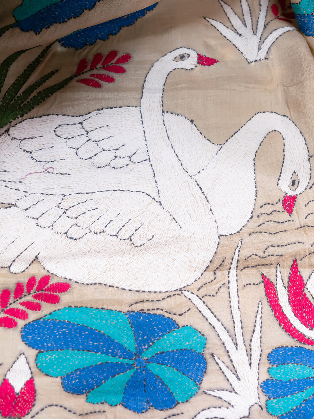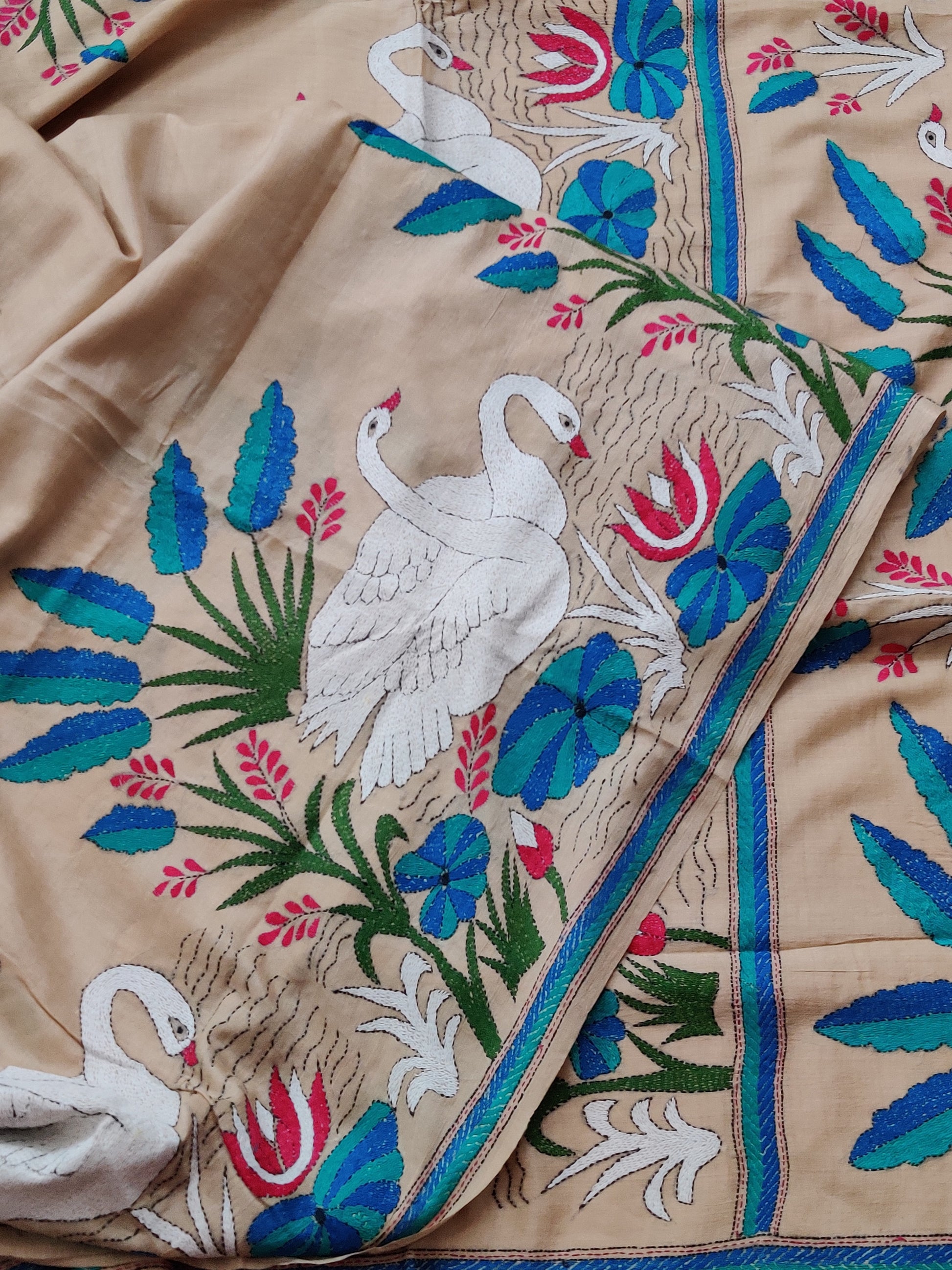 Experience the elegance and sophistication of our Cream Tussar Silk Saree. With intricate kantha work adorning the entire saree and a beautifully designed kantha duck motif pallu and border, this saree is the epitome of luxury. The self-coloured plain blouse adds the perfect finishing touch. Elevate your style with this one-of-a-kind saree.