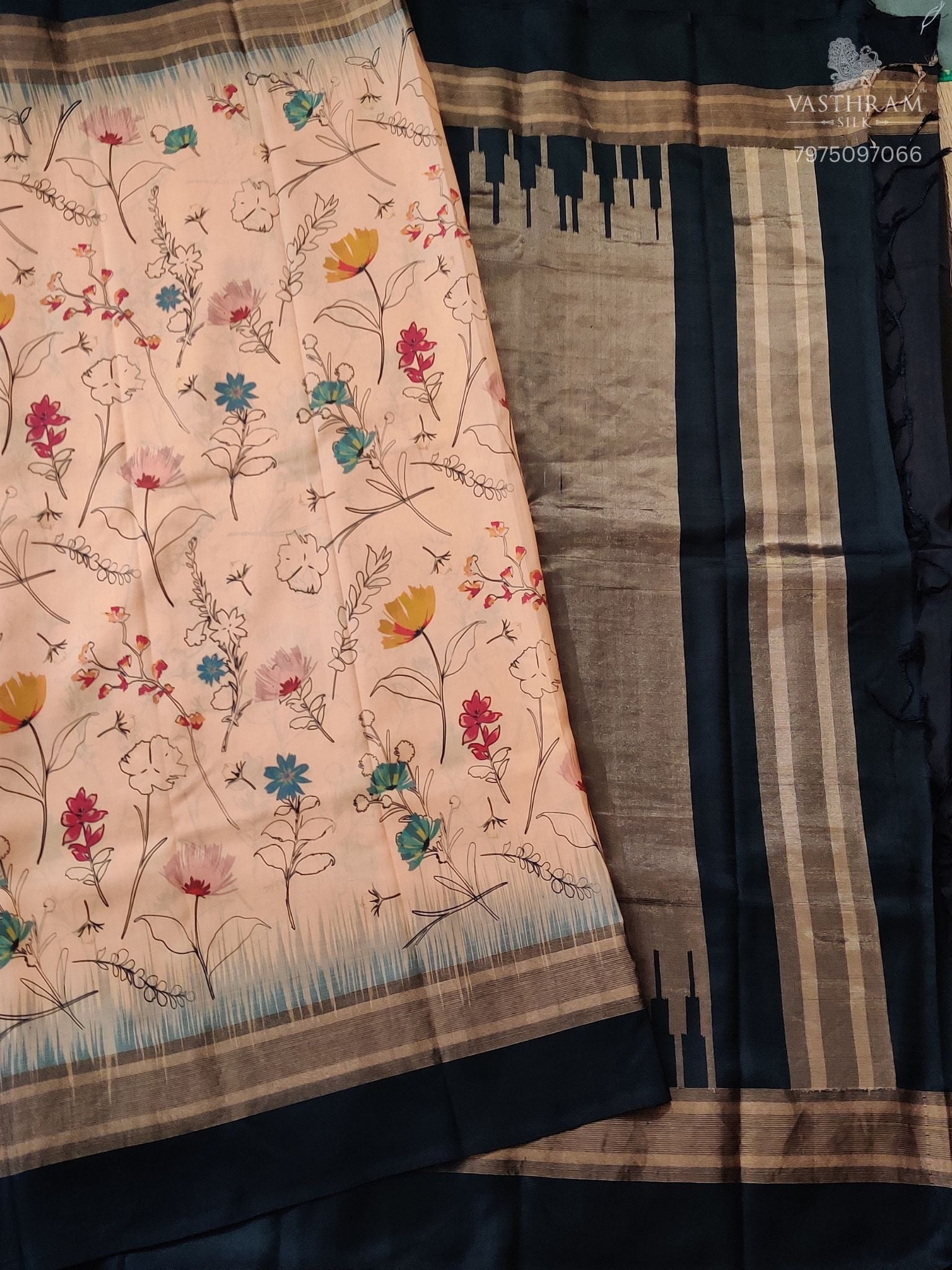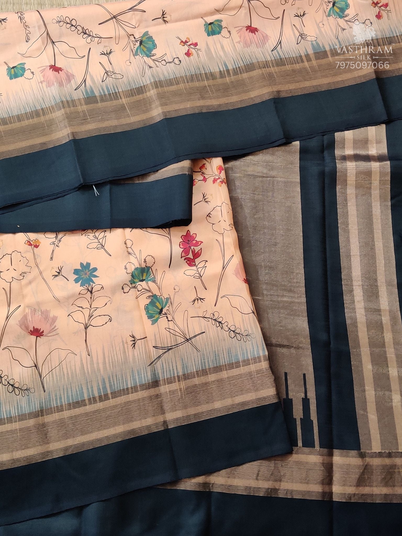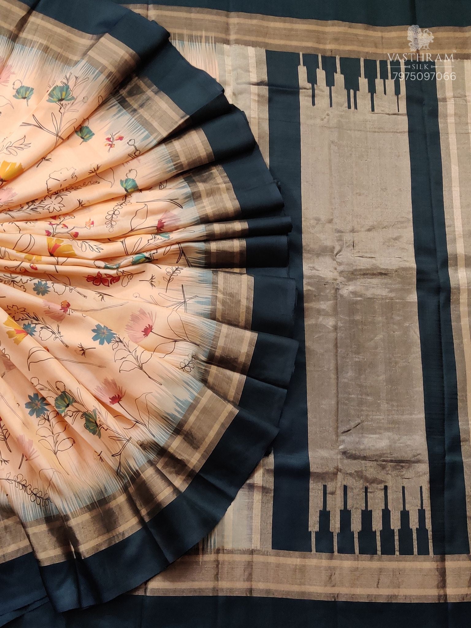 Elevate your wardrobe with this light orange soft silk saree, a masterpiece of refined craftsmanship. The premium silk drapes beautifully, offering a luxurious feel that discerning wearers appreciate. Its understated digital floral print provides subtle sophistication, while the striking contrast black zari pallu and border create a compelling focal point. This versatile piece transitions seamlessly from traditional ceremonies to modern celebrations, balancing minimalist aesthetics with impactful design. The included plain blouse offers styling flexibility, allowing you to customize your look. A distinguished choice for those who value quality, timeless appeal, and understated elegance in their silk saree collection.