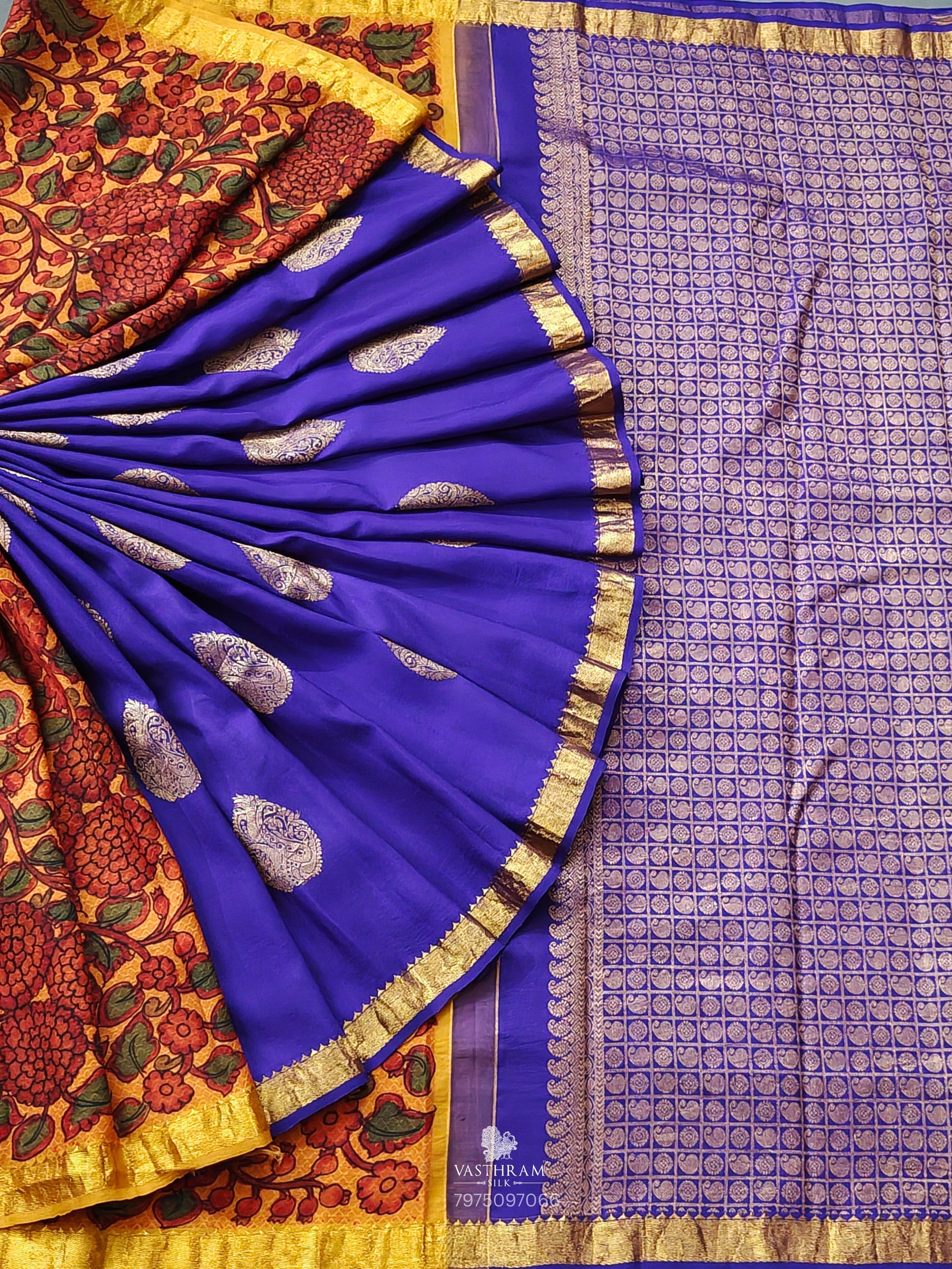 Elevate your ethnic wardrobe with this stunning orange Kanchivaram silk saree, a masterpiece of traditional craftsmanship. The fabric showcases exquisite pen kalamkari work meticulously rendered across the entire drape, creating an intricate tapestry of artistic detail. The saree is complemented by a striking contrast purple zari pallu and matching zari border that add regal sophistication and visual depth. Crafted from partly Kanchivaram silk, this saree balances comfort with luxury, making it ideal for festive occasions, weddings, and cultural celebrations. The accompanying plain blouse allows the saree's artistry to take center stage while offering versatile styling options. A timeless investment piece that celebrates heritage weaving techniques.