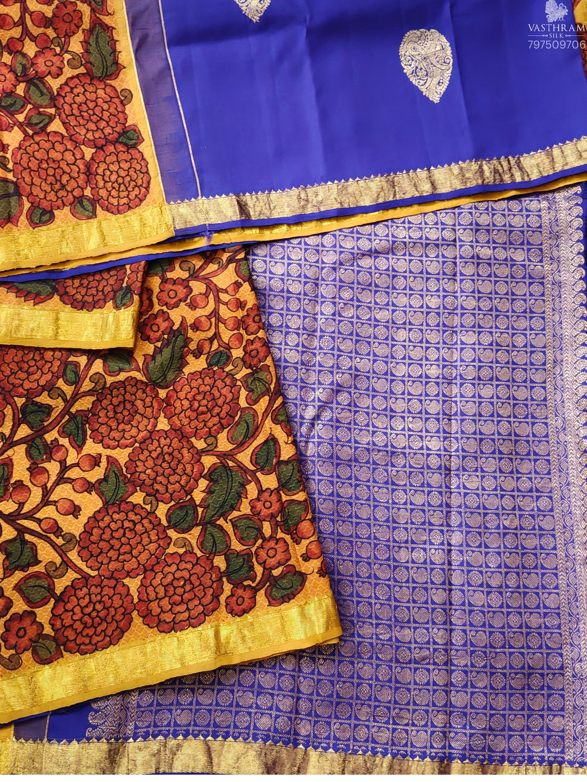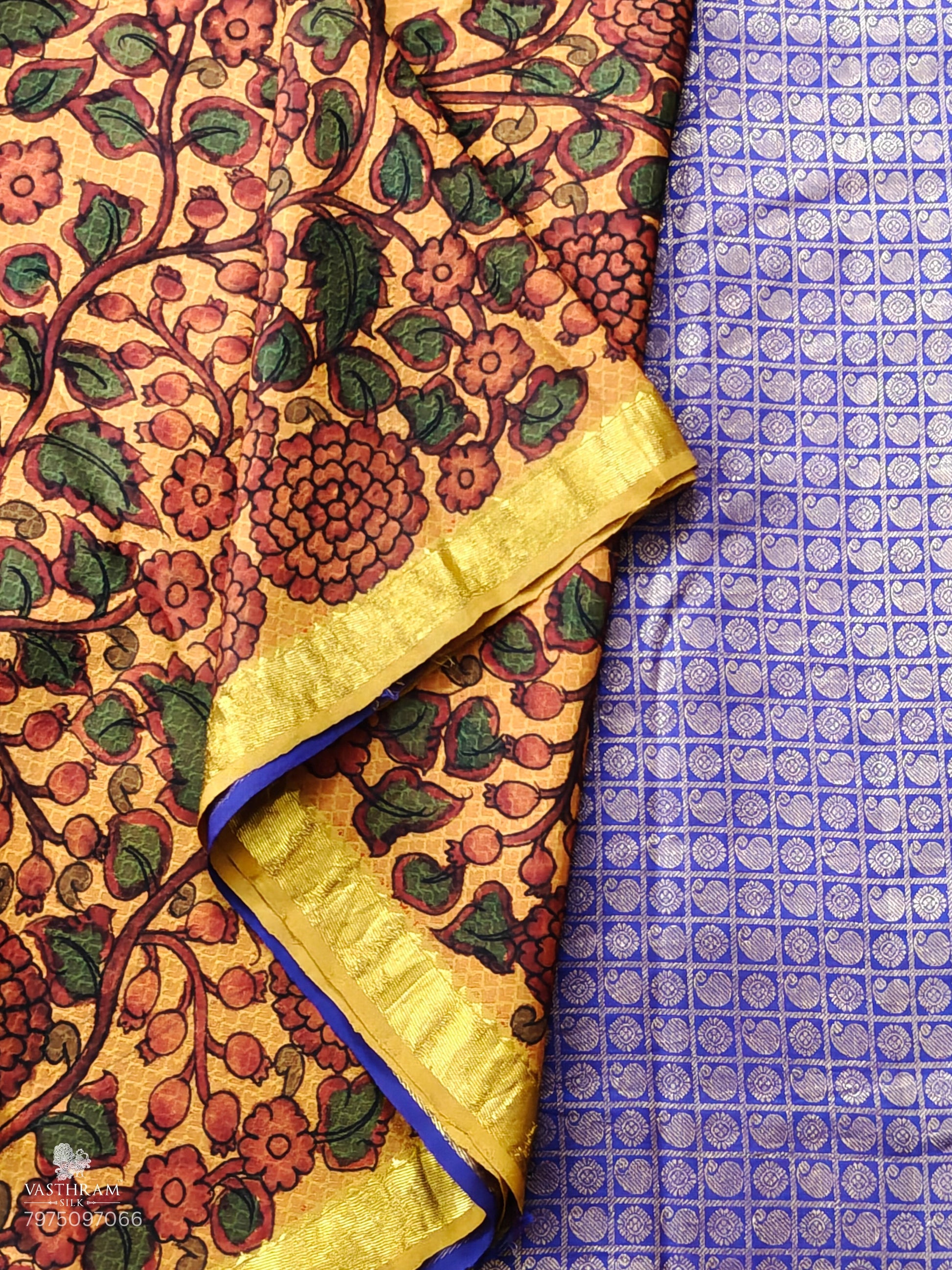 Orange Colour Partly Kanchivaram Silk Saree With Pen Kalamkari Work All Over Code : KA0398