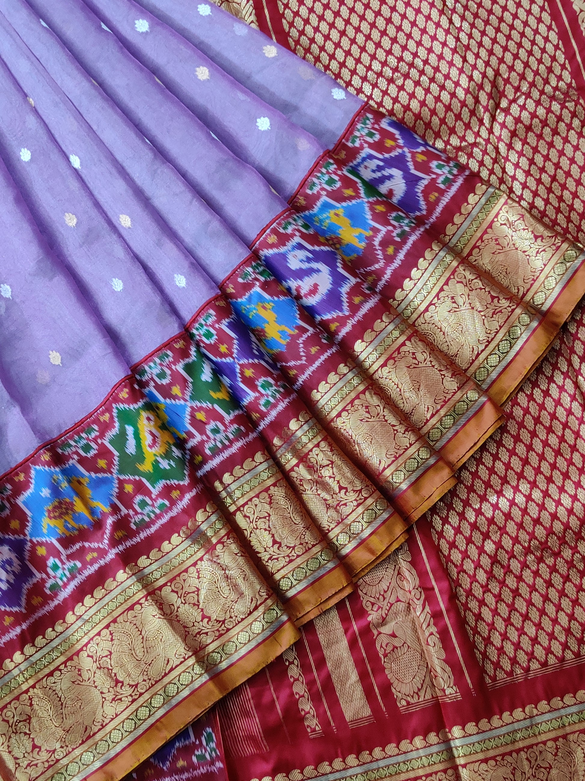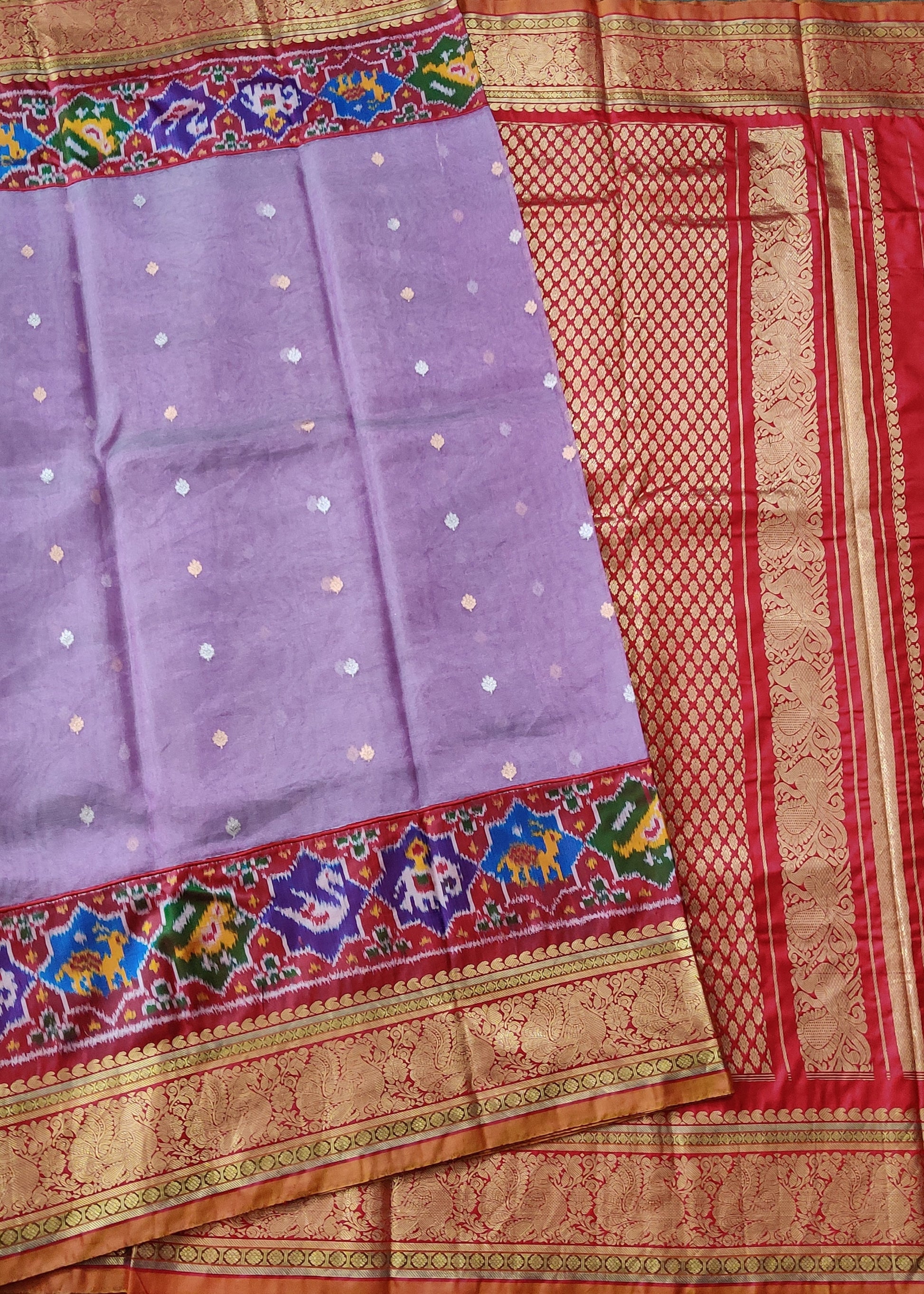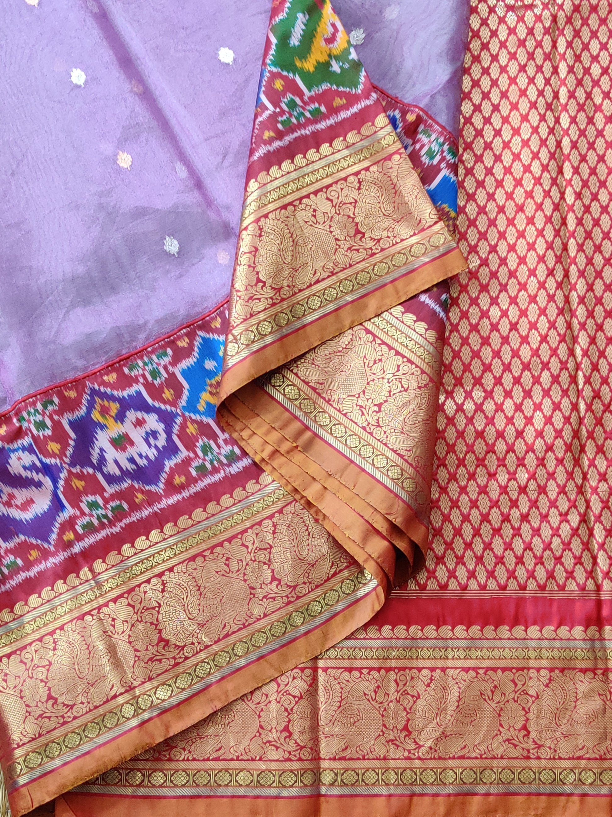 Elevate your ethnic collection with this elegant lavender ikkat and tissue organza fusion saree. Featuring intricate gold and silver small zari buttas spread gracefully across the fabric, it is complemented by a striking red zari border and pallu that add a rich contrast. The saree includes an ikkat woven blouse piece, enhancing its traditional charm. Perfect for festive occasions, this handcrafted piece merges timeless weaving techniques with modern sophistication.