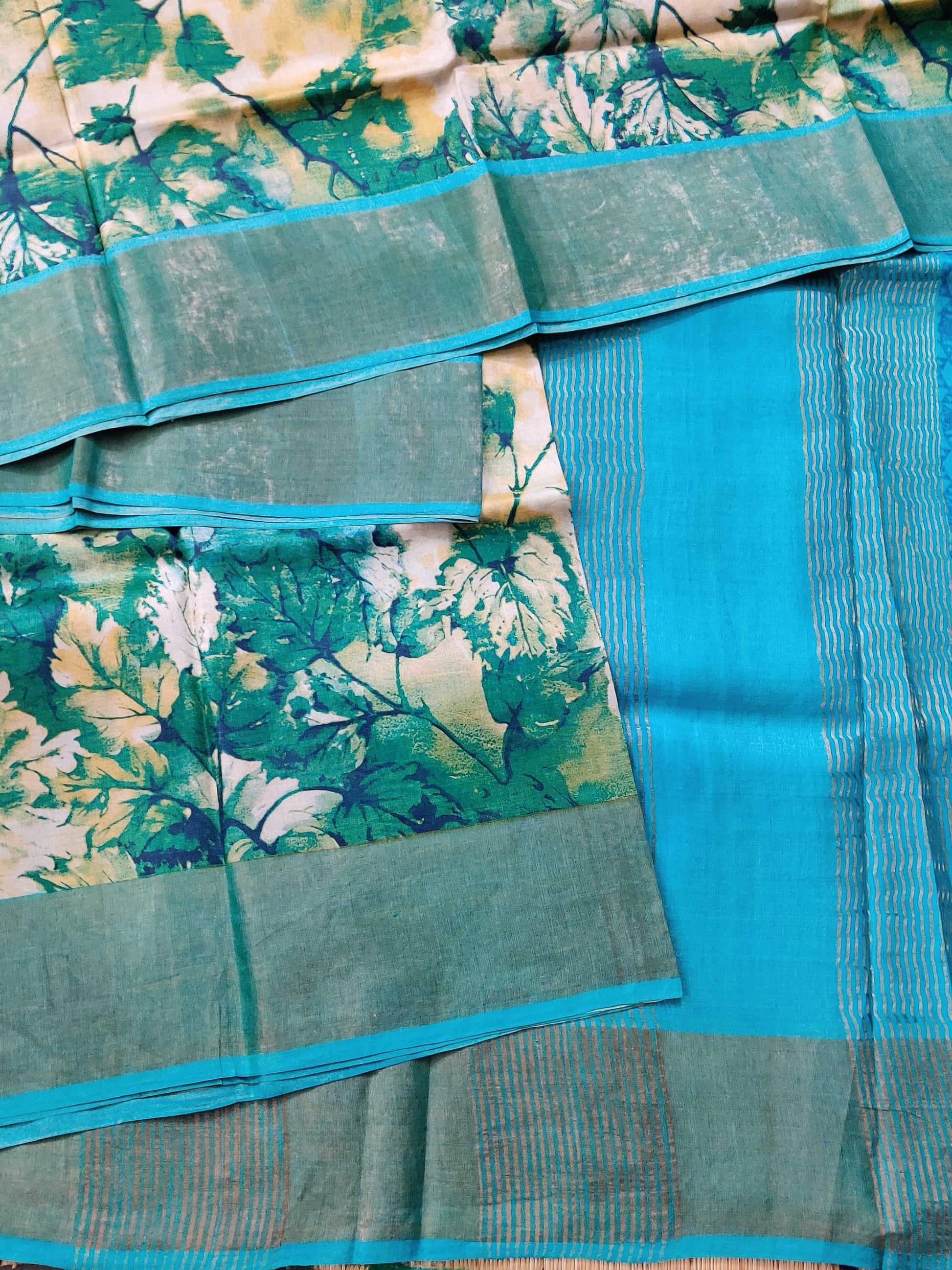 Elevate your ethnic wardrobe with this exquisite tussar silk saree, a masterpiece of traditional craftsmanship. The cream base adorned with vibrant green screen prints creates a sophisticated, versatile look suitable for both casual gatherings and festive occasions. The blur colour zari pallu adds an elegant finishing touch with its shimmering metallic accents, while the coordinating printed blouse ensures a complete, polished ensemble. Tussar silk's natural texture provides a graceful drape and breathable comfort, making this saree an ideal choice for year-round wear. Perfect for those who appreciate authentic handloom artistry combined with contemporary design sensibilities.
