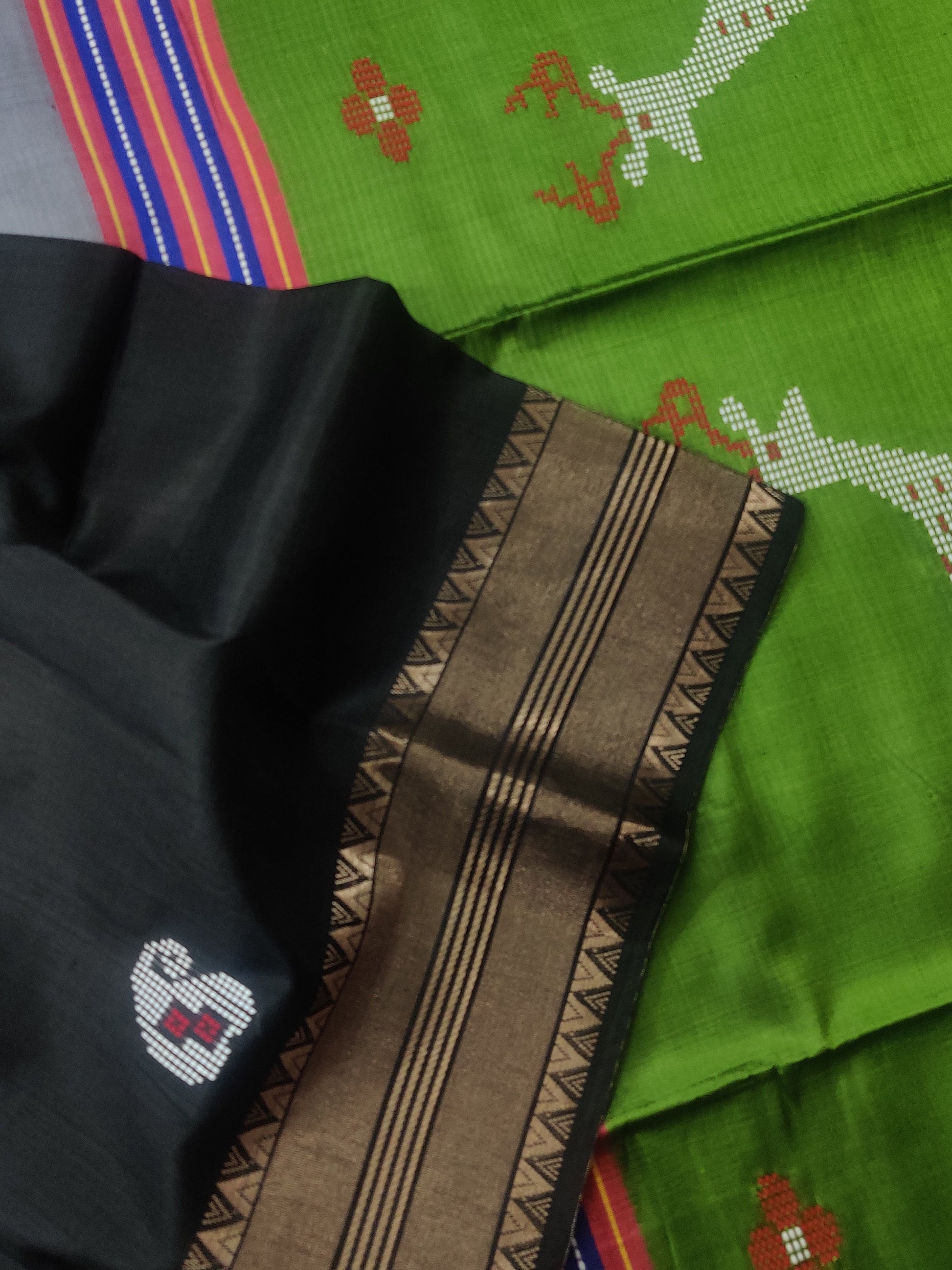 Elevate your ethnic wardrobe with this striking black Bishnupuri silk saree, a masterpiece of traditional weaving craftsmanship. The fabric showcases intricate thread-woven motifs distributed across the entire drape, creating a sophisticated textured surface that catches light beautifully. A lustrous zari border frames the saree with golden elegance, while the contrast pallu adds a distinctive design element that enhances the overall aesthetic. The accompanying plain blouse provides versatility, allowing you to style this piece for both formal occasions and festive celebrations. Bishnupuri silk's natural sheen and durability ensure this saree remains a timeless addition to your collection.