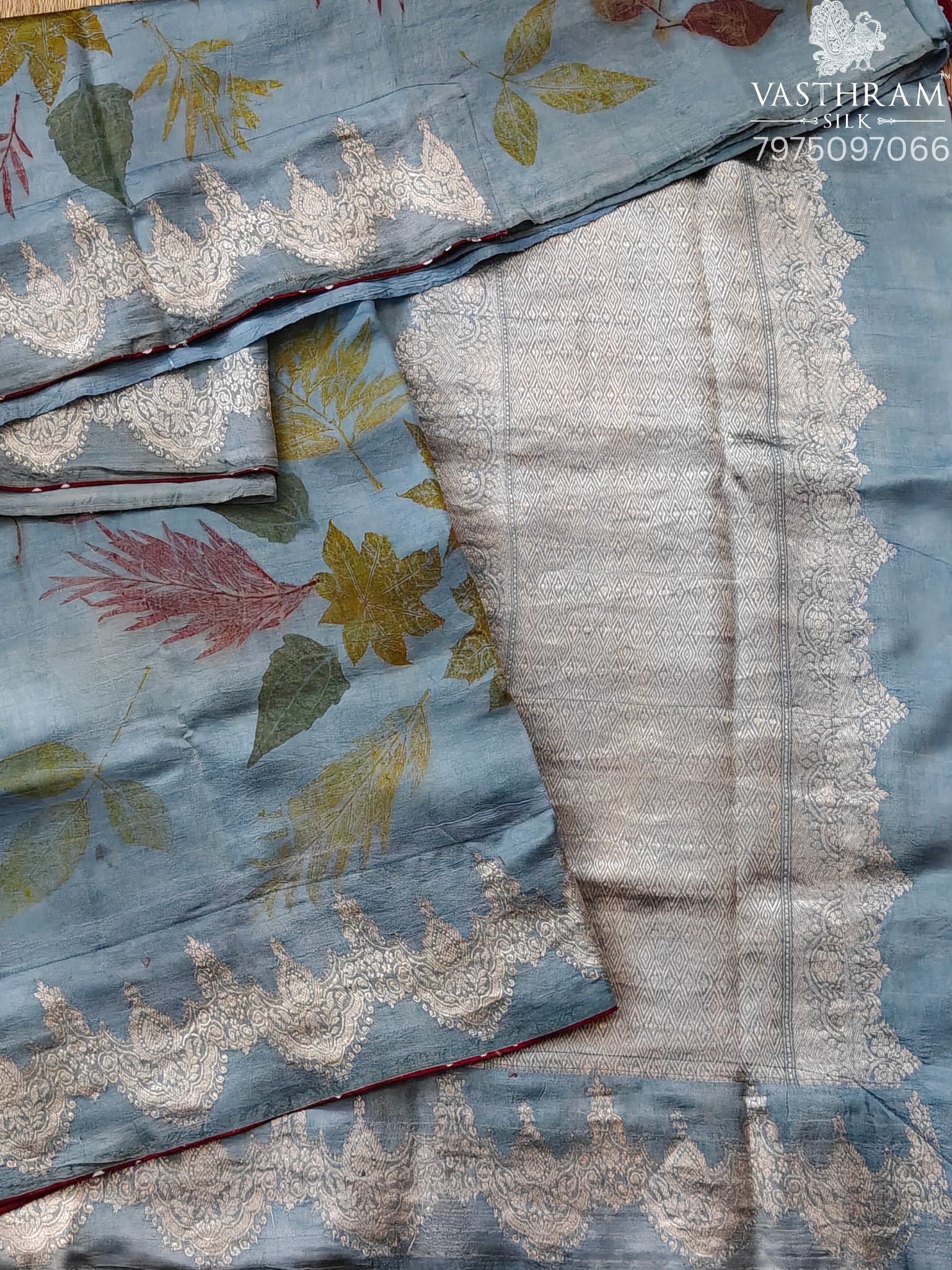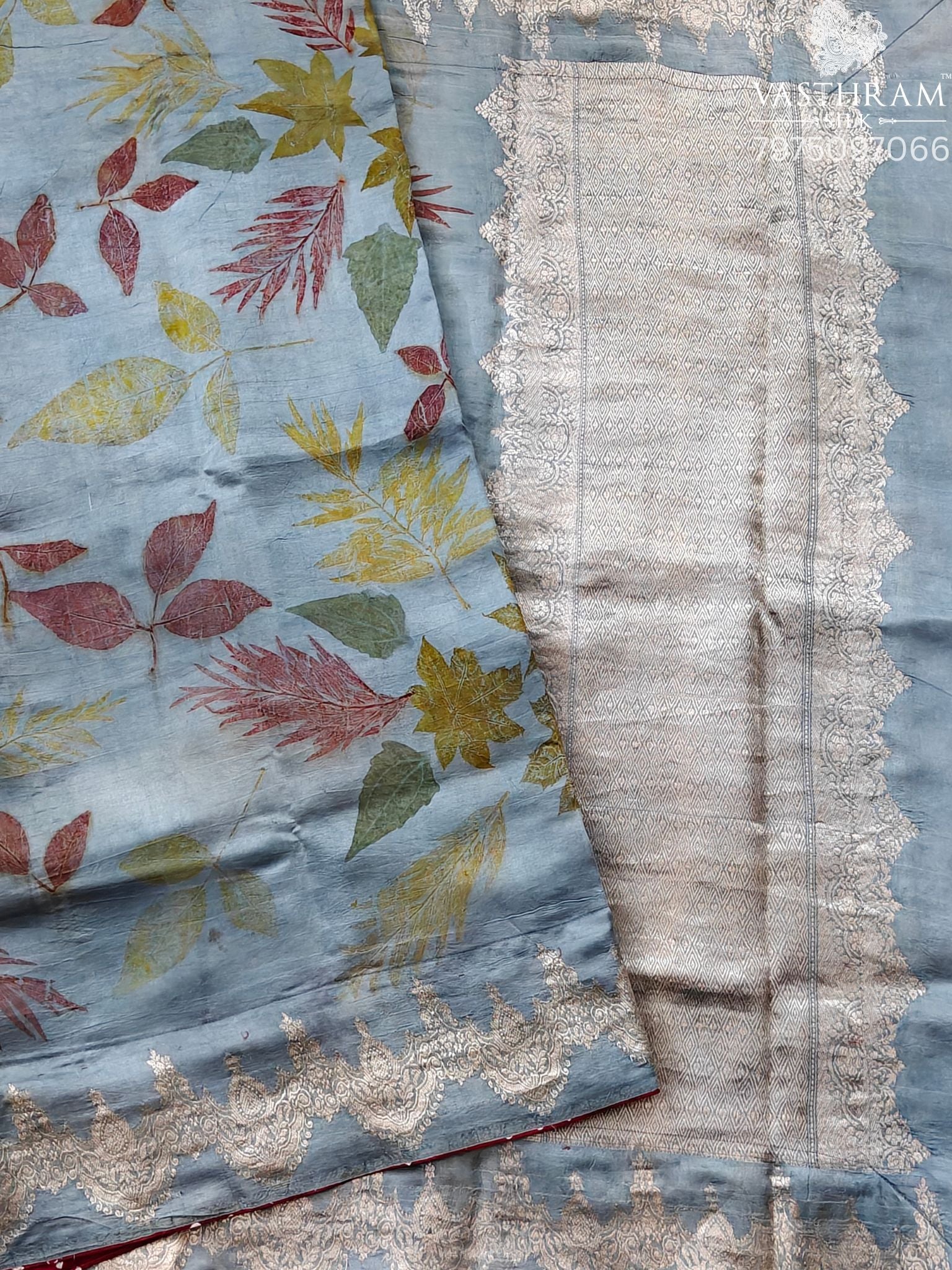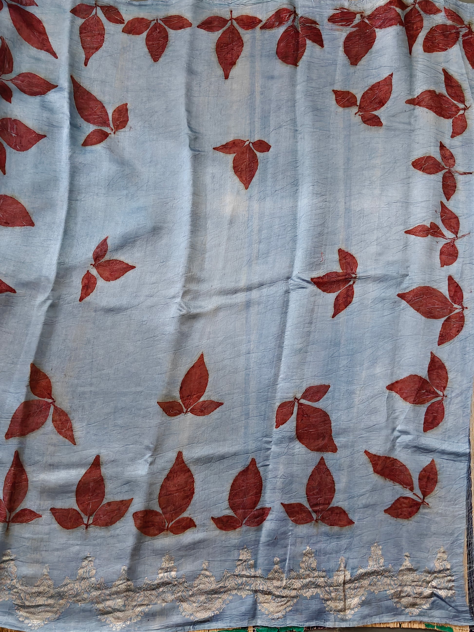 Elegant blue Murshidabad silk saree featuring natural eco-print patterns throughout, creating a unique, sustainable aesthetic. The saree is adorned with a lustrous zari border and matching zari pallu that add traditional grandeur. Crafted from premium silk, it drapes beautifully and offers comfort for all-day wear. Includes a coordinating self-blouse piece, making it ready to wear for weddings, festivals, and special occasions. The eco-friendly print technique ensures each piece is one-of-a-kind while being gentle on the environment.