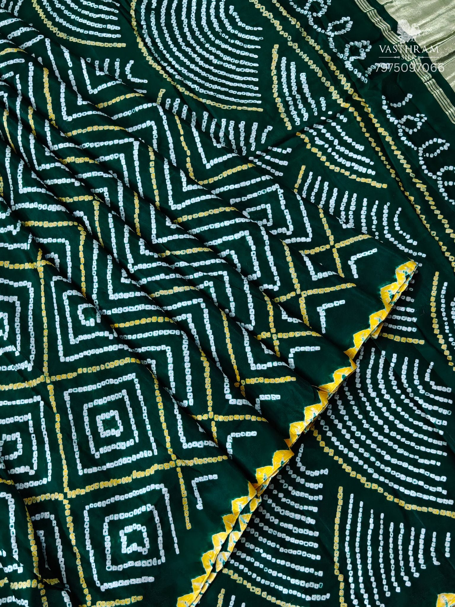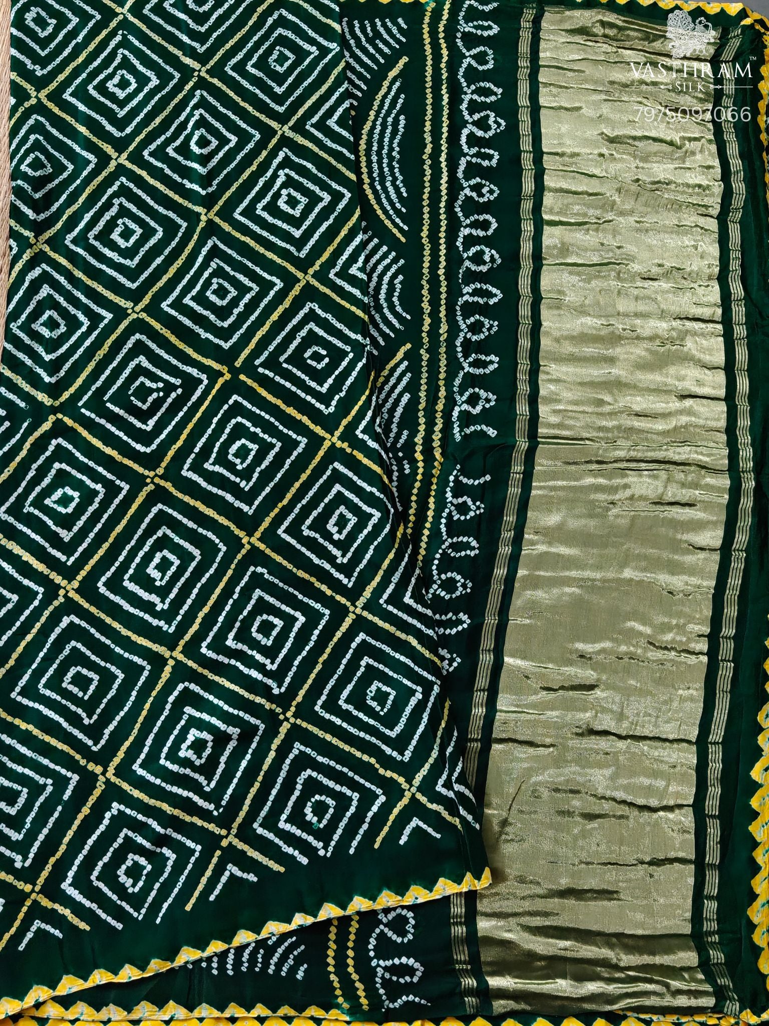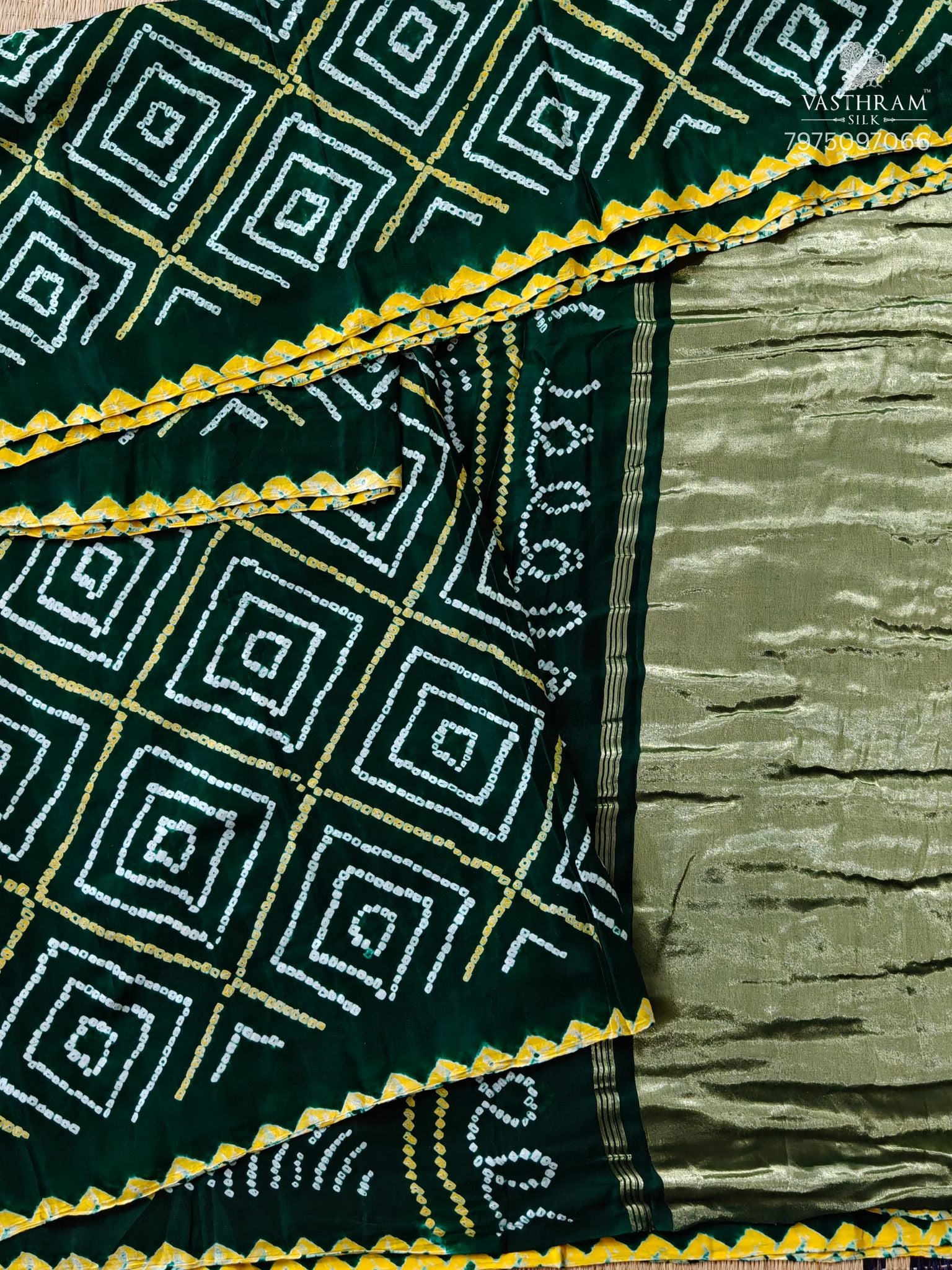 Bottele Green Colour Gaji Silk Saree With Hand Bandhini All Over Code : VB0512