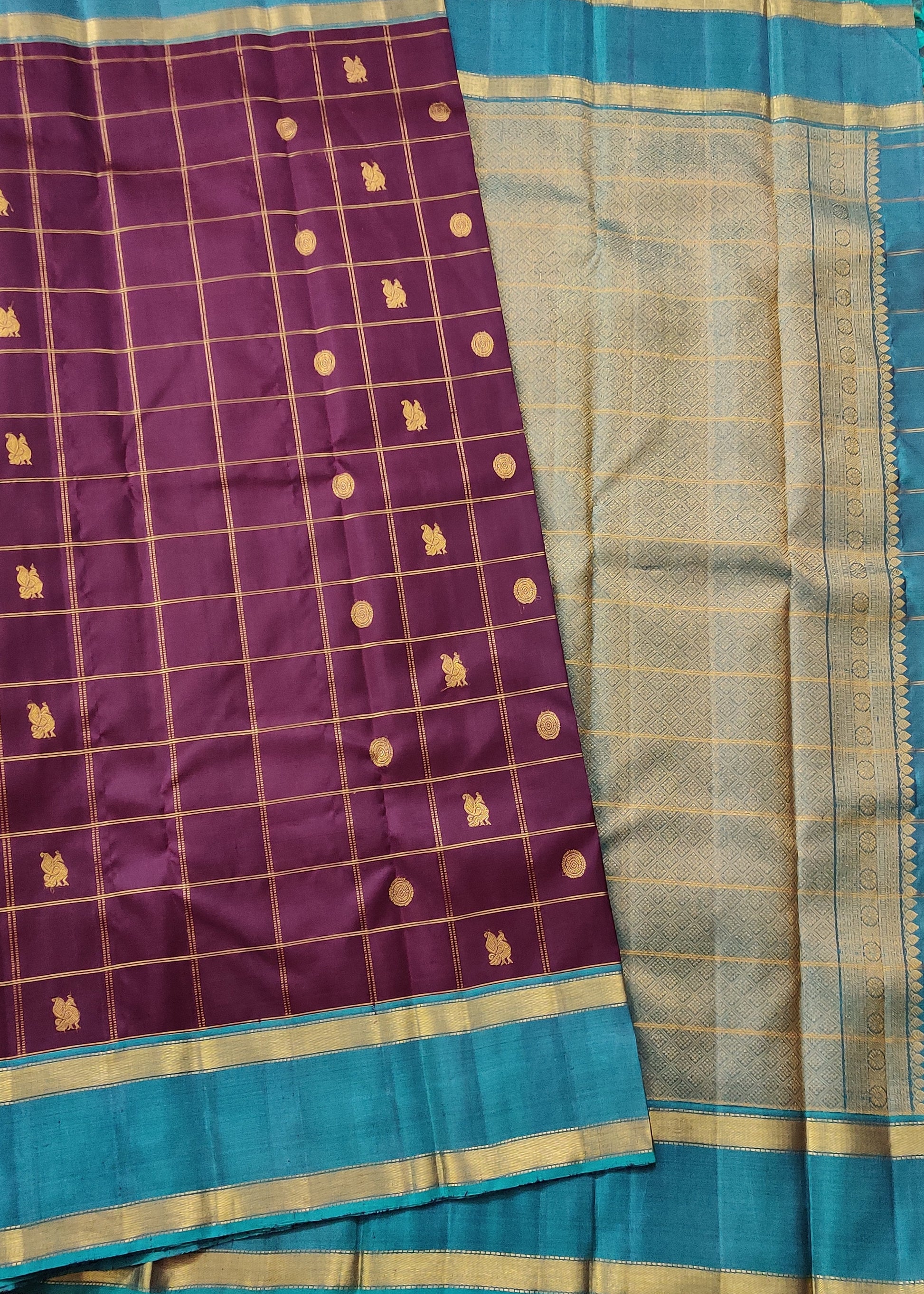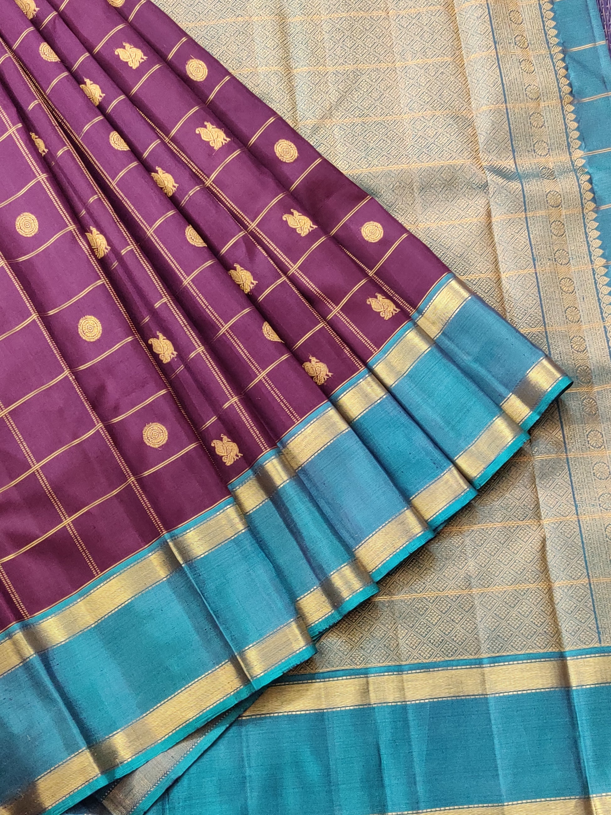 Elevate your traditional wardrobe with this exquisite brown Kanchivaram silk saree, a masterpiece of South Indian weaving heritage. The fabric showcases intricate zari checks interspersed with graceful peacock motifs in zari throughout, creating a mesmerizing pattern that catches light beautifully. The striking rama blue border and matching pallu provide a sophisticated contrast that frames the ensemble elegantly. Crafted from pure Kanchivaram silk, this saree offers the luxurious drape and durability the fabric is renowned for. Paired with a plain blouse, it allows the saree's detailed work to take center stage, making it an ideal choice for weddings, festivals, and special occasions where timeless elegance is paramount.