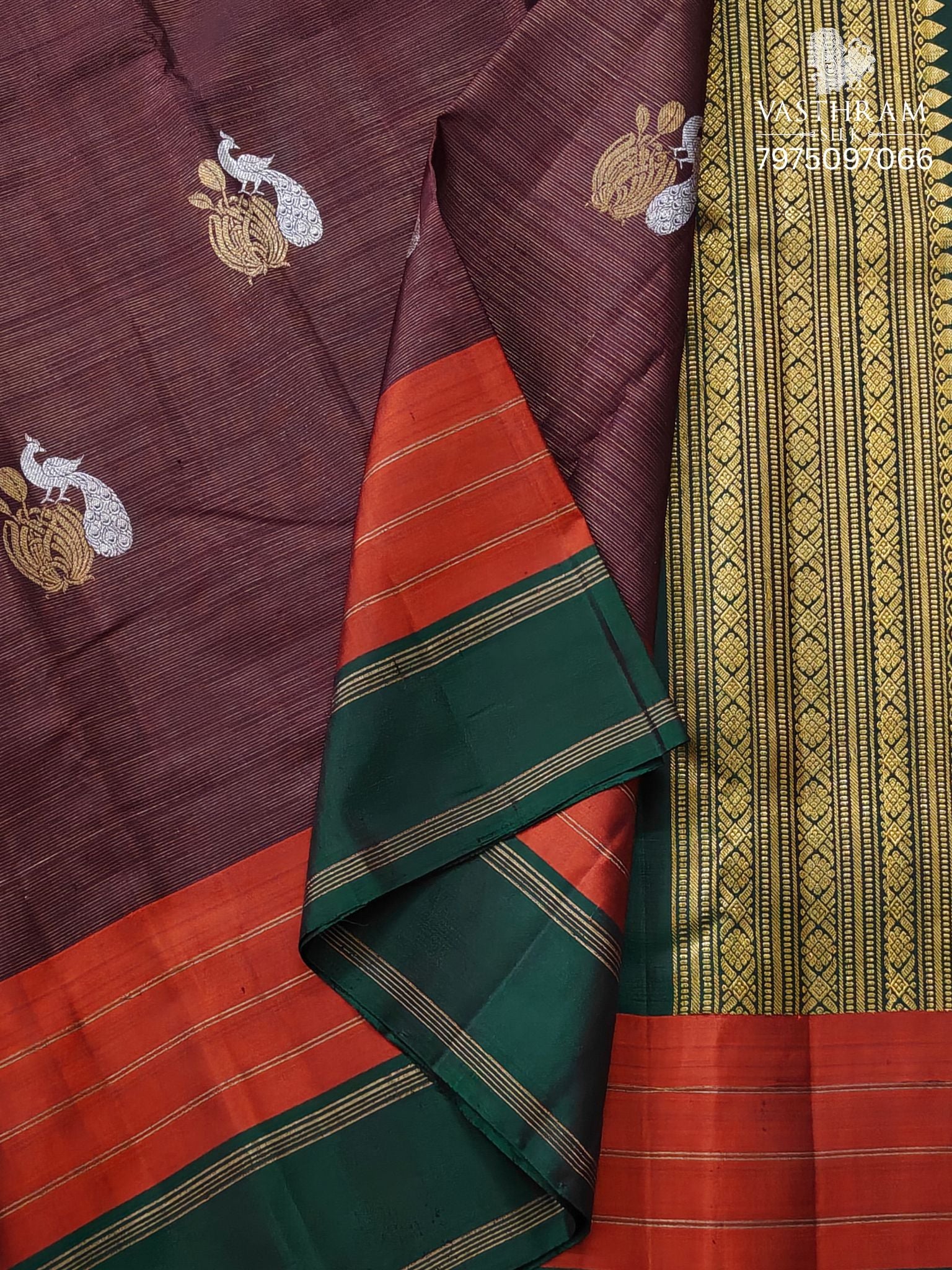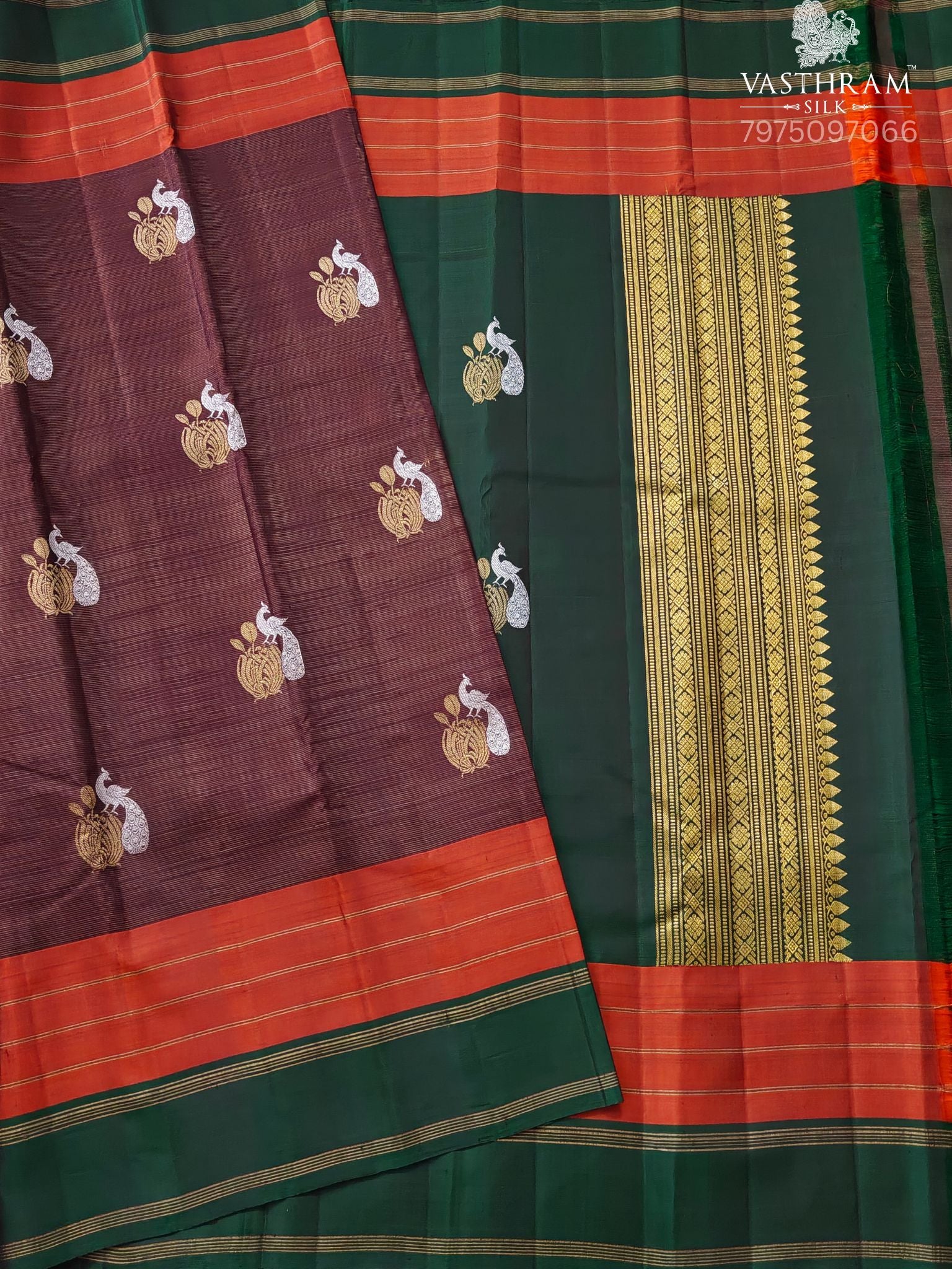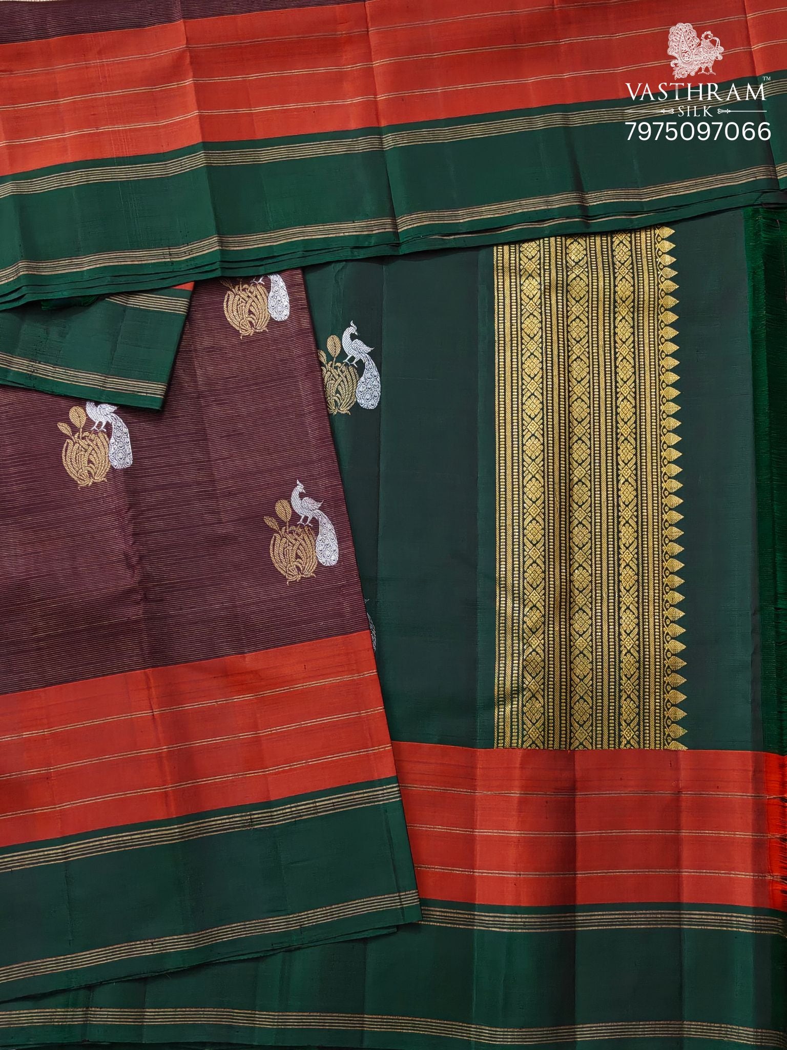 Brown Colour Kanchivaram Silk Saree With Zari Stripes & Silver With Gold Peacock Zari Motif All Over Code : KA0415
