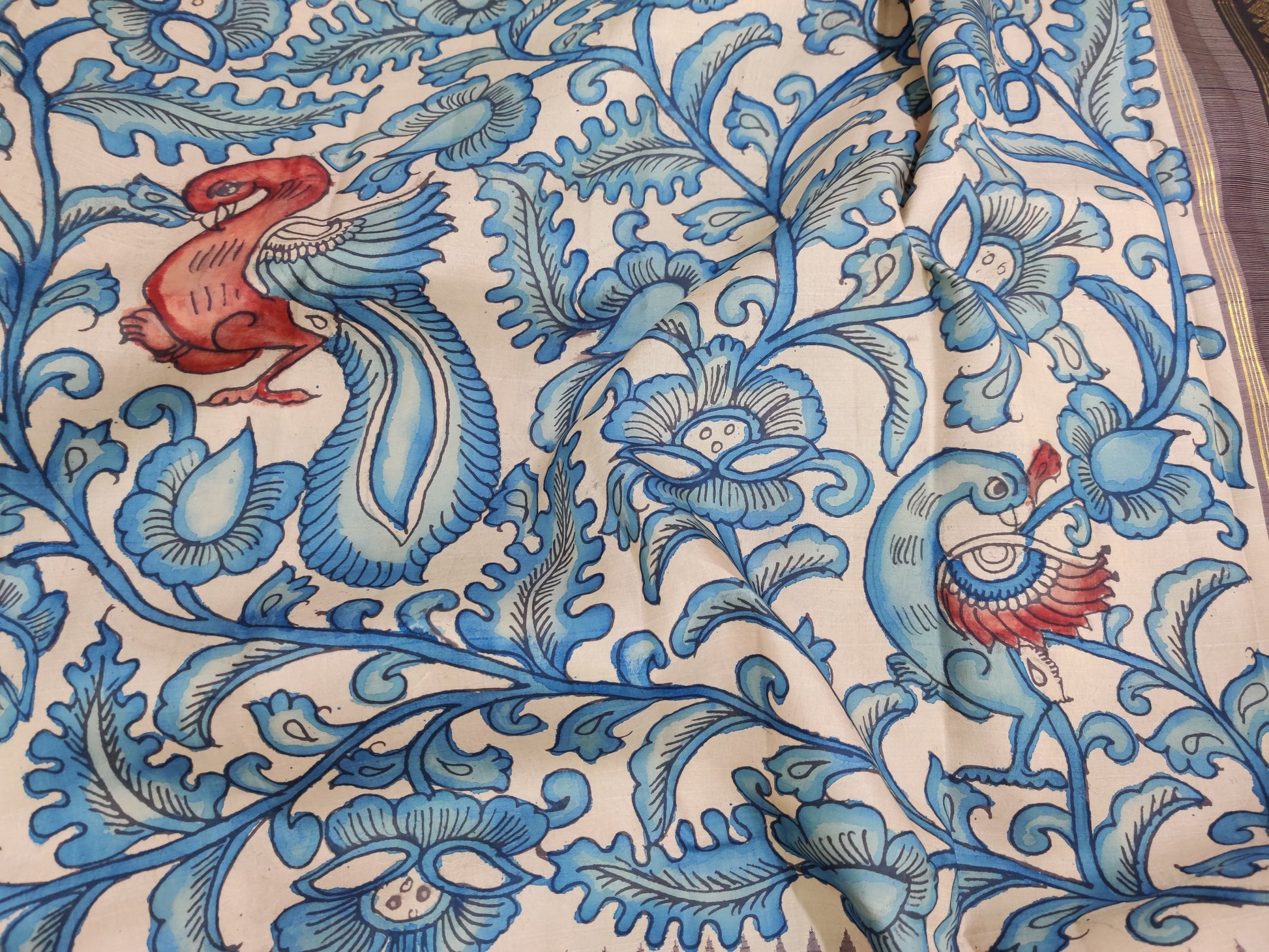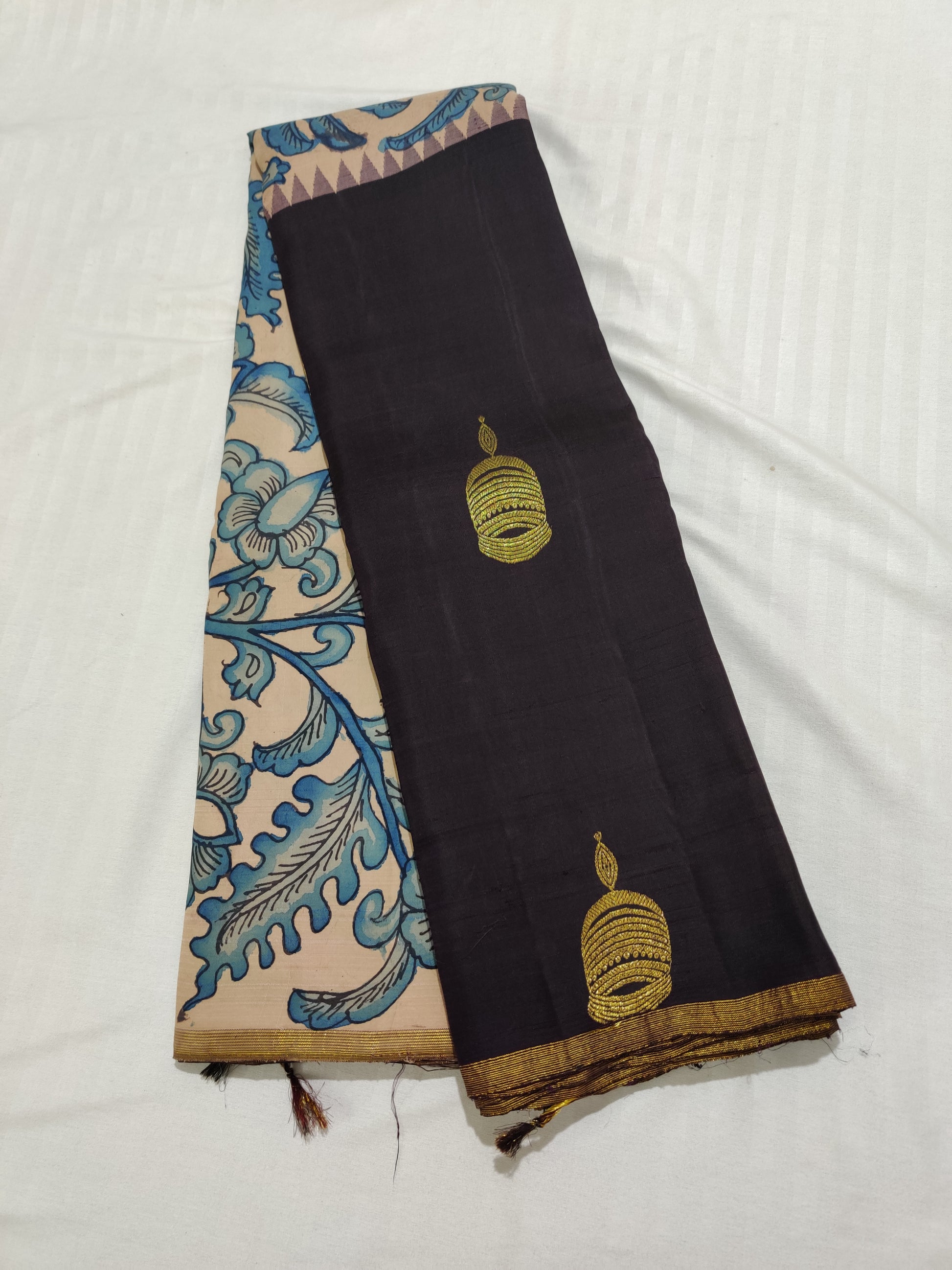 Elevate your traditional wardrobe with our Cream & Black Kanchivaram Silk Saree. This half/half saree features a beautiful hand-pen Kalamkari design, adorned with a black zari border and rich zari pallu. The accompanying plain blouse completes the elegant look. Experience the perfect blend of style and comfort with our saree.