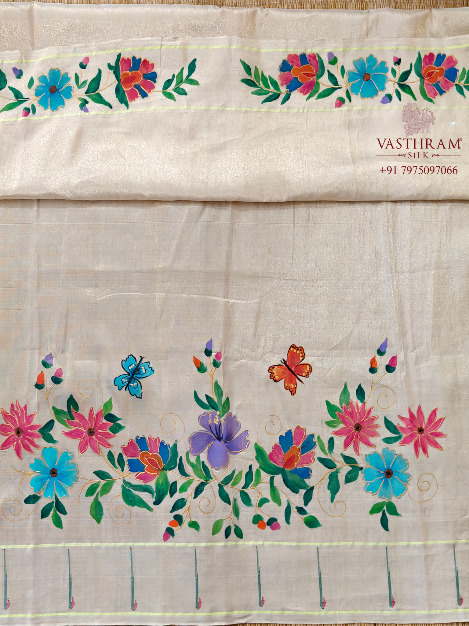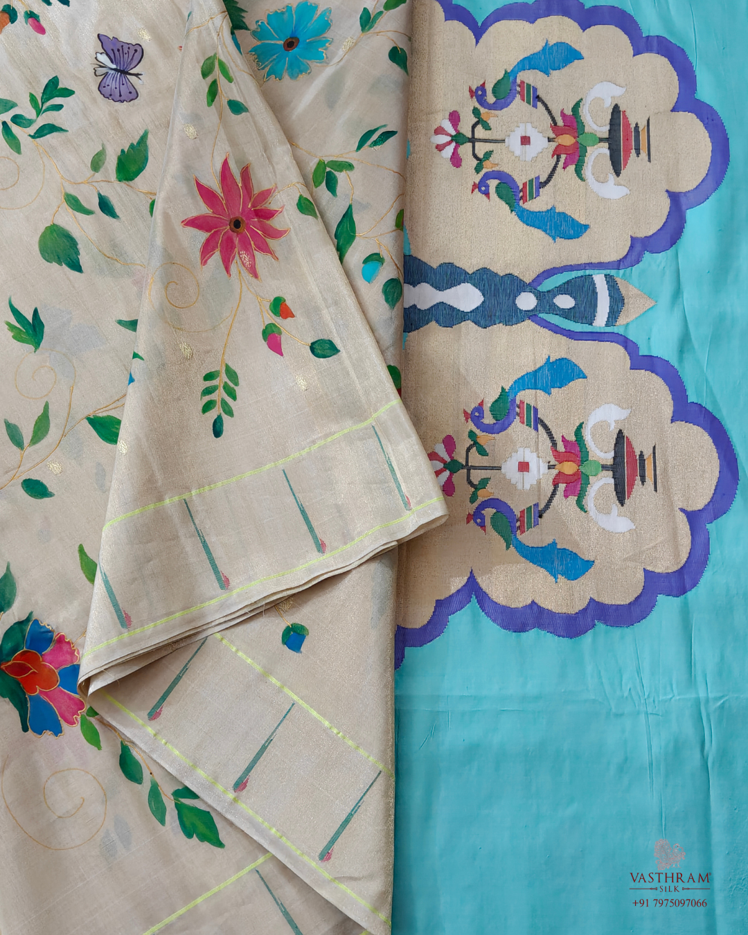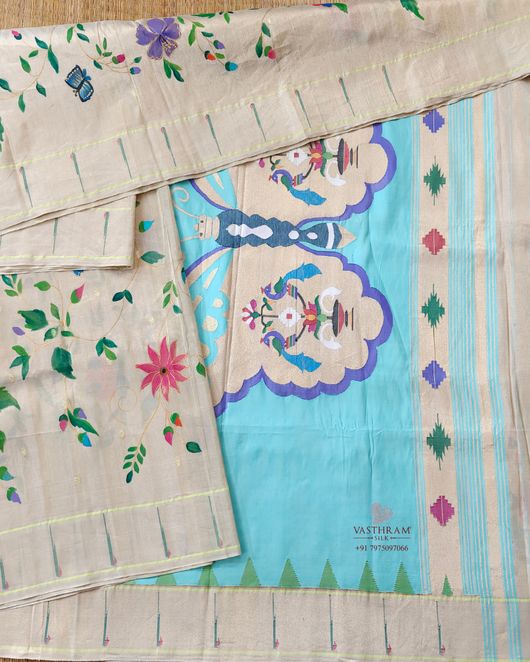 Cream Colour Paithani Silk Saree With Hand Painted All Over Code :