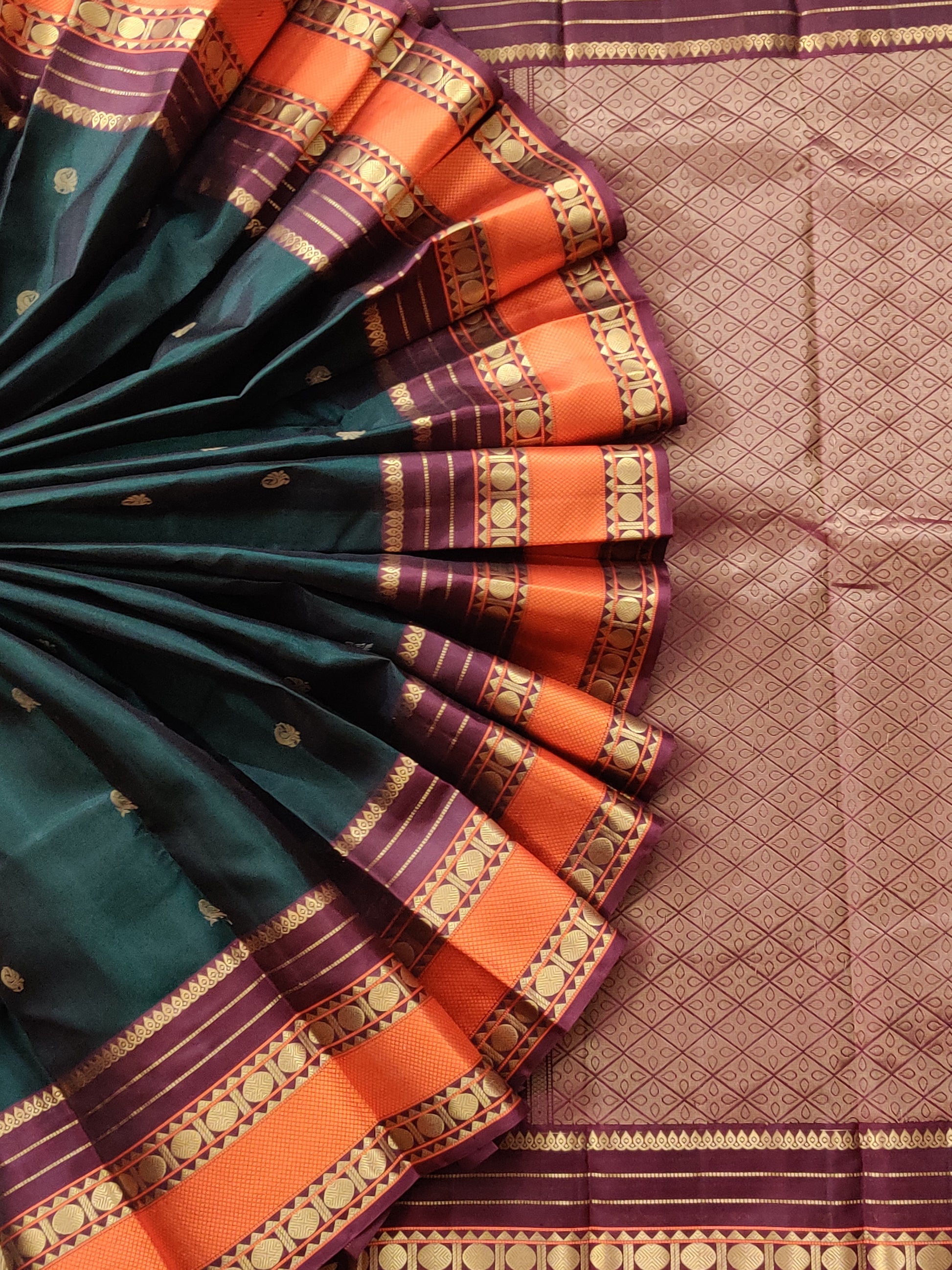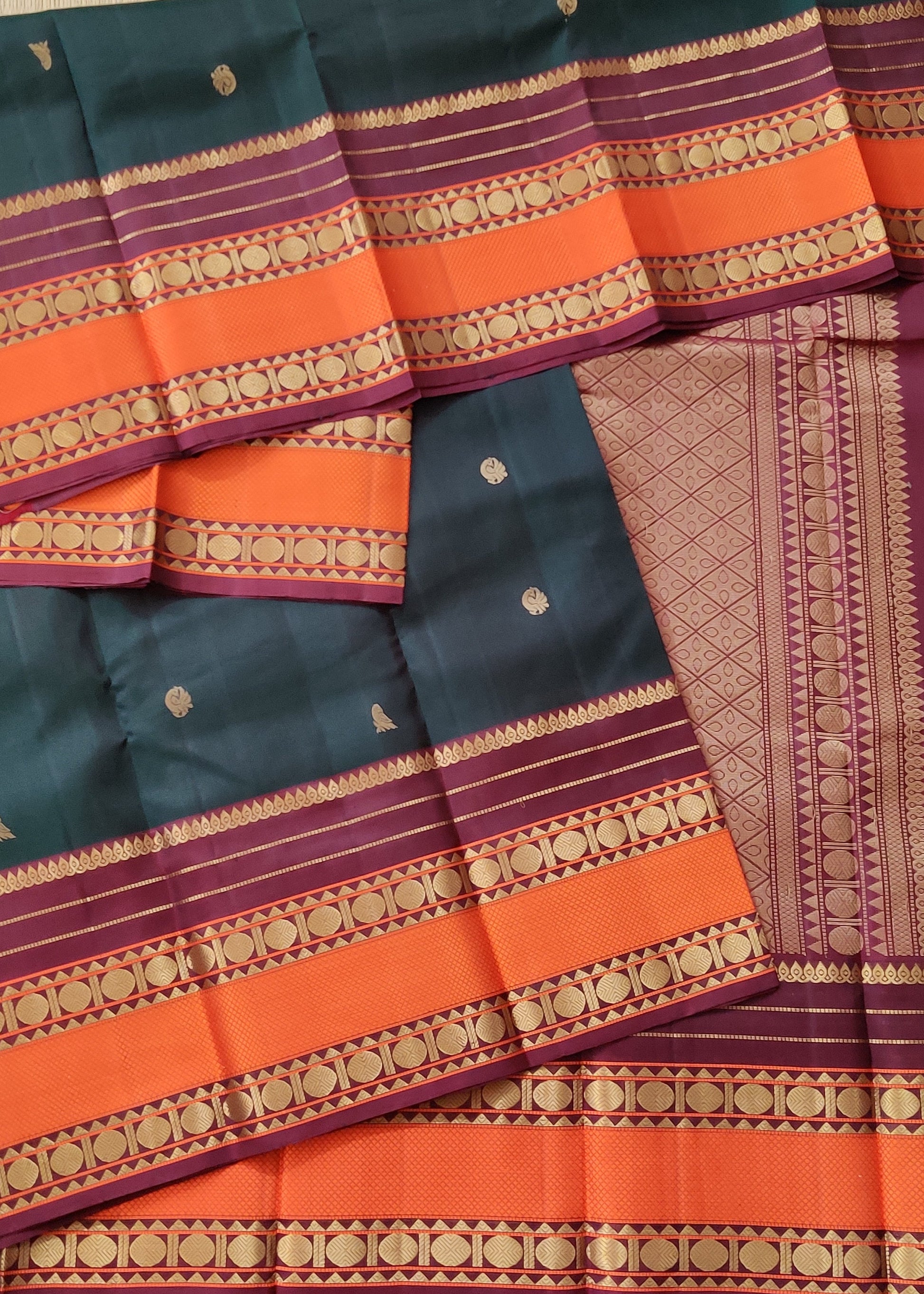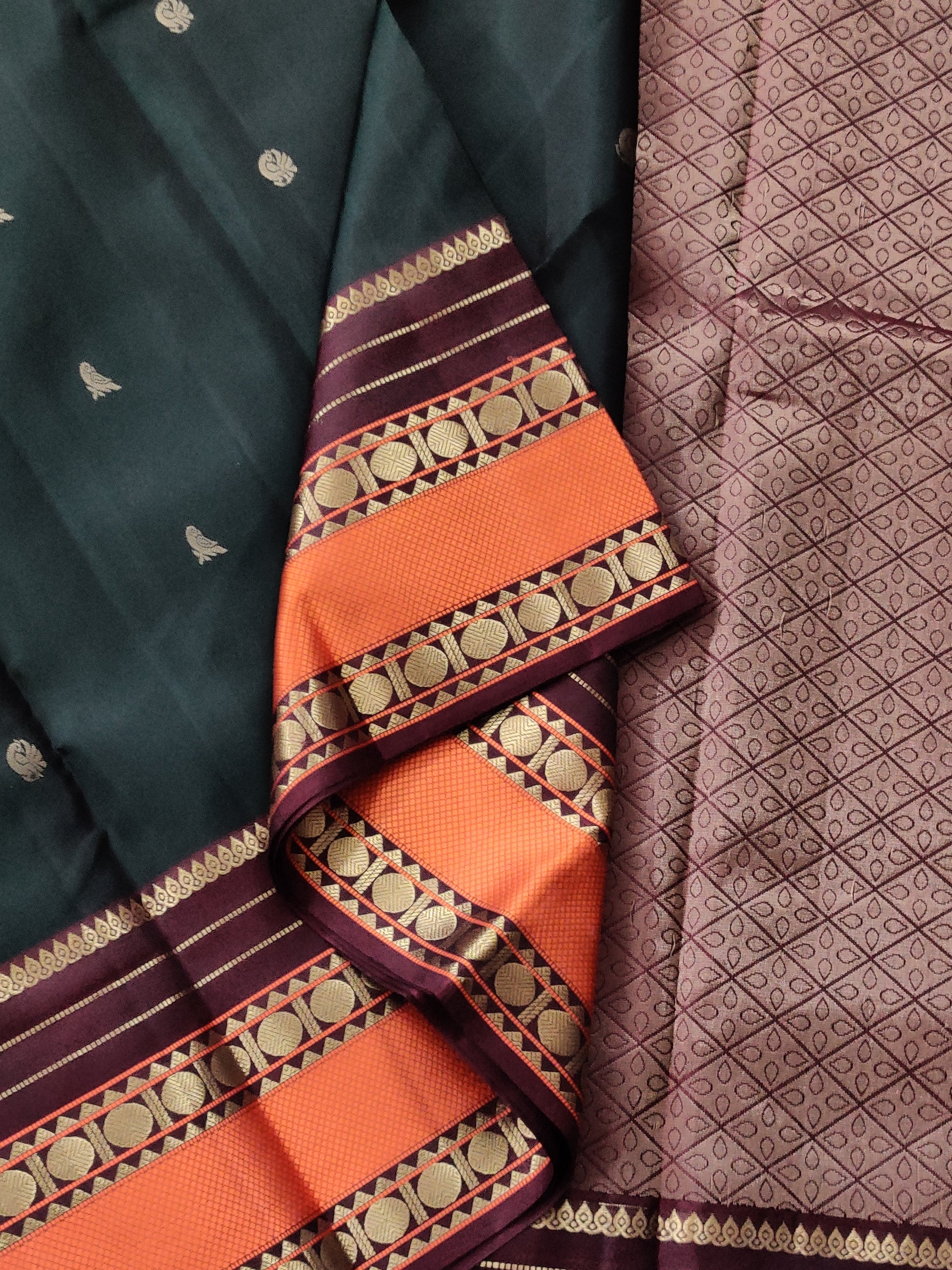 Elevate your ethnic wardrobe with this exquisite Kanchivaram silk saree in deep bottle green. The fabric showcases intricate zari butta work scattered throughout, creating a refined, textured aesthetic. A striking orange zari border provides a bold contrast, while the maroon zari pallu adds sophisticated depth to the ensemble. Crafted from premium Kanchivaram silk, this saree drapes beautifully and offers the durability expected from traditional South Indian weaving. Paired with a plain blouse, it allows the saree's detailed embellishment to take center stage, making it ideal for weddings, festivals, and special occasions.