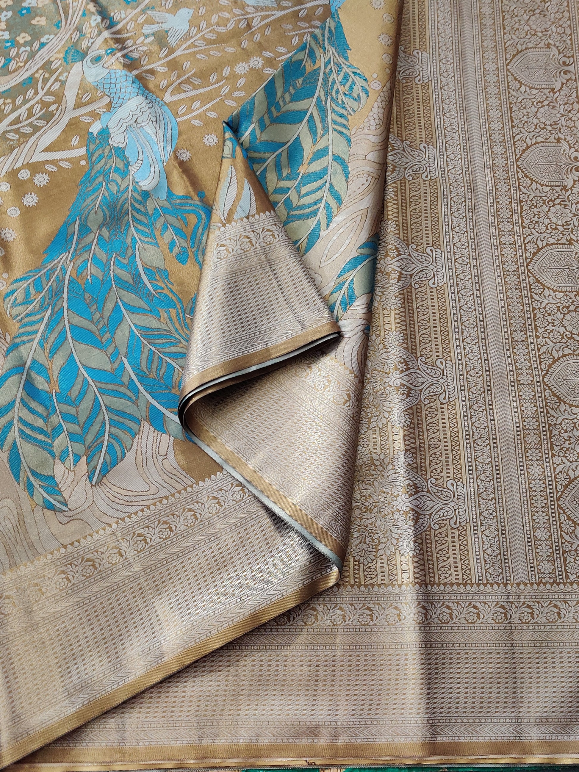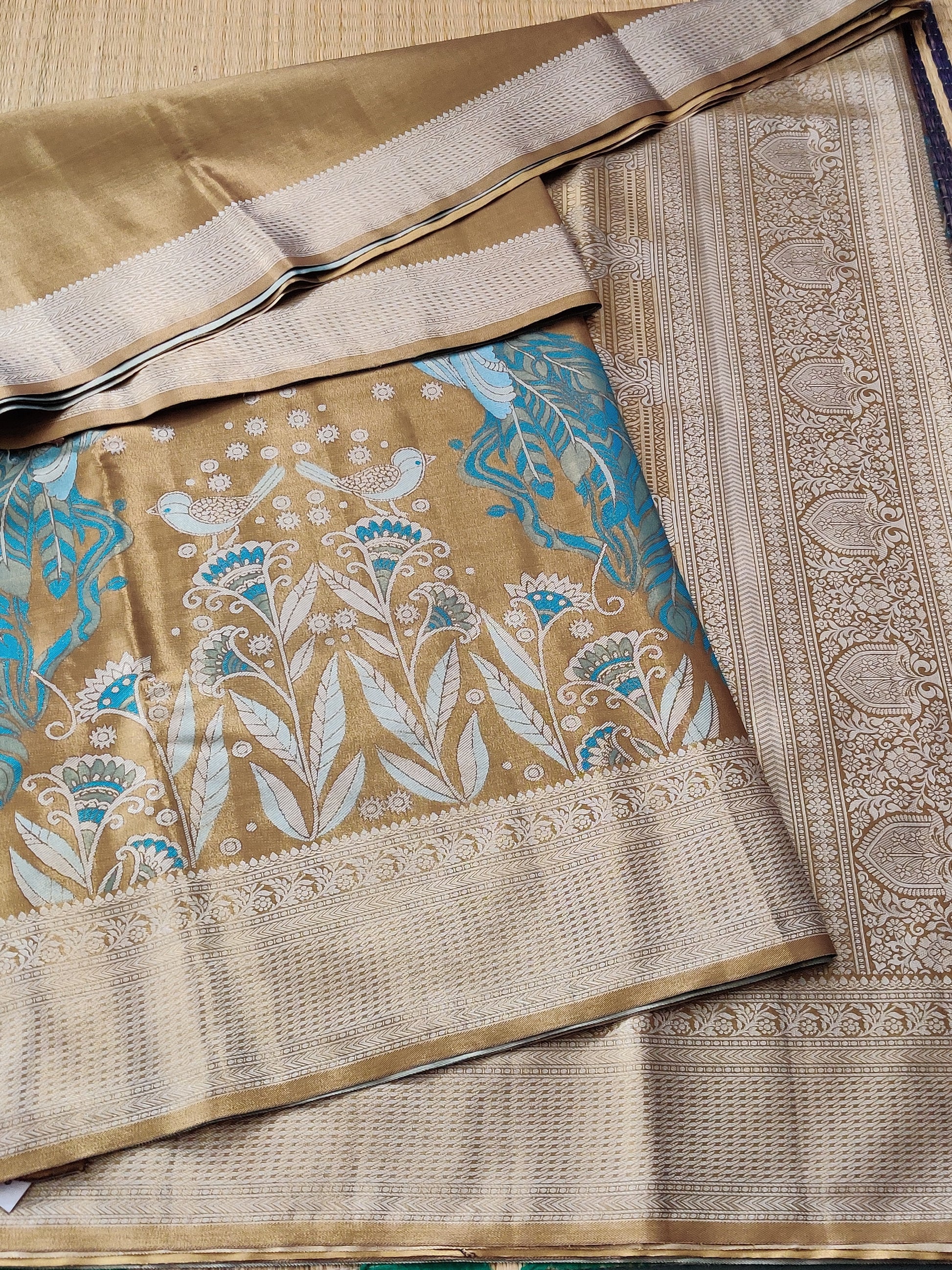 Dark Gold Colour Semi Kanchi Silk Saree With Peacock Thread Woven Motif Body Code : VB0121