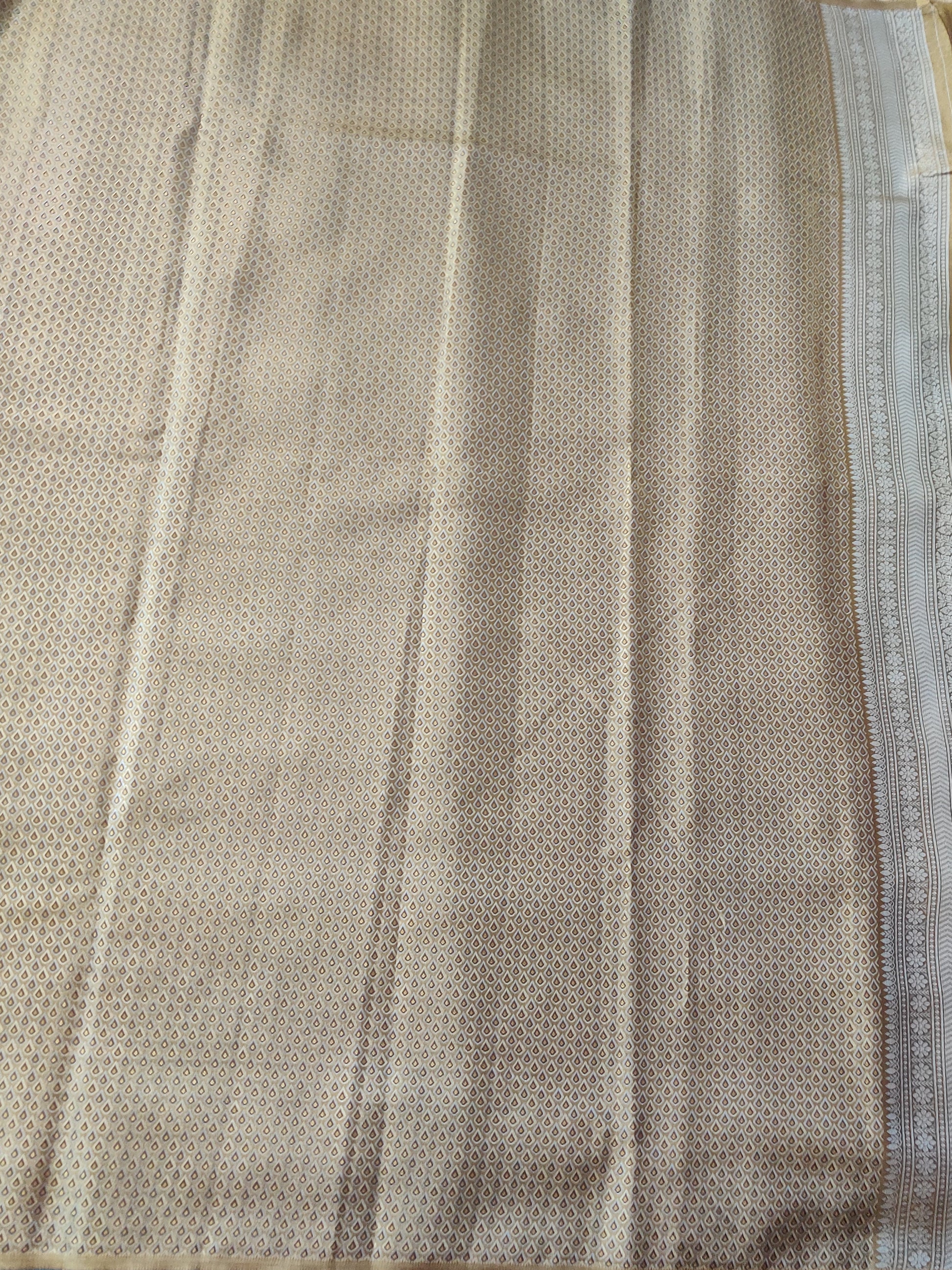 This dark gold semi Kanchi silk saree features an exquisite peacock thread woven motif throughout the body, complemented by a silver zari border that adds subtle elegance. The rich zari pallu enhances its traditional appeal, making it perfect for festive occasions. Paired with a brocade blouse, this saree combines classic craftsmanship with refined luxury, ideal for those who appreciate heritage textiles with a sophisticated touch.