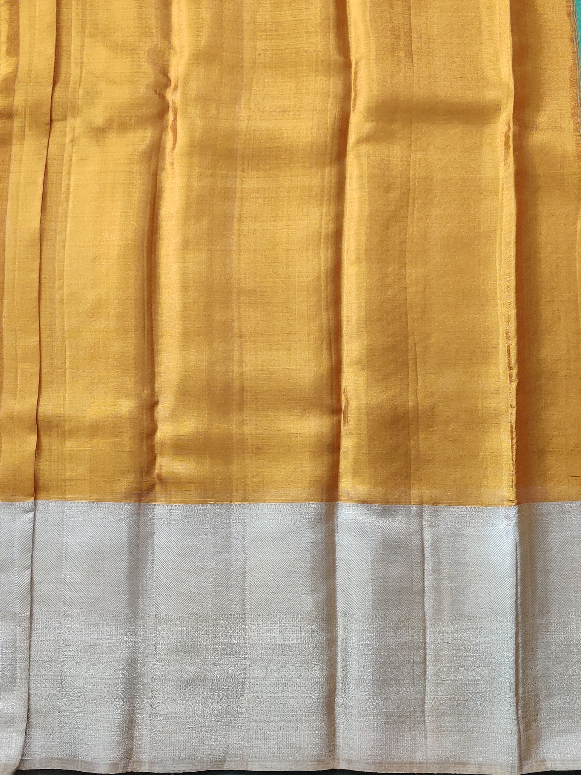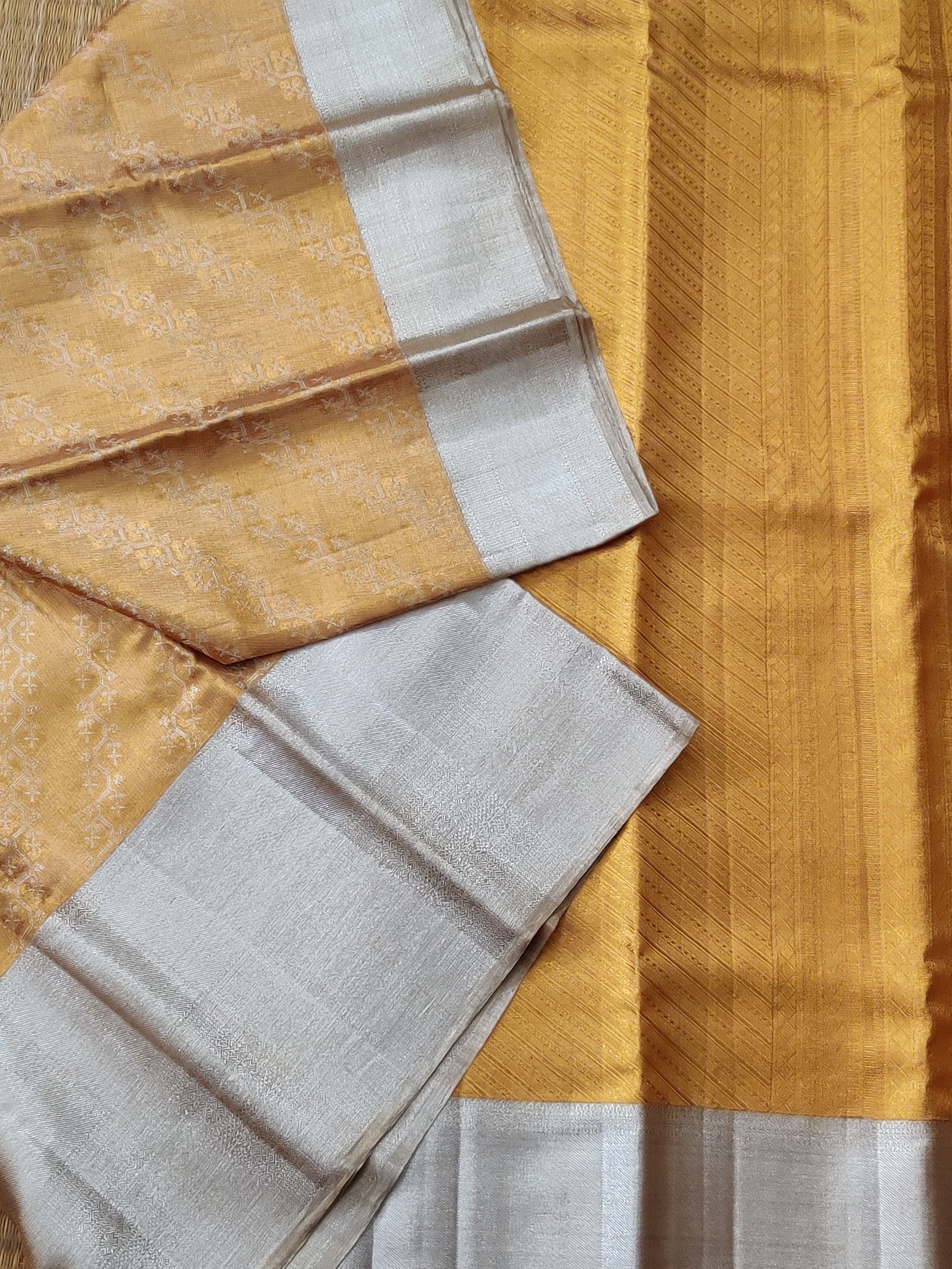 Experience timeless elegance with this dark gold tissue Kanchivaram silk saree, richly adorned with intricate zari brocade throughout. The contrasting silver zari border and pallu add refined sophistication, perfectly complemented by a plain blouse for balanced grace. Ideal for special occasions, this saree blends traditional craftsmanship with luxurious textures to elevate your wardrobe.