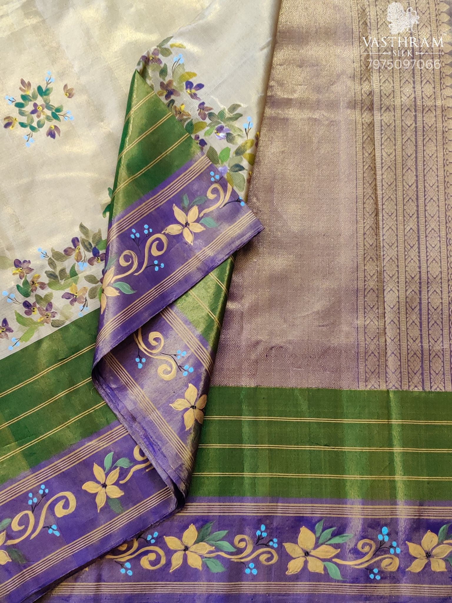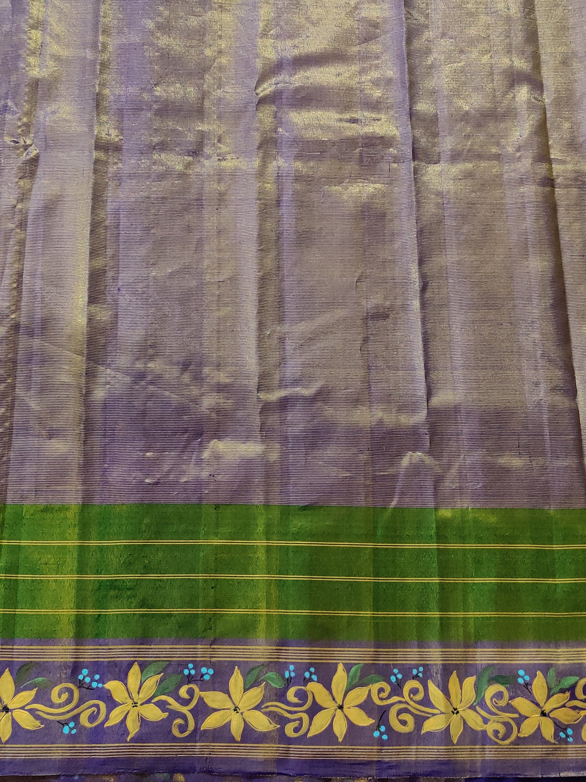 Elevate your ethnic wardrobe with this stunning gold Kanchivaram silk saree, a masterpiece of traditional craftsmanship. The entire saree features exquisite hand painting, bringing artistic elegance to every inch of the fabric. A striking contrast blue painted border adds definition and visual interest, while the zari tissue pallu showcases intricate detailing that catches light beautifully. Paired with a complementary light blue blouse, this saree is perfect for weddings, festivals, and special occasions. The luxurious Kanchivaram silk drapes gracefully, offering both comfort and sophistication. Each hand-painted detail makes this piece truly one-of-a-kind, celebrating the rich heritage of South Indian textile artistry.