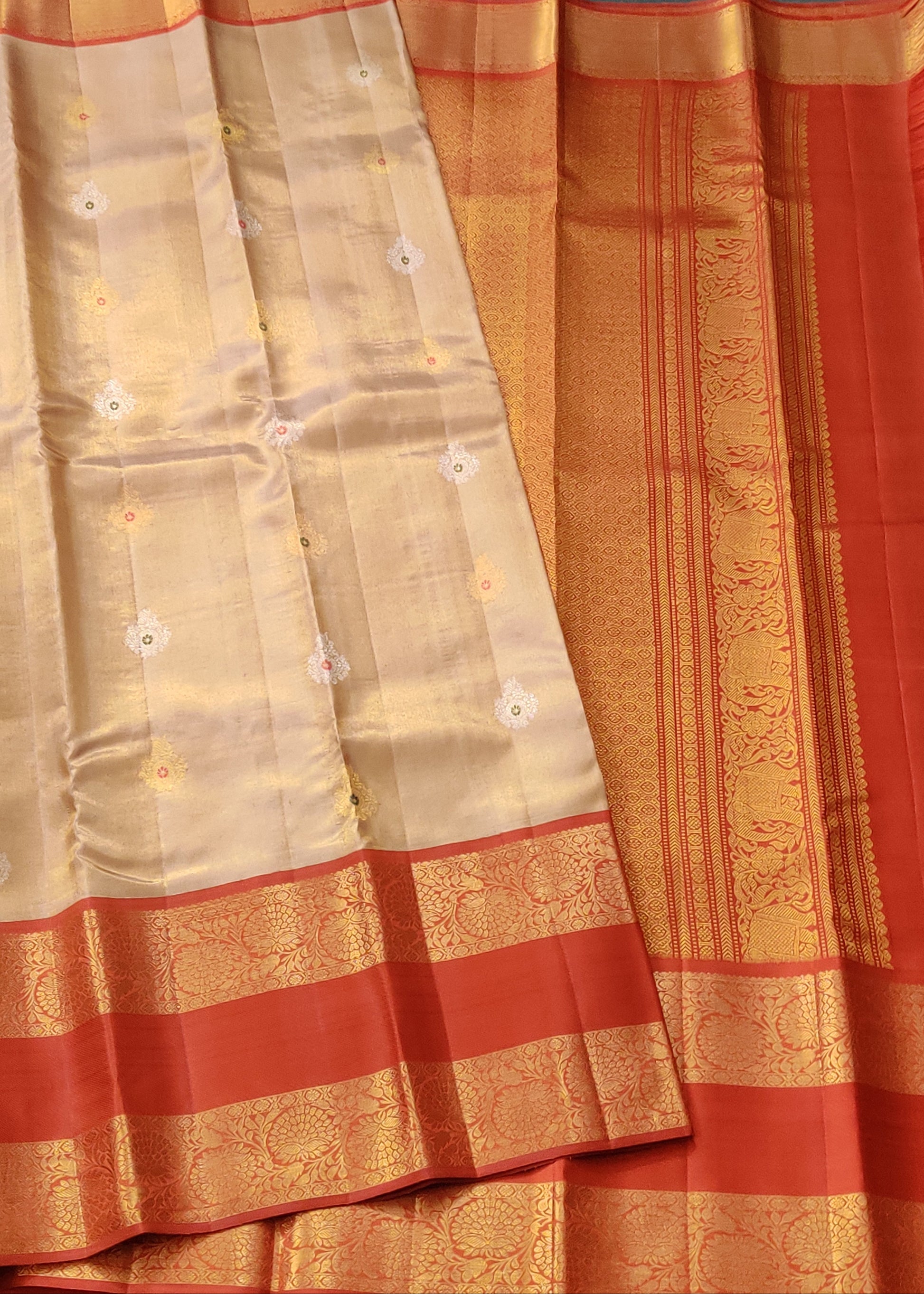 Gold Colour Tissue Kanchivaram Silk Saree With Gold & Silver Zari Butta All Over Code : KA0260