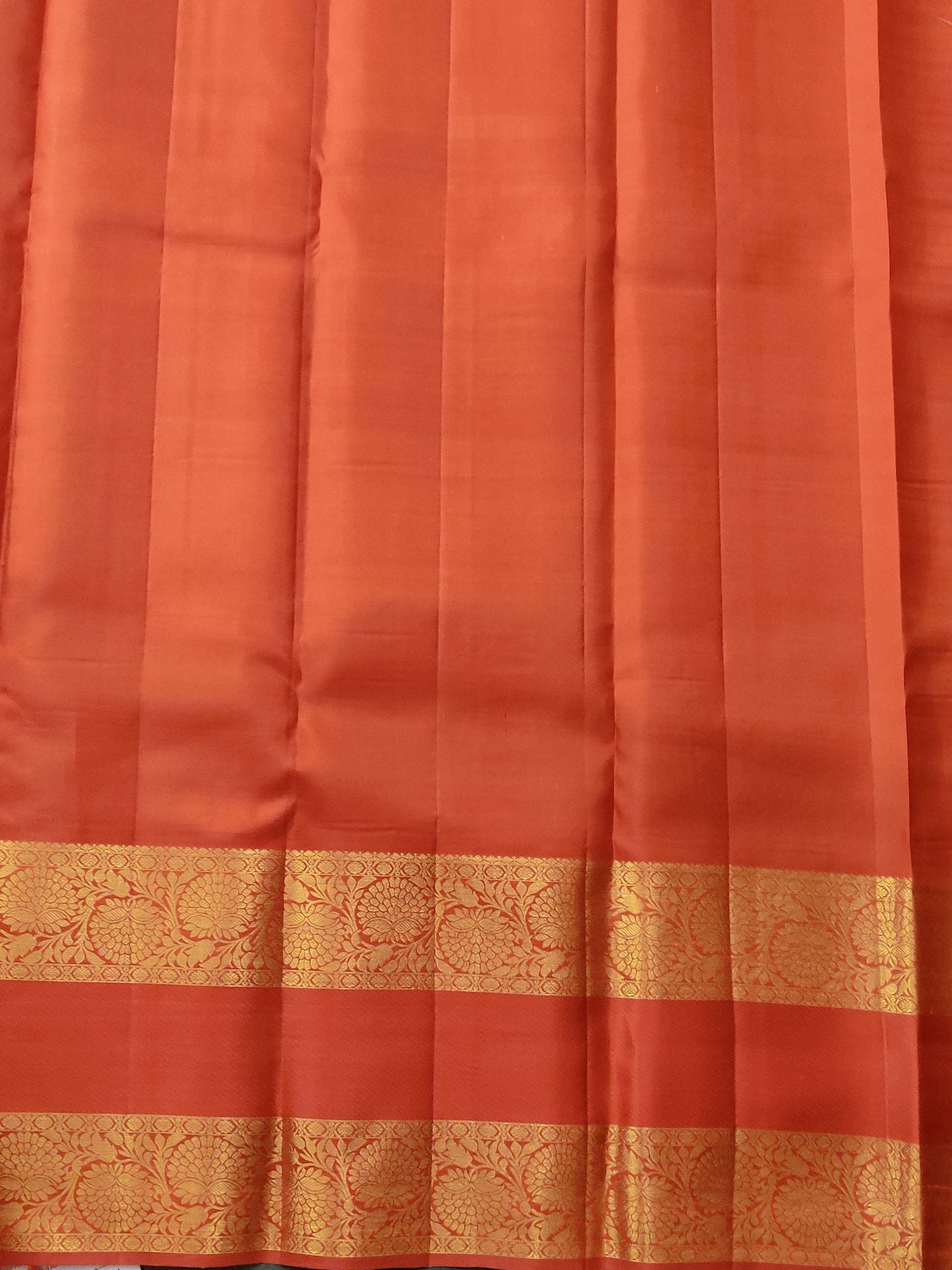Elevate your traditional wardrobe with this exquisite gold tissue Kanchivaram silk saree, adorned with intricate gold and silver zari buttas throughout. The elegant contrast brick-colored zari border and pallu add a refined touch, perfect for special occasions. Included is a plain blouse, allowing the saree’s rich texture and craftsmanship to take center stage. This saree seamlessly blends heritage and luxury for a timeless statement.