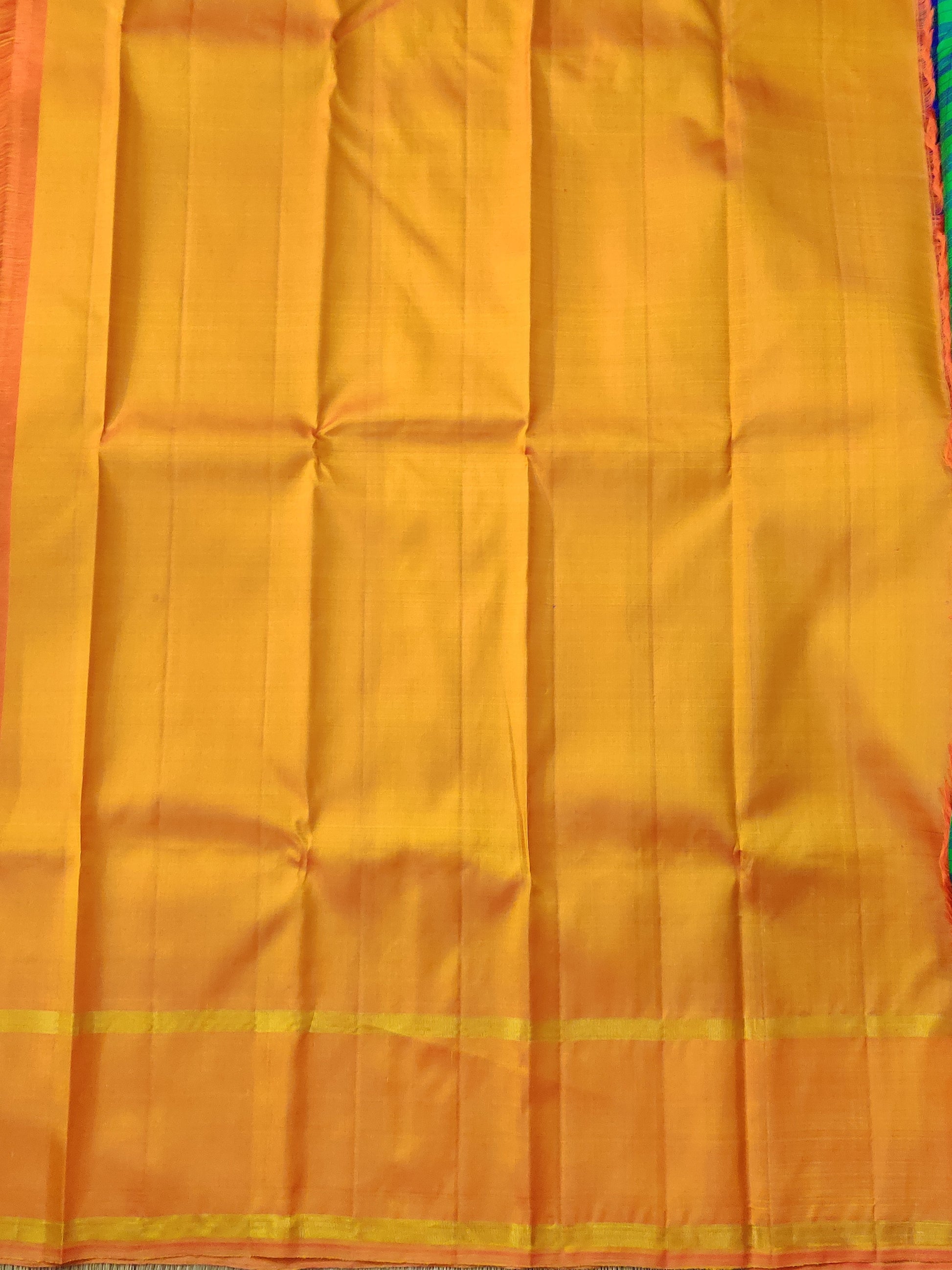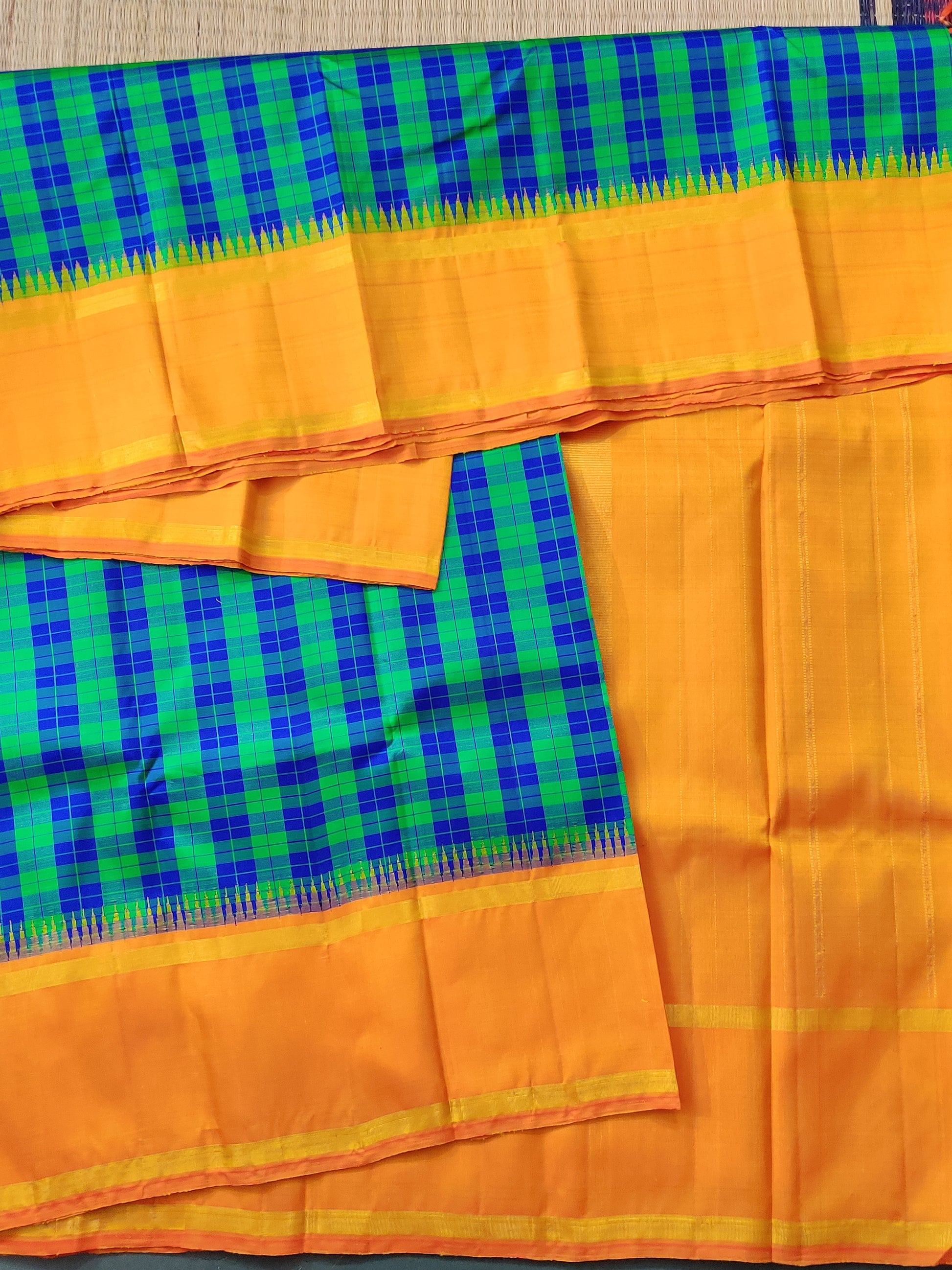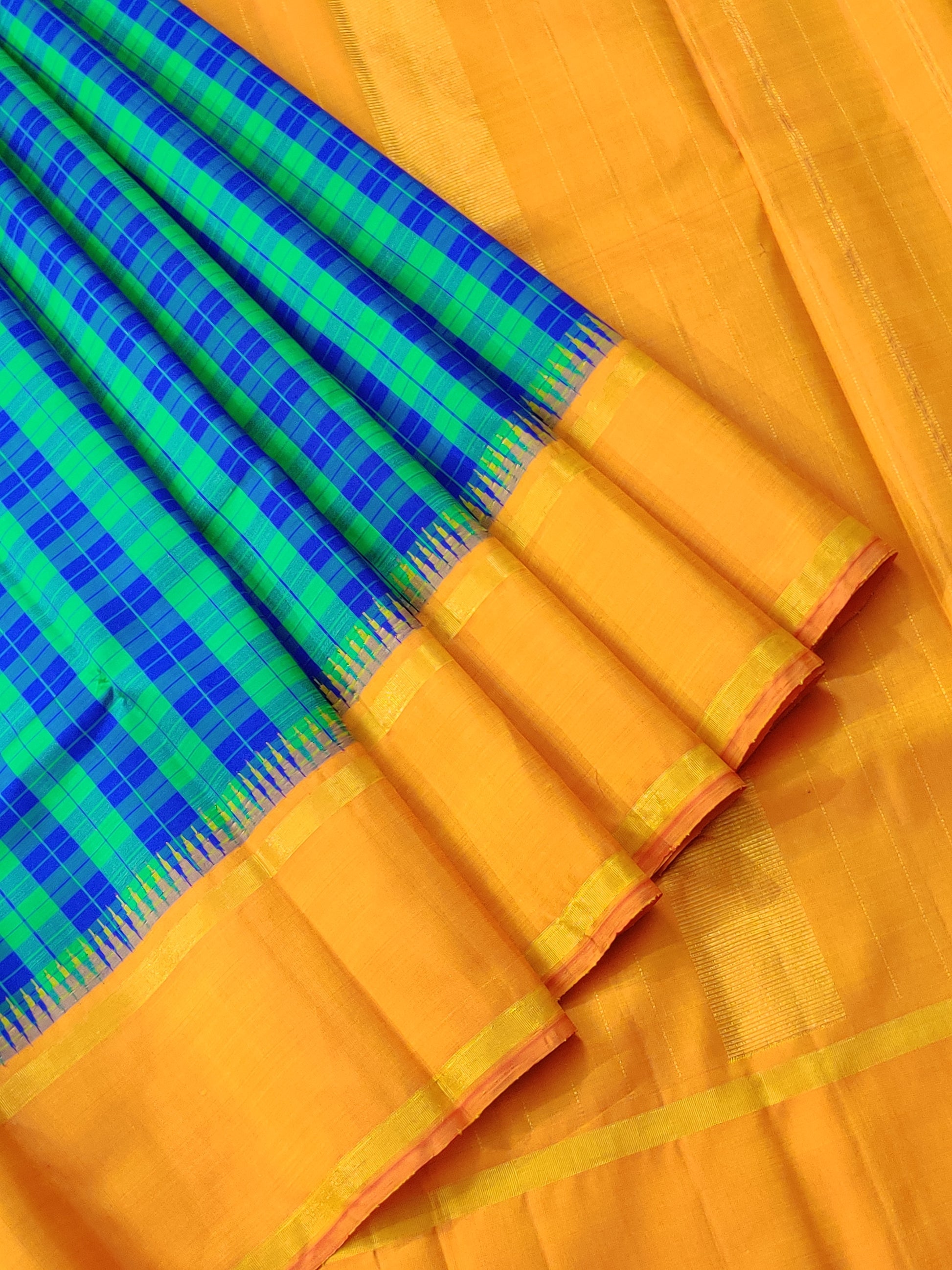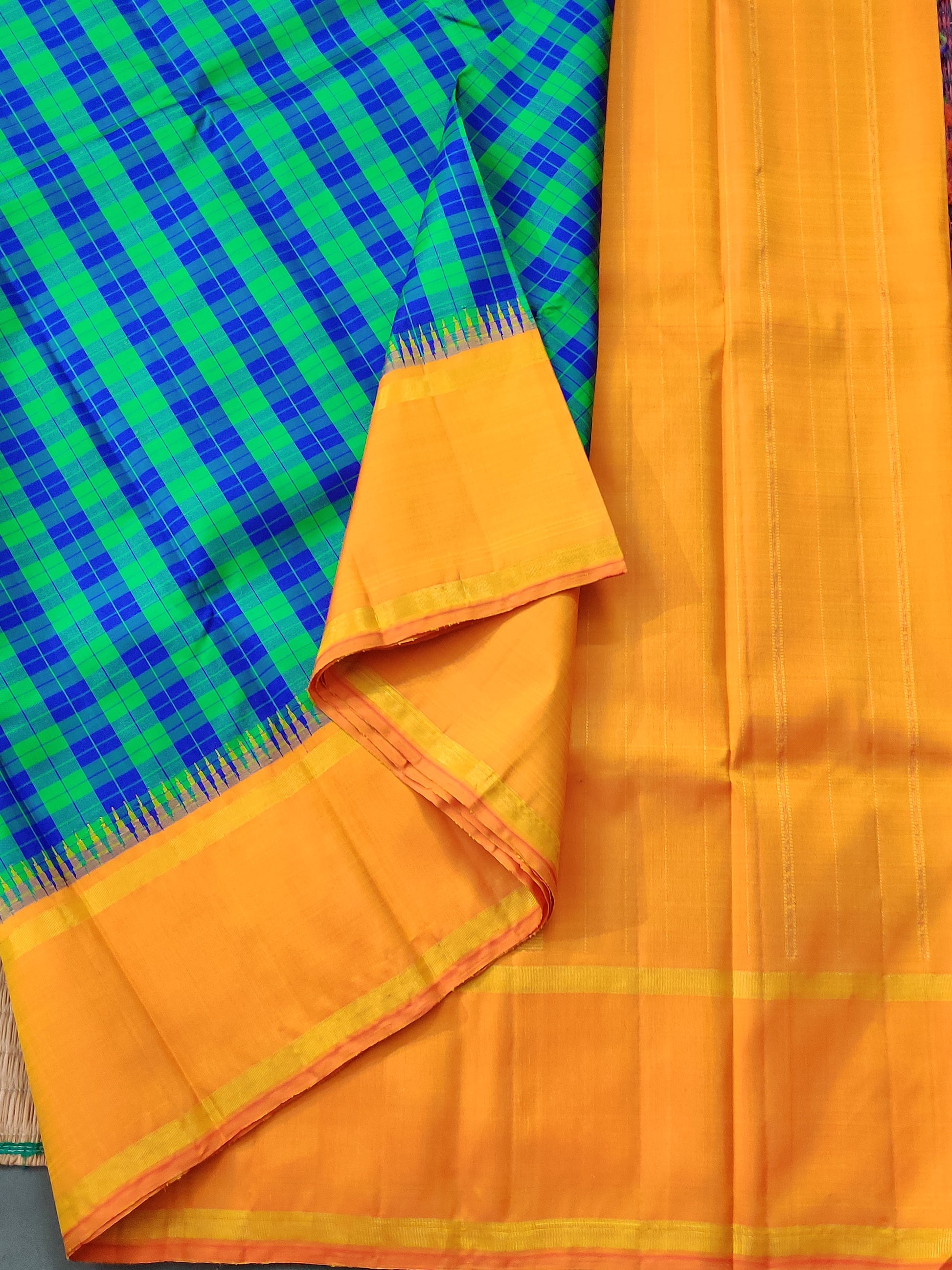 Elevate your ethnic wardrobe with this striking Kanchivaram silk saree, featuring a sophisticated interplay of green and blue checks throughout the fabric. The vibrant yellow contrast border and intricately embellished zari pallu add a touch of opulence, making it ideal for festive occasions and celebrations. Crafted from premium silk, this saree drapes beautifully and offers exceptional comfort. The accompanying plain blouse provides versatility, allowing you to style it with your preferred blouse designs. A timeless investment piece that seamlessly blends traditional craftsmanship with contemporary aesthetics.