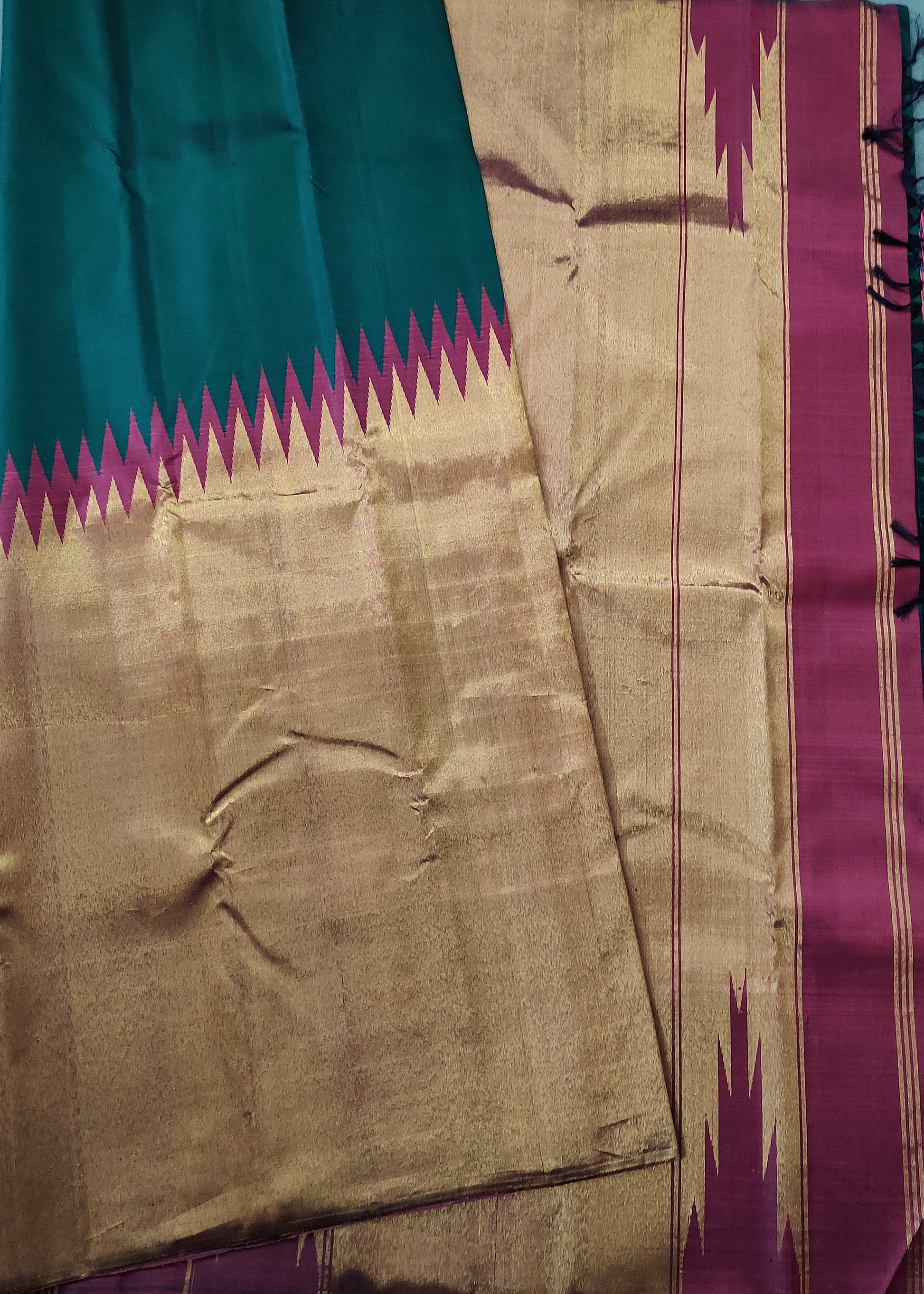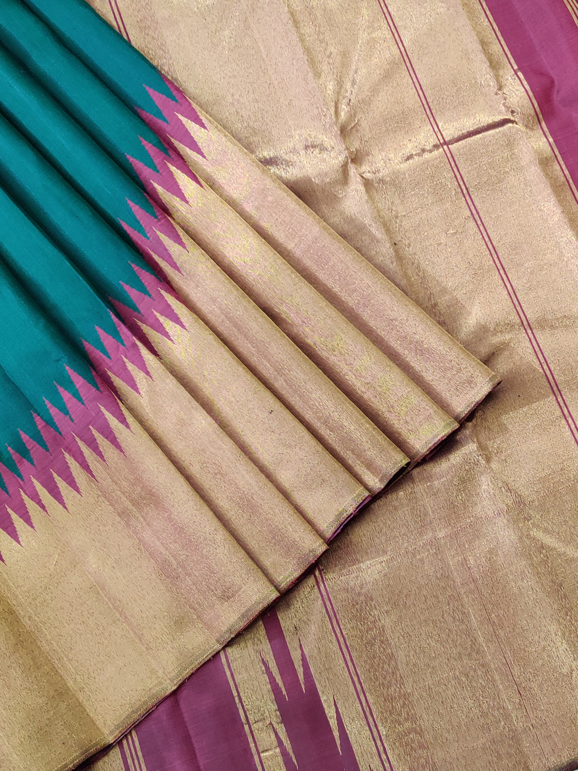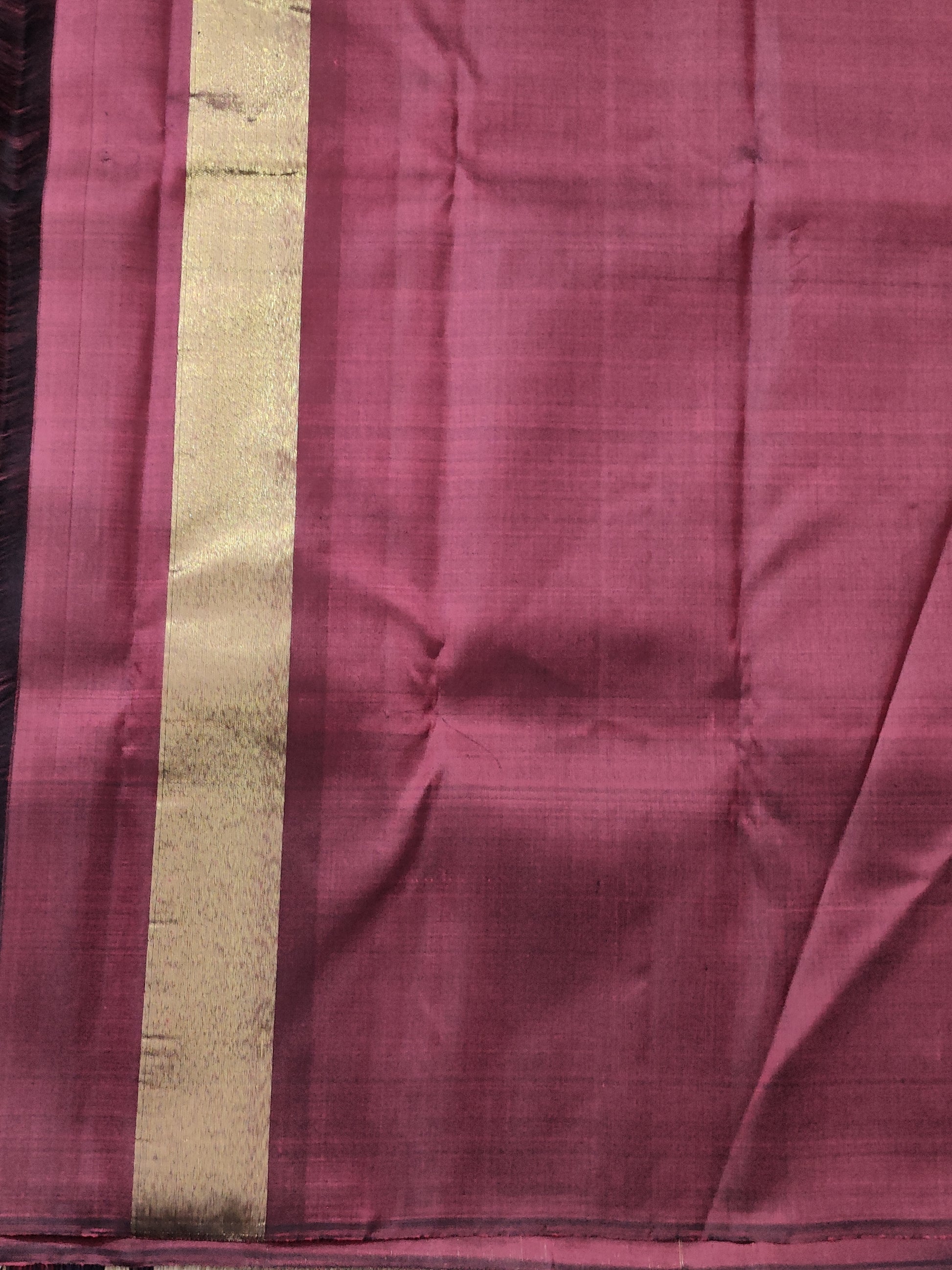 Elevate your ethnic wardrobe with this exquisite Kanchivaram silk saree in a sophisticated green hue. Crafted from premium silk, the saree features a gracefully plain body that exudes understated elegance, complemented by a striking maroon zari pallu that adds a bold contrast. The intricate zari work on the pallu showcases traditional craftsmanship, while the plain blouse provides versatility for styling. Perfect for festive occasions, weddings, and celebrations, this timeless piece combines classic Kanchivaram weaving techniques with contemporary design sensibilities. An investment in authentic South Indian silk tradition.